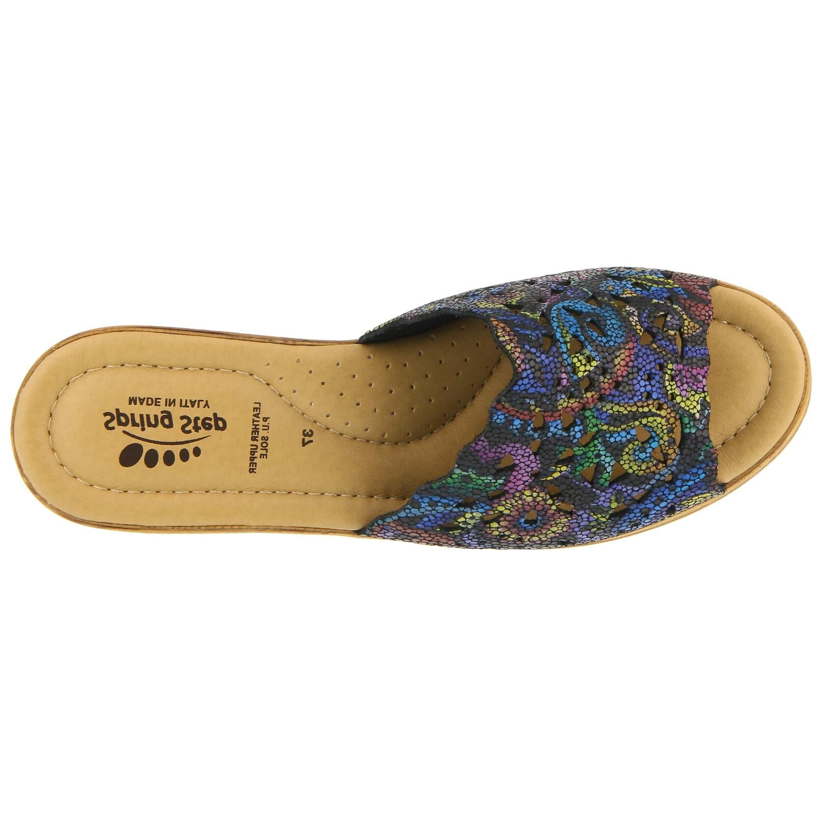 Step into effortless elegance with the Spring Step Estella wedge slide sandals. Designed in Italy with attention to detail and quality craftsmanship, these sandals feature a striking geometric laser-cut upper made from luxurious Italian nubuck leather. The breathable, open design paired with a soft padded insole ensures all-day comfort, while the cork-inspired textured wedge adds just the right touch of natural charm and lift. Whether the user is headed to brunch, strolling through a weekend market, or enjoying an evening out, the Estella sandals effortlessly elevate any outfit. Slip them on with wide-leg jeans and a breezy blouse for an easy-going, stylish look. Features: Soft, supple, and stylish with intricate geometric laser-cut designs. A chic wedge heel (1 ") with a " platform for the perfect blend of style. Synthetic leather padded insole provides cushioned support with every step. Durable, flexible, and perfect polyurethane outsole for everyday wear. Crafted with care, these slides bring a touch of continental charm.