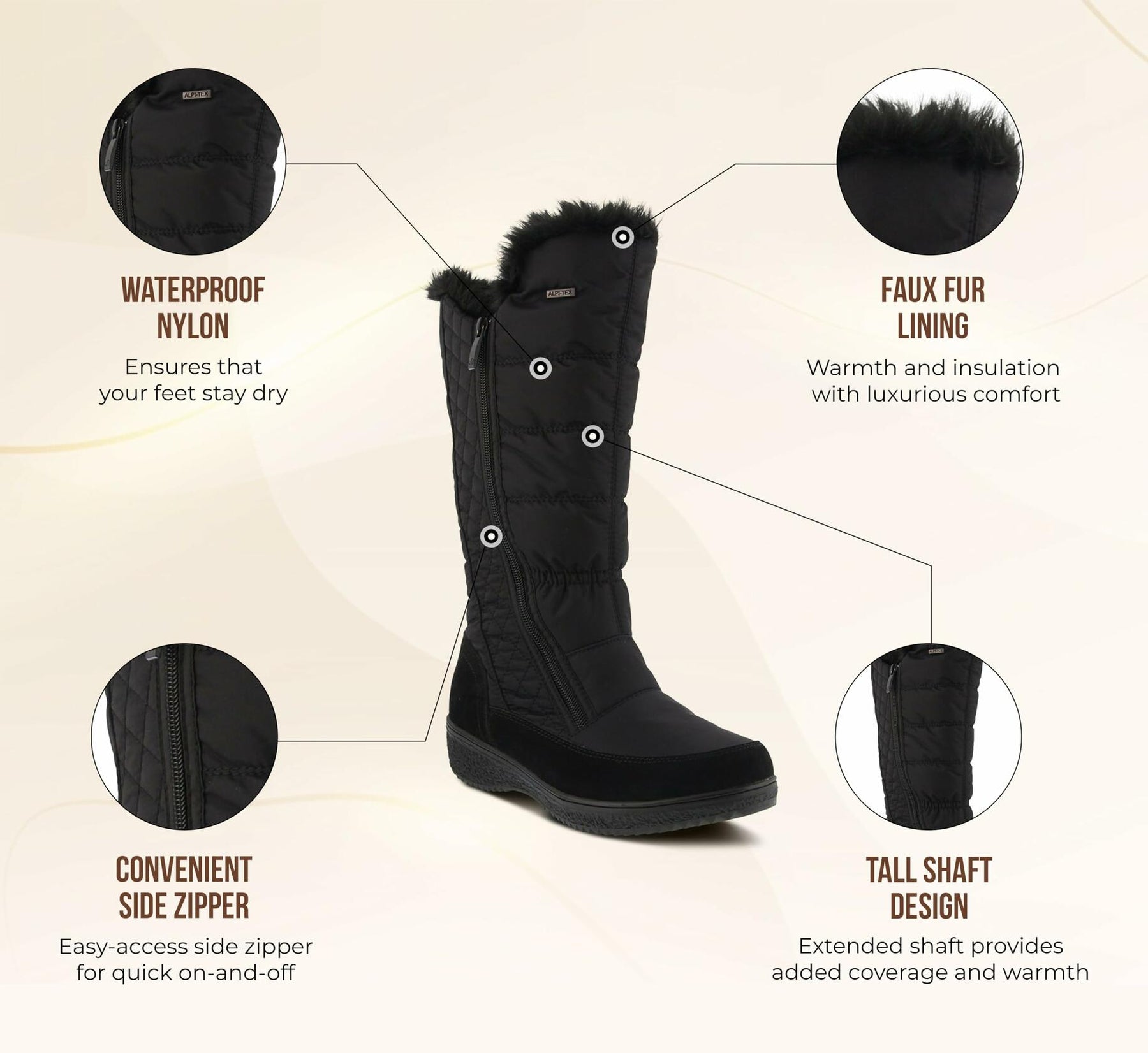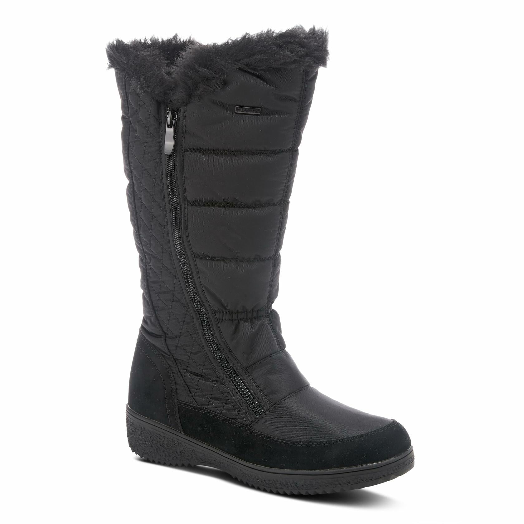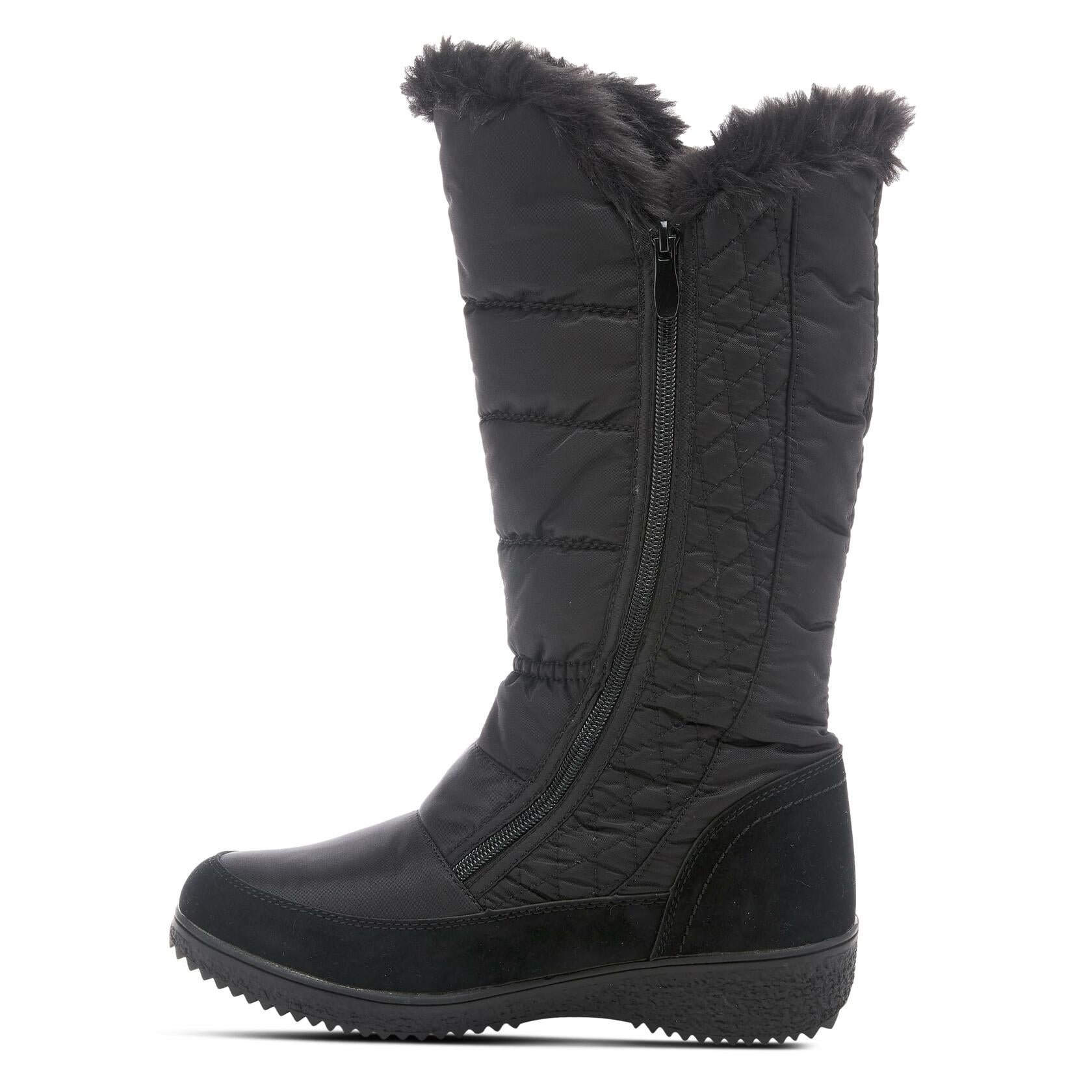 Flexus Style: Mireya Waterproof quilted nylon tall shaft winter boot with a side zipper. Heel Height (approximately): 1 1/2" Shaft Height (approximately): 13" Circumference (approximately): 15" Features: -Round toe, waterproof nylon. -Side zipper closure. -Faux fur lining. -Faux fur insole. -TPR outsole. -Imported.
