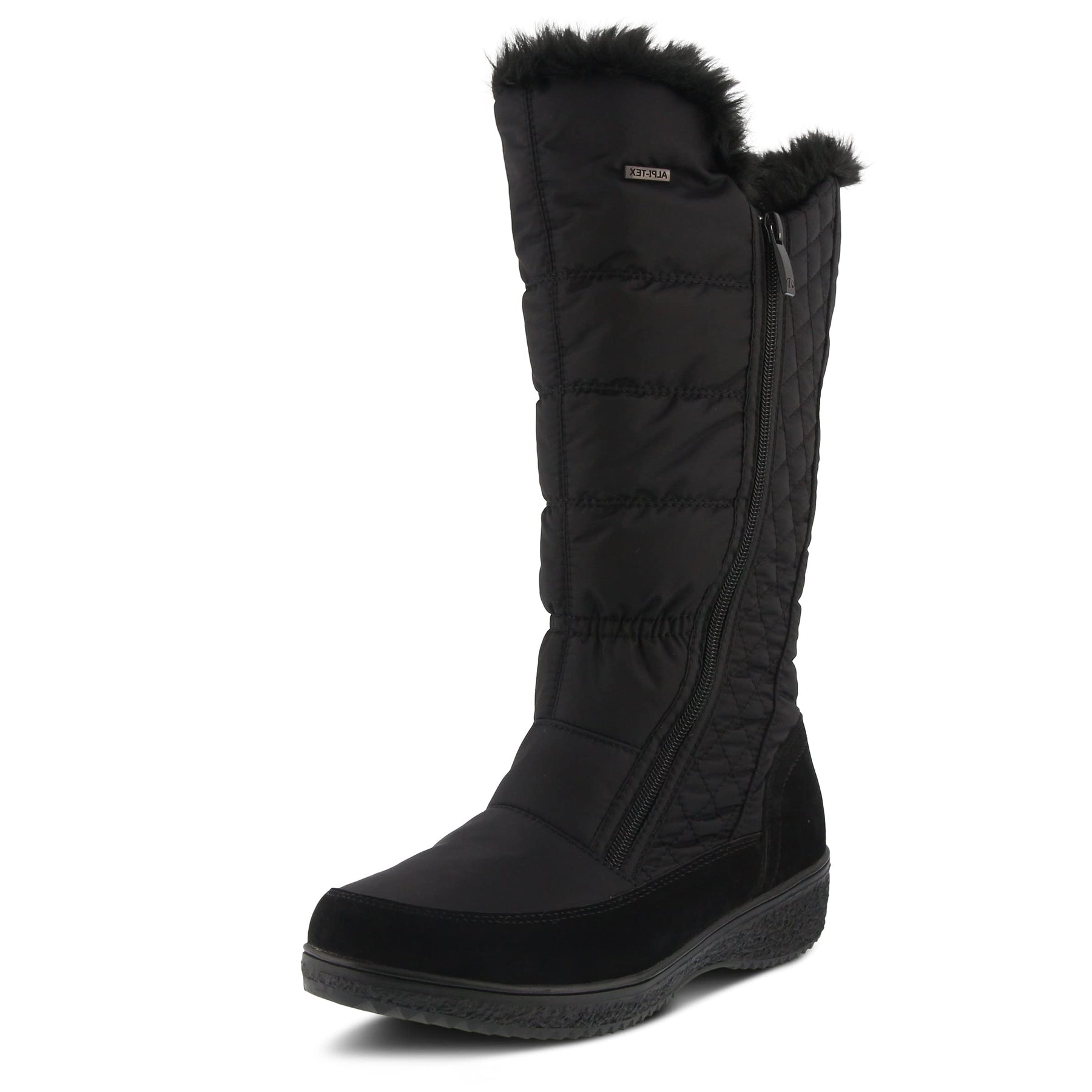 Flexus Style: Mireya Waterproof quilted nylon tall shaft winter boot with a side zipper. Heel Height (approximately): 1 1/2" Shaft Height (approximately): 13" Circumference (approximately): 15" Features: -Round toe, waterproof nylon. -Side zipper closure. -Faux fur lining. -Faux fur insole. -TPR outsole. -Imported.