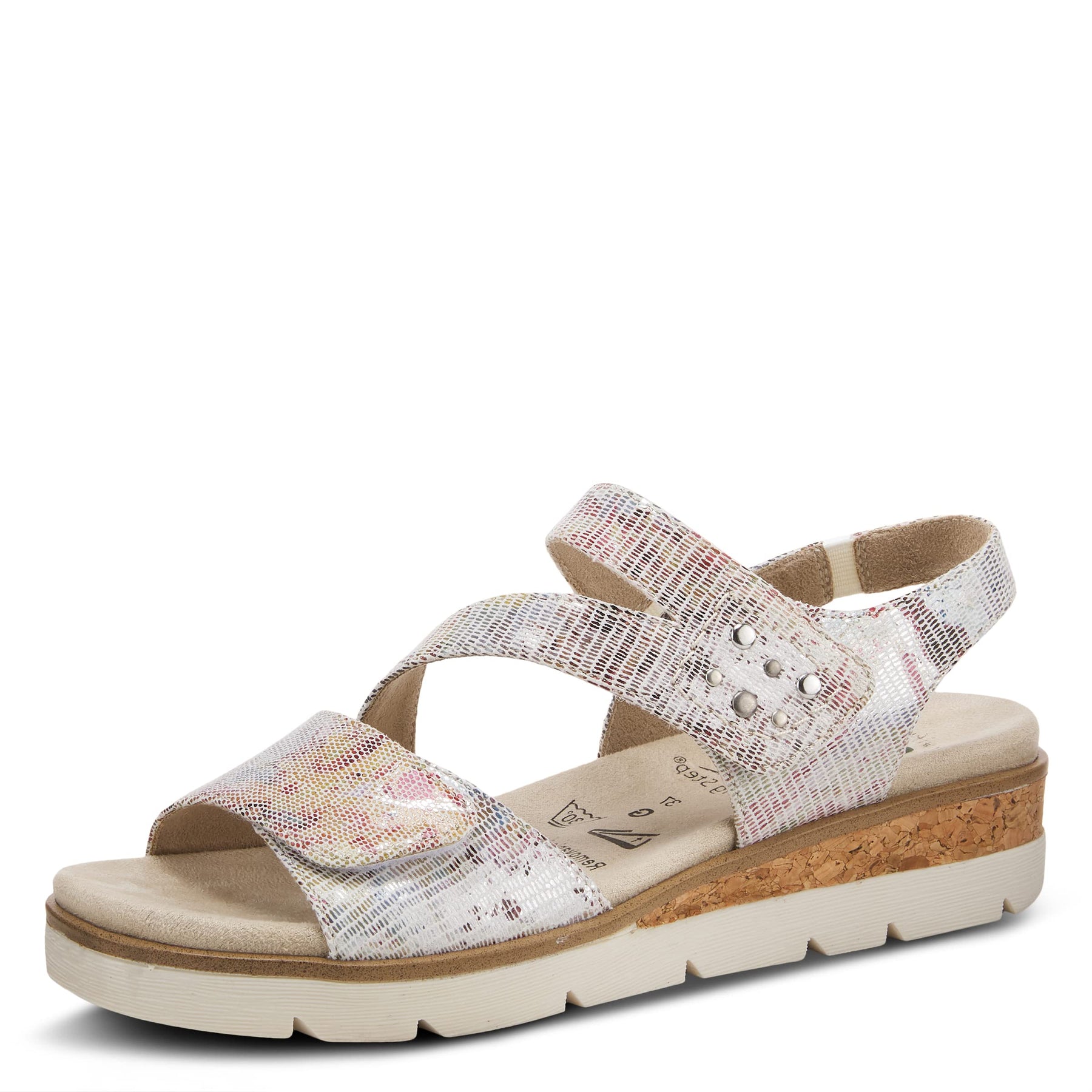 Spring Step Relife Style: HAYDENNIE Designed for sustainability, this functional vegan sandal is enhanced with an anatomical washable footbed, fashionable print for added style, hook and loop closure for a perfect fit. Comfortable cork wedge on a platform sole. Upper: Synthetic Lining: Textile Insole: Textile Outsole: TPR Closure: Hook&Loop Heel Height: 1 1/4" Platform Height: 1/2" Features: - Adjustable, Anatomic Insole, Arch Support, Comfort, Elastic, Footbed, Premium, Shock absorbent Outsole, Vegan Friendly, Sustainability, Washable Footbed