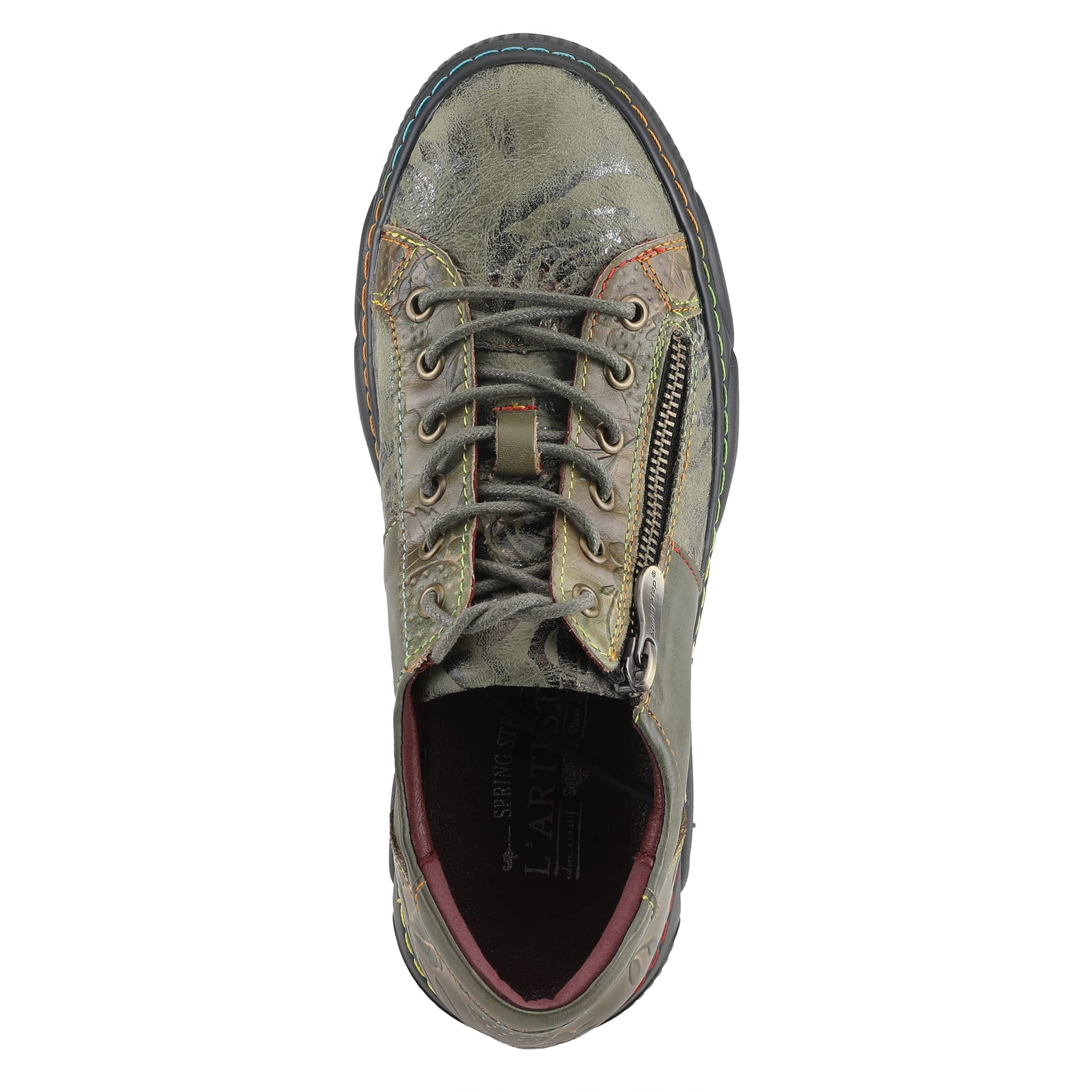 L`Artiste Style: Danli-Bloom French inspired zippered sneaker like casual, featuring premium leather, both hand-painted and embossed, with metallic rose printed textile accents. Adjustable metal eyelet lace-up closure with lace keeper, vibrant rainbow stitching, and a super padded comfort collar and removable footbed all on a flat, bear embossed sculpted flatform edged in rainbow stitching. Heel: 1 ΒΌ" Platform: 1 ΒΌ" Features: - Upper: Leather, Textile combination - Upper Finishing: Brushed, Embossed, Hand painted - Heel type: Flat, Platform - Lining: Synthetic Leather - Insole: Synthetic Leather - Outsole: Rubber - Toe type: Closed toe, Round toe - Patte: Floral, Solid, Multi colored - Closure: Lace-up, Zipper - Features: Adjustable, Comfort, Flexible Sole, Hand-painted, Padded Removable Insole, Premium Disclaimer: L'Artiste products are made with natural tanned leather using traditional hand painting techniques. This unique finishing process is used to create a natural effect with color variations to deliver authentic look and beauty.