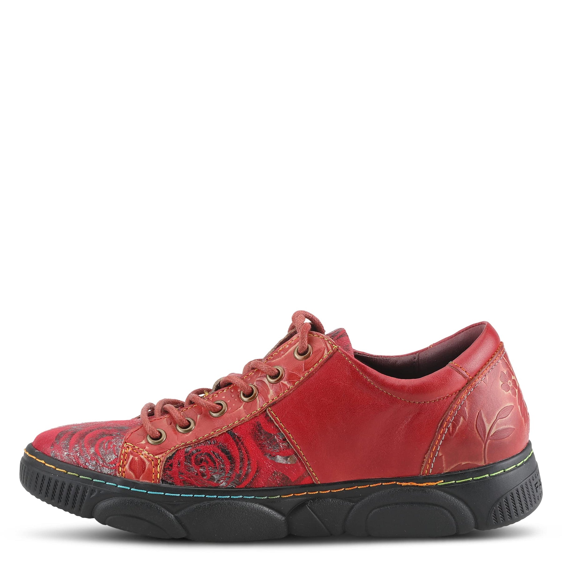 L`Artiste Style: Danli-Bloom French inspired zippered sneaker like casual, featuring premium leather, both hand-painted and embossed, with metallic rose printed textile accents. Adjustable metal eyelet lace-up closure with lace keeper, vibrant rainbow stitching, and a super padded comfort collar and removable footbed all on a flat, bear embossed sculpted flatform edged in rainbow stitching. Heel: 1 " Platform: 1 " Features: - Upper: Leather, Textile combination - Upper Finishing: Brushed, Embossed, Hand painted - Heel type: Flat, Platform - Lining: Synthetic Leather - Insole: Synthetic Leather - Outsole: Rubber - Toe type: Closed toe, Round toe - Patte: Floral, Solid, Multi colored - Closure: Lace-up, Zipper - Features: Adjustable, Comfort, Flexible Sole, Hand-painted, Padded Removable Insole, Premium Disclaimer: L'Artiste products are made with natural tanned leather using traditional hand painting techniques. This unique finishing process is used to create a natural effect with color variations to deliver authentic look and beauty.