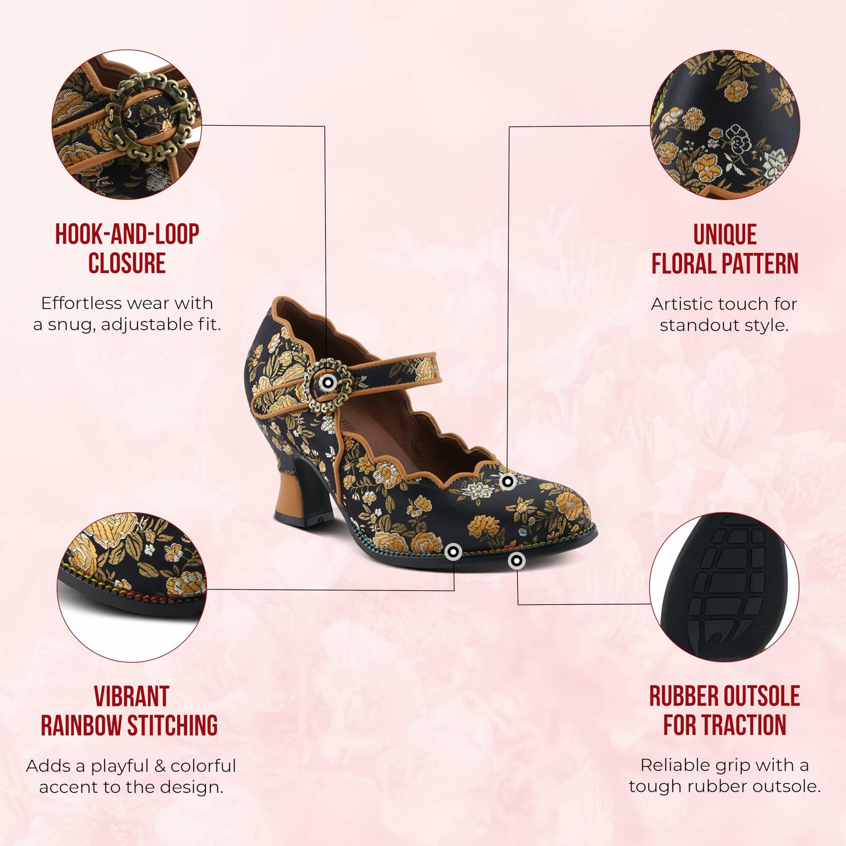 L'ARTISTE Style: ADODORA These heeled Mary Janes are the epitome of elegance and sophistication with their stunning tapestry floral pattern. The hook and loop closure, along with the decorative buckle, adds a touch of charm and practicality to these beautiful shoes. With their low heel and scalloped edges, they are the perfect choice for any occasion where style and comfort are a must. Upper: Synthetic, Textile Lining: Synthetic, Textile, Velvet Insole: Synthetic, Textile Outsole: Rubber Closure: Hook&Loop Heel Height: 2 1/2" Features: - Comfort, Flexible Sole - Padded Insole, Premium Fit Recommendation: True to Size Disclaimer: LArtiste products are made with natural tanned leather using traditional hand painting techniques. This unique finishing process is used to create a natural effect with color variations to deliver authentic look and beauty.