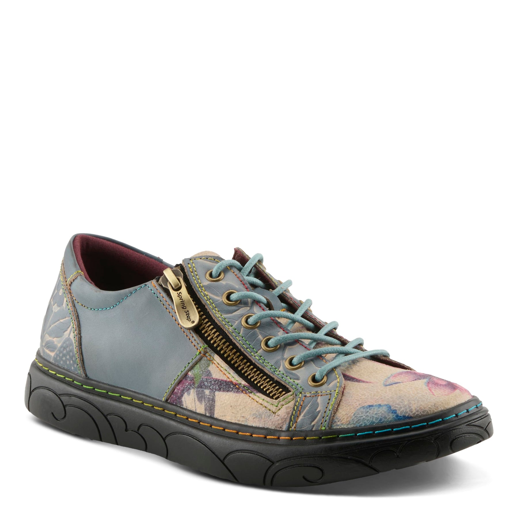 L`Artiste Style: Danli-Bloom French inspired zippered sneaker like casual, featuring premium leather, both hand-painted and embossed, with metallic rose printed textile accents. Adjustable metal eyelet lace-up closure with lace keeper, vibrant rainbow stitching, and a super padded comfort collar and removable footbed all on a flat, bear embossed sculpted flatform edged in rainbow stitching. Heel: 1 " Platform: 1 " Features: - Upper: Leather, Textile combination - Upper Finishing: Brushed, Embossed, Hand painted - Heel type: Flat, Platform - Lining: Synthetic Leather - Insole: Synthetic Leather - Outsole: Rubber - Toe type: Closed toe, Round toe - Pattern: Floral, Solid, Multi colored - Closure: Lace-up, Zipper - Features: Adjustable, Comfort, Flexible Sole, Hand-painted, Padded Removable Insole, Premium Disclaimer: L'Artiste products are made with natural tanned leather using traditional hand painting techniques. This unique finishing process is used to create a natural effect with color variations to deliver authentic look and beauty.