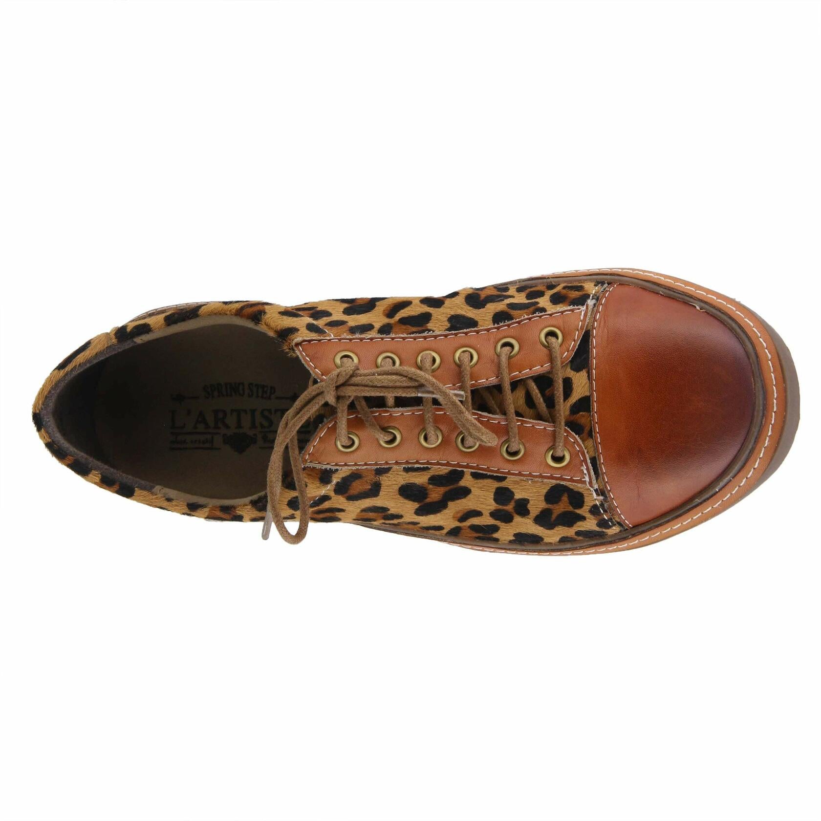 L'Artiste Style: Libbi-Leopard Modern Day Casual, extended facing six (6) eyelet lace up featuring rich full grain burnished polished leather and leopard print hair-on-hide, comfortable padded collar, fashionable and flexible rubber outsole with leather contrast stitched inlay. Heel Height (approximately): 1 1/4" Platform Height (approximately): 1" Features: - Rich full grain burnished polished leather and leopard print hair-on-hide -Fashionable and sporty round toe -Lace up with extended facings and six (6) antique finish eyelet and round wax cotton lace -Soft synthetic leather linings -Soft synthetic leather and removable memory foam insole -Unique fashionable designed flexible rubber outsole with self-leather stitched inlay -Imported Disclaimer: L'Artiste products are made with natural tanned leather using traditional hand painting techniques. This unique finishing process is used to create a natural effect with color variations to deliver authentic look and beauty.
