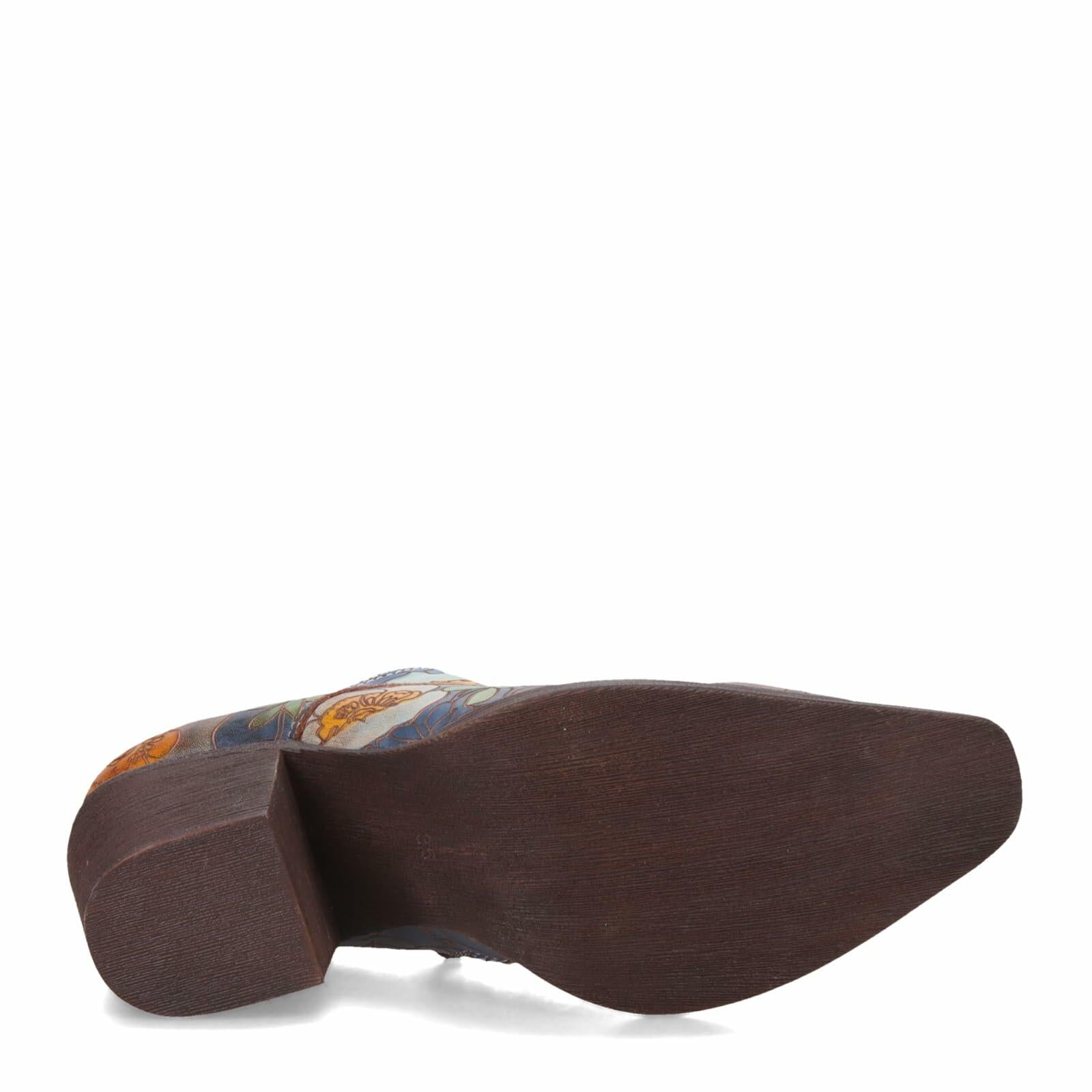 L'ARTISTE Style: ROCKINLORNA The slip-on shootie is a trendy shoe that incorporates both convenience and style. This design boasts a stunning abstract geometric hand-painted floral patte that covers the upper portion of the shoe, while the toe box has a brushed and buished finish. The shoes lace-up and zipper closure ensures a secure fit for the wearer. Upper: Leather, Suede Lining: Microsuede Insole: Microsuede Outsole: Polyurethane, Rubber Closure: Lace-up, Zipper Heel Height: 2 1/2" Features: - Comfort, Flexible Sole - Hand-painted, Padded Insole, Premium Fit Recommendation: True to Size Disclaimer: LArtiste products are made with natural tanned leather using traditional hand painting techniques. This unique finishing process is used to create a natural effect with color variations to deliver authentic look and beauty.