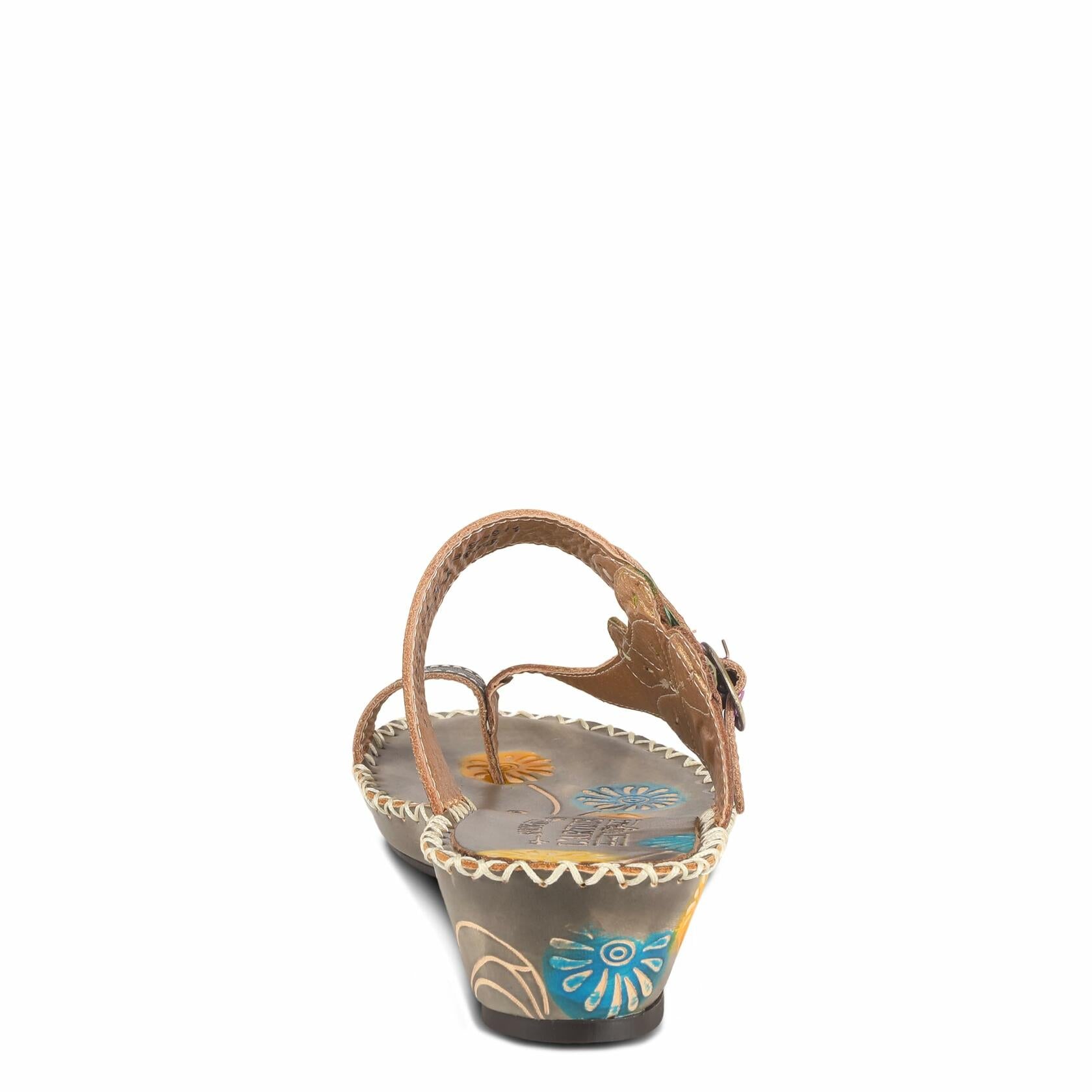 L'Artiste Style: Santorini French inspired design, hand painted leather toe-ring thong sandal featuring a jeweled tear drop stones and a floral embossed insole. Heel Height (approximately): 2 1/2", 3/4" platform. Features: -Hand painted leather, contrast stitch detailing, leather wrapped embossed insole, antiqued gold buckle. -Adjustable strap with buckle closure. -Synthetic leather lining. -Synthetic leather padded insole. -Rubber outsole. -Imported. Disclaimer: LArtiste products are made with natural tanned leather using traditional hand painting techniques. This unique finishing process is used to create a natural effect with color variations to deliver authentic look and beauty.