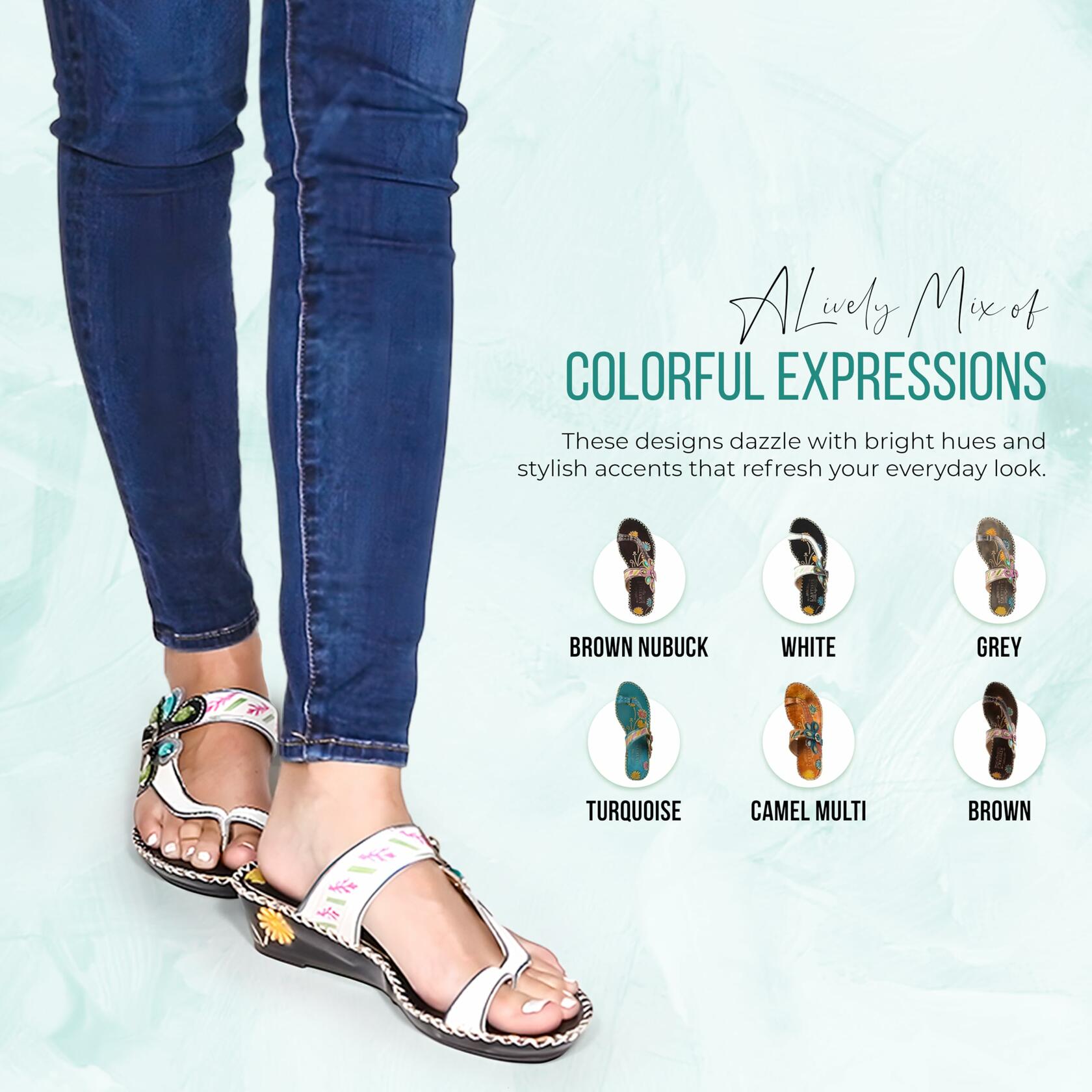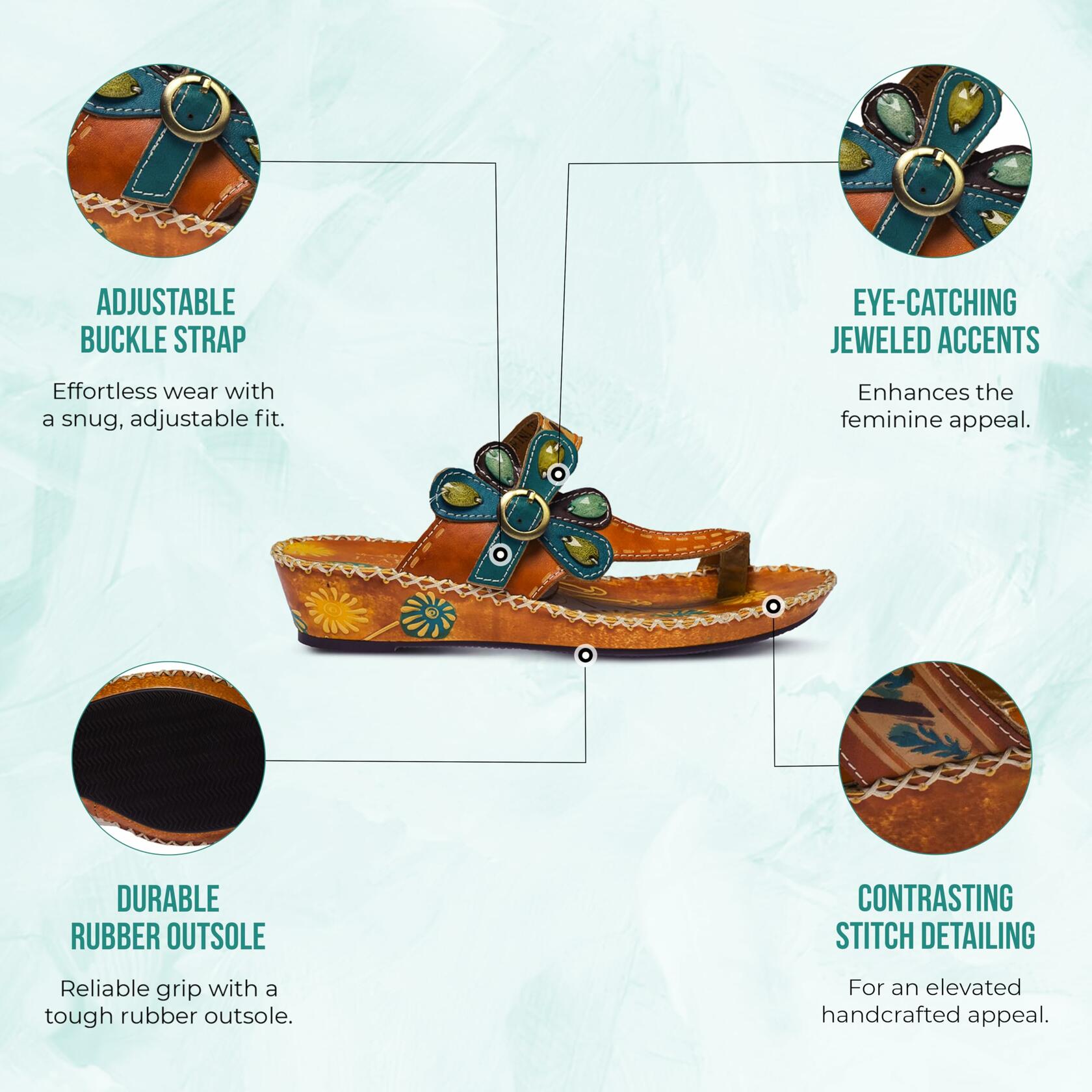 L'Artiste Style: Santorini French inspired design, hand painted leather toe-ring thong sandal featuring a jeweled tear drop stones and a floral embossed insole. Heel Height (approximately): 2 1/2", 3/4" platform. Features: -Hand painted leather, contrast stitch detailing, leather wrapped embossed insole, antiqued gold buckle. -Adjustable strap with buckle closure. -Synthetic leather lining. -Synthetic leather padded insole. -Rubber outsole. -Imported. Disclaimer: LArtiste products are made with natural tanned leather using traditional hand painting techniques. This unique finishing process is used to create a natural effect with color variations to deliver authentic look and beauty.
