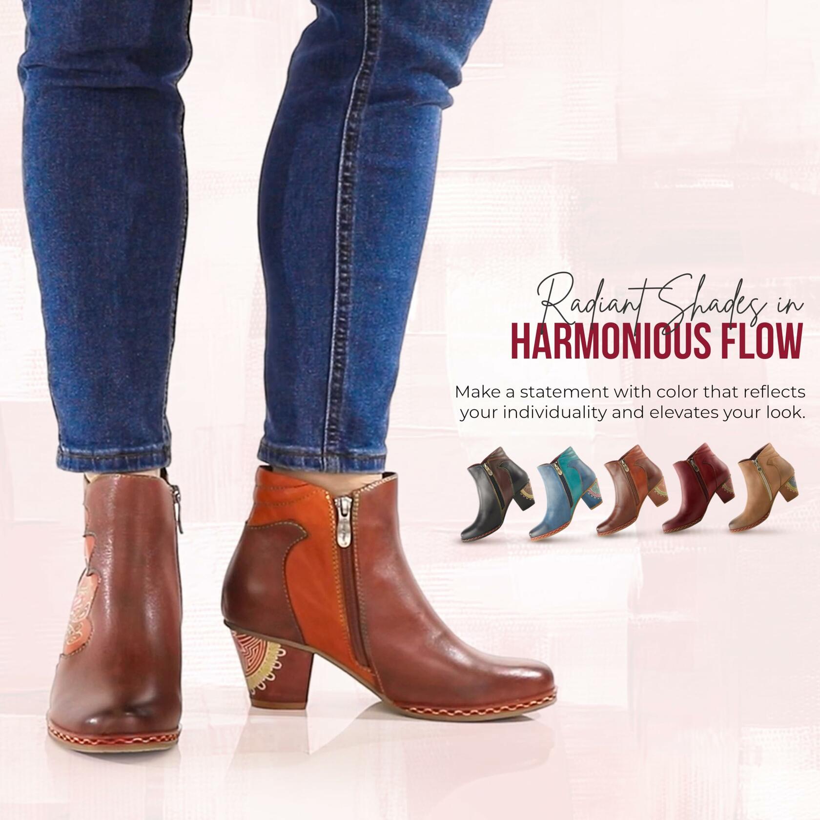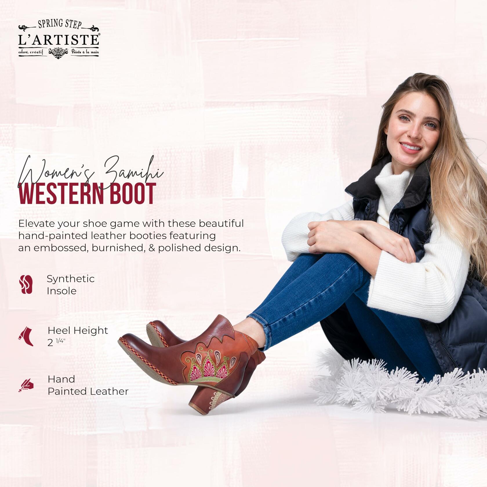 Our Spring Step LArtiste Womens Zamihi Western Boots are a stunning blend of artisanal artistry and modern western style. The hand-painted leather upper features burnished and polished finishes that create unique, natural color variations, ensuring each pair is distinctively beautiful. The boot design includes an inside full-length zipper with a brushed metal pull tab, allowing easy on-and-off wear while maintaining a sleek look. The padded topline cushions your ankles, enhancing comfort, while the synthetic and textile padded insole and flexible sole provide all-day support and ease of movement. The premium textured leather is complemented by a hand-painted leather-covered heel, blending western tradition with contemporary craftsmanship. Durable synthetic lining and rubber outsole provide reliable traction and lasting wear. The boots fit true to size with an approximately 5 inch shaft height and 9 inch circumference for a flattering fit. The 2 inch heel offers a comfortable height that lifts you without sacrificing stability. This boot is perfect for elevating your casual or dressed-up looks with unique style and unmatched comfort. FEATURES: Hand-painted leather upper Inside full-length zipper Padded topline for comfort Flexible sole for movement Textured leather design Synthetic lining and insole Durable rubber outsole Approx. 2 inch heel height Shaft height approx. 5 inches True to size fit