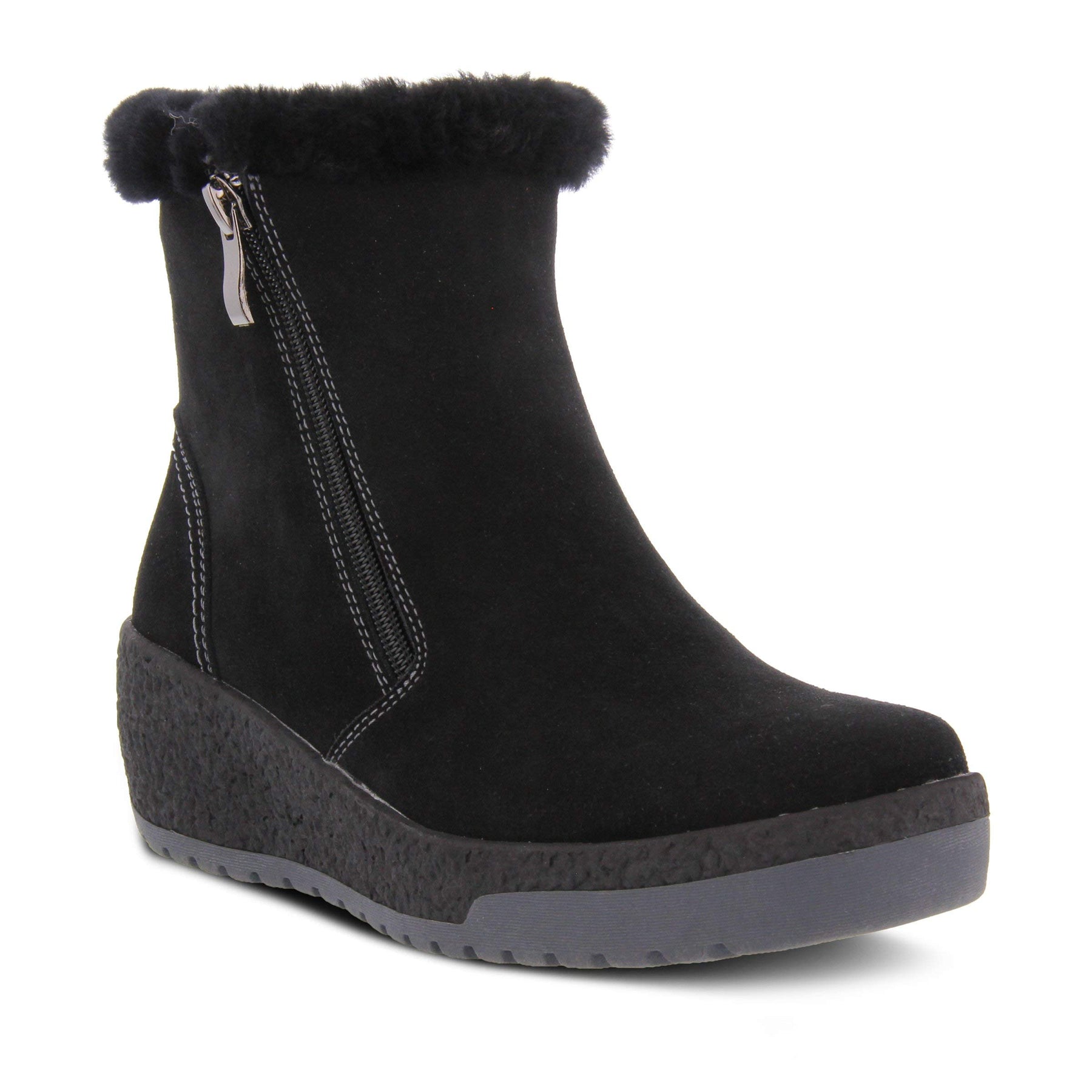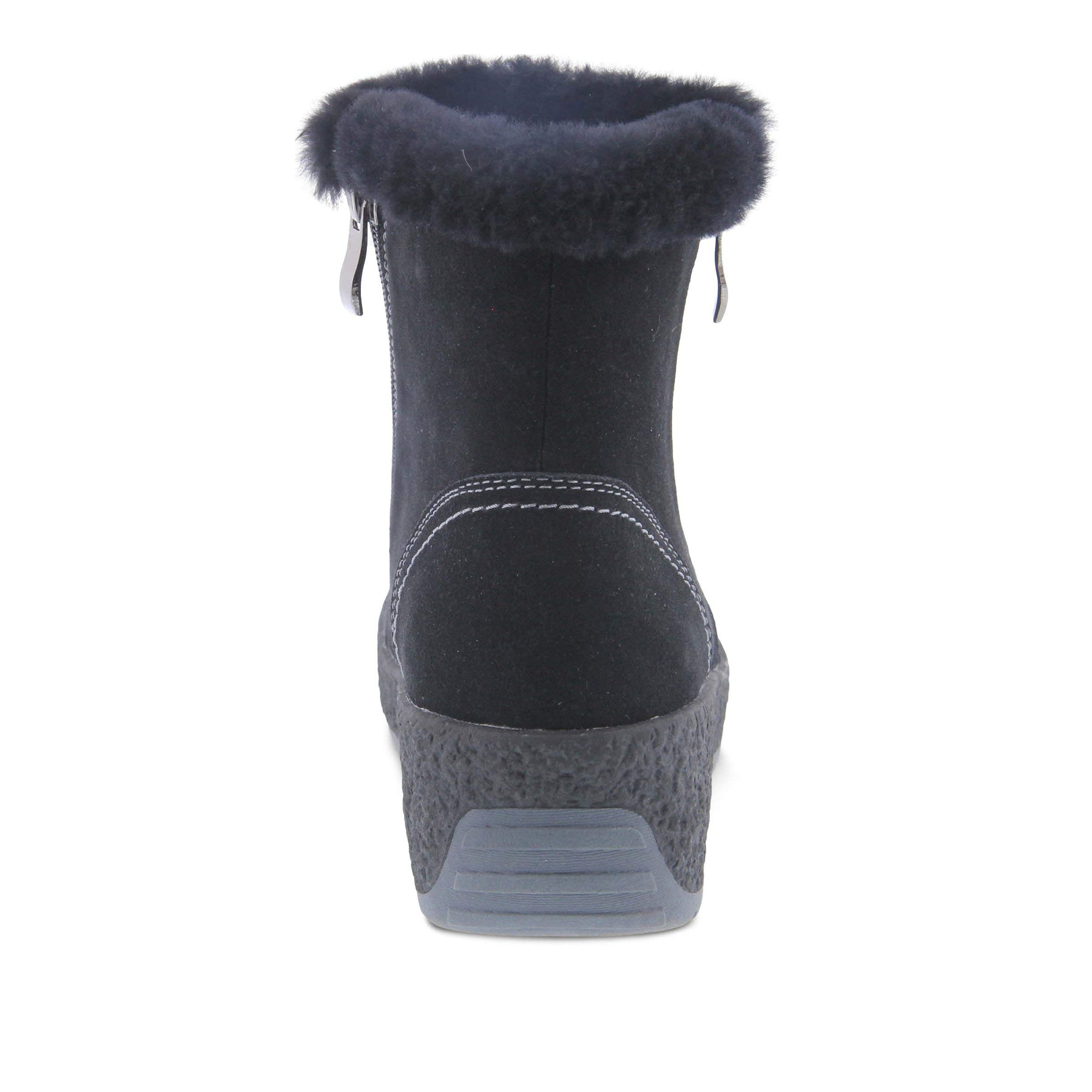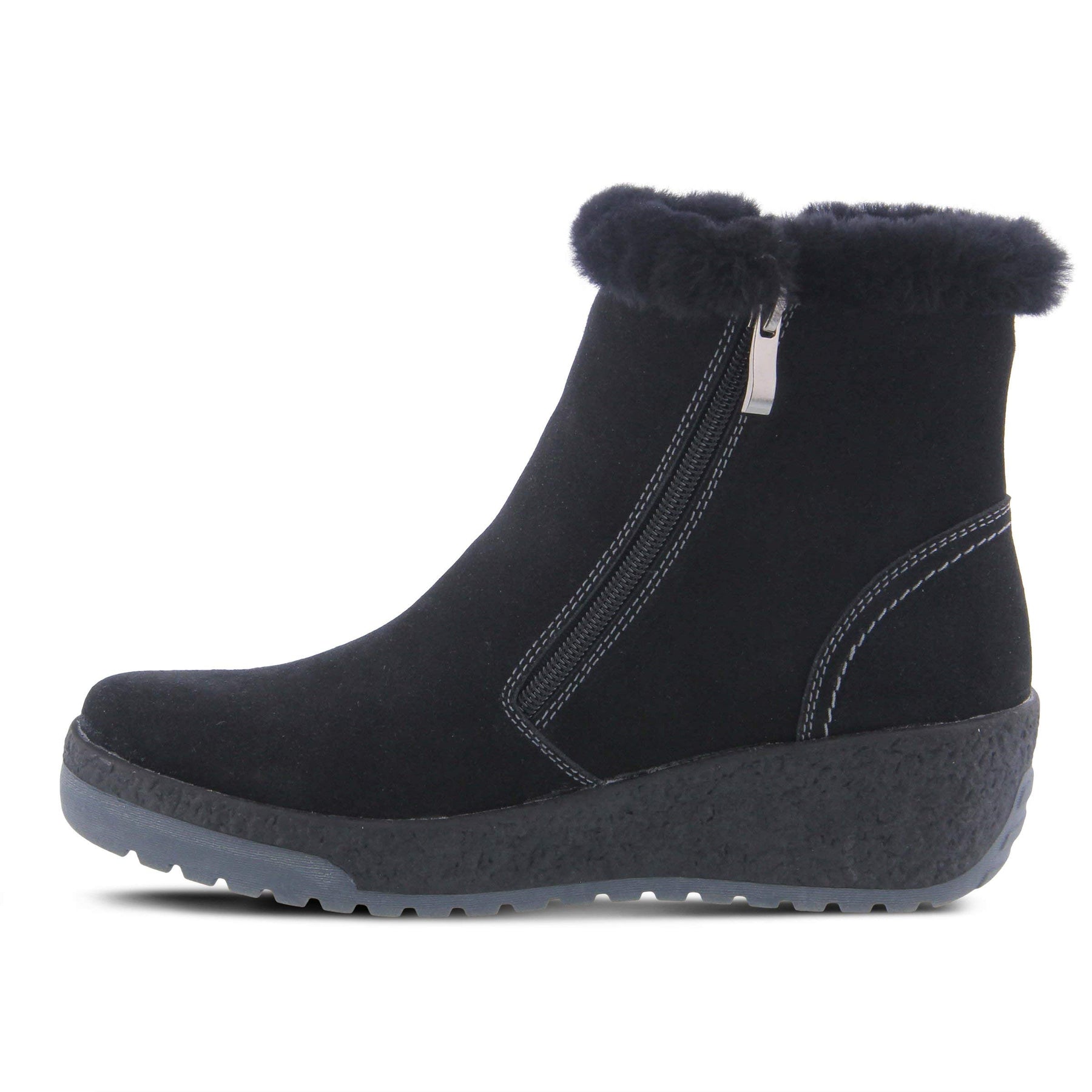 Spring Step Style: Lambi Traditional and fashionable water resistant leather or suede leather pull-on bootie featuring a dual side zipper design and faux fur trim detail all on a textured rubber outsole. Heel Height (approximately): 2" Platform Height (approximately): 1" Back Shaft Height (approximately): 4 1/4" Circumference (approximately): 9 1/2" Features: -Premium water resistant leather or suede leather, round toe silhouette, tonal stitching, two-tone wedge outsole. -Full length dual side zippers with a gun metal zipper pulls. -Super soft and cozy faux fur lining. -Soft and cozy comfort padded and removable faux fur insole. -TPR outsole with flexible forefoot. -Imported.