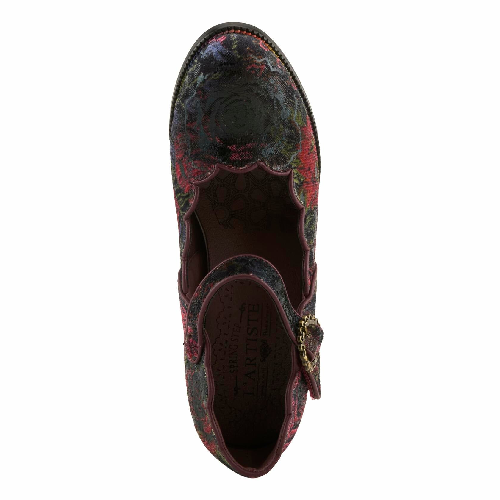 Indulge in vintage-inspired elegance with the L'Artiste Adodora-Prit Mary Jane Pumps, a stunning baroque-style design that blends whimsy with sophistication. Crafted with a luxurious velvet and leather combo upper, these heels feature an artistic mix of colors, textures, and scalloped edges for a truly one-of-a-kind look. The ornate antique-style buckle complements the adjustable hook-and-loop closure, ensuring both style and convenience. A modest, sculpted heel provides a graceful lift while ensuring all-day comfort. Whether youre dressing up for a special occasion or adding a bold, artistic touch to everyday wear, these heels are a wearable masterpiece for the modern trendsetter.
