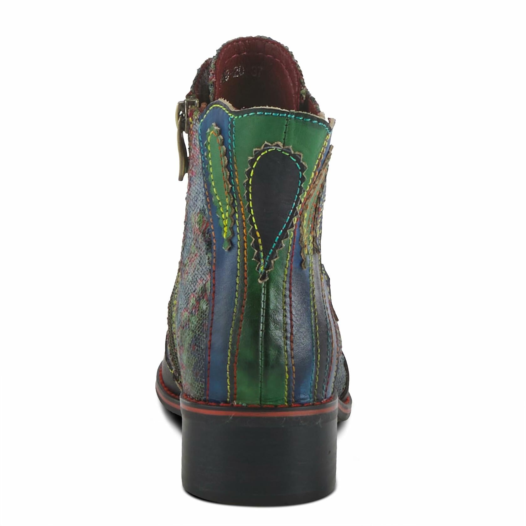 L'ARTISTE Style: BENATAR This lace-up and zipper boot combines both style and functionality with its unique design. The back of the shoe features an intricate laser-cut applique design, while the front is brushed and burnished, adding a touch of spice. The iridescent upper and rainbow stitching add a pop of color, making this boot a statement piece that can be dressed up or down. Upper: Leather, Textile Lining: Textile, Velvet Insole: Synthetic Outsole: Rubber Closure: Lace-up, Zipper Heel Height: 1 1/2" Shaft Height: 5 1/2" Circumference: 9-9 3/4" Features: - Comfort, Flexible Sole - Hand-painted, Padded Insole, Premium, Textured Fit Recommendation: True to Size Disclaimer: LArtiste products are made with natural tanned leather using traditional hand painting techniques. This unique finishing process is used to create a natural effect with color variations to deliver authentic look and beauty.