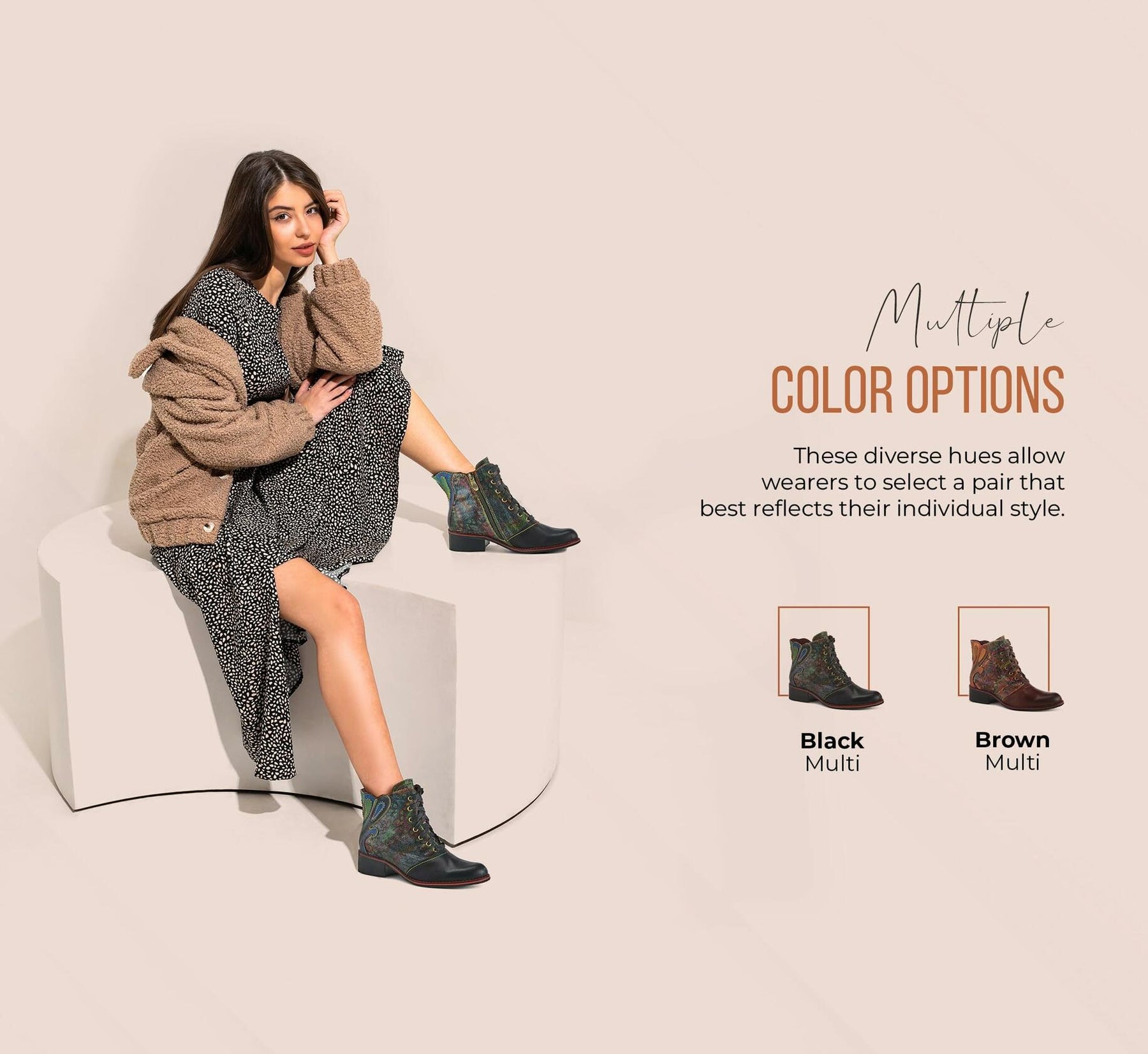 L'ARTISTE Style: BENATAR This lace-up and zipper boot combines both style and functionality with its unique design. The back of the shoe features an intricate laser-cut applique design, while the front is brushed and burnished, adding a touch of spice. The iridescent upper and rainbow stitching add a pop of color, making this boot a statement piece that can be dressed up or down. Upper: Leather, Textile Lining: Textile, Velvet Insole: Synthetic Outsole: Rubber Closure: Lace-up, Zipper Heel Height: 1 1/2" Shaft Height: 5 1/2" Circumference: 9-9 3/4" Features: - Comfort, Flexible Sole - Hand-painted, Padded Insole, Premium, Textured Fit Recommendation: True to Size Disclaimer: LArtiste products are made with natural tanned leather using traditional hand painting techniques. This unique finishing process is used to create a natural effect with color variations to deliver authentic look and beauty.