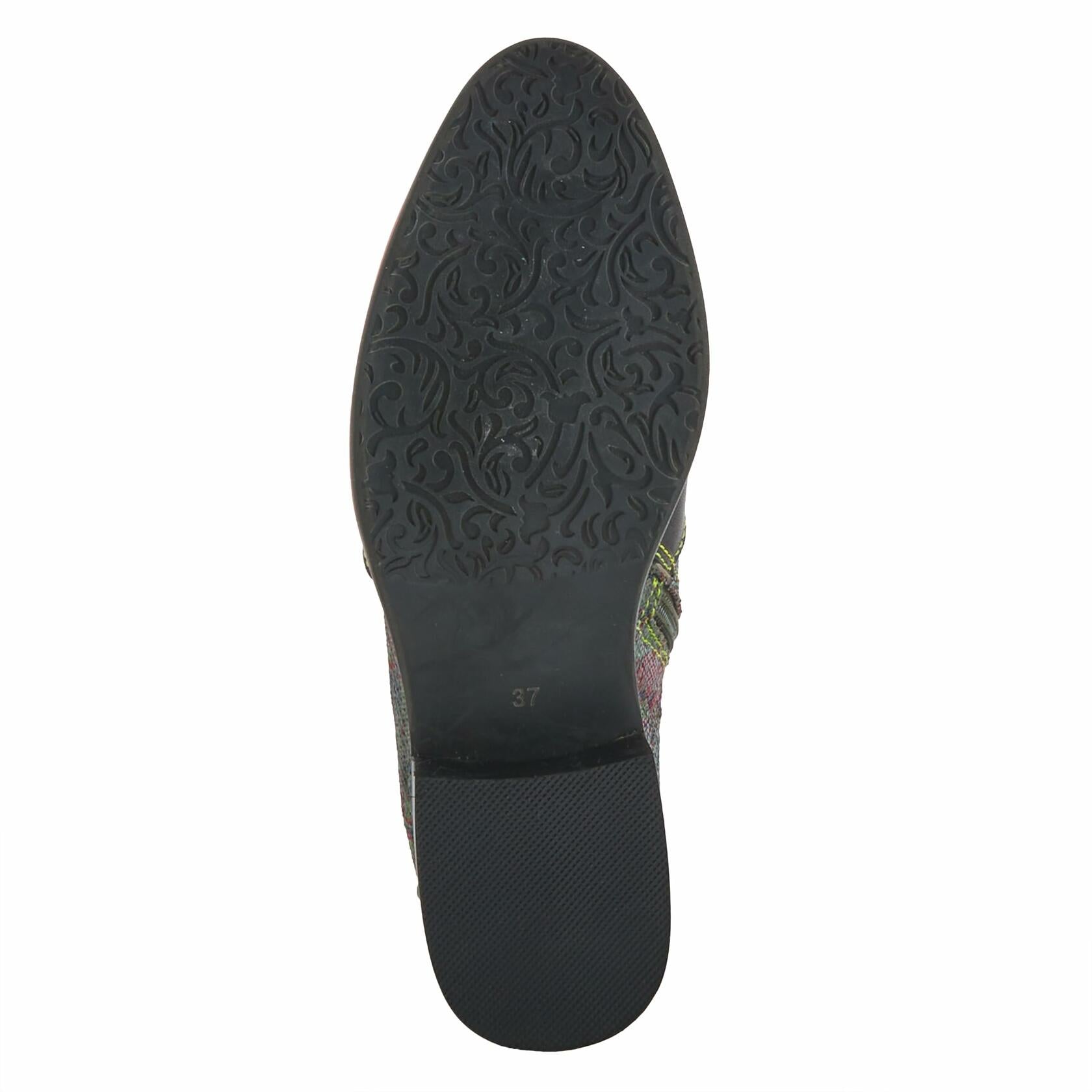 L'ARTISTE Style: BENATAR This lace-up and zipper boot combines both style and functionality with its unique design. The back of the shoe features an intricate laser-cut applique design, while the front is brushed and burnished, adding a touch of spice. The iridescent upper and rainbow stitching add a pop of color, making this boot a statement piece that can be dressed up or down. Upper: Leather, Textile Lining: Textile, Velvet Insole: Synthetic Outsole: Rubber Closure: Lace-up, Zipper Heel Height: 1 1/2" Shaft Height: 5 1/2" Circumference: 9-9 3/4" Features: - Comfort, Flexible Sole - Hand-painted, Padded Insole, Premium, Textured Fit Recommendation: True to Size Disclaimer: L’Artiste products are made with natural tanned leather using traditional hand painting techniques. This unique finishing process is used to create a natural effect with color variations to deliver authentic look and beauty.