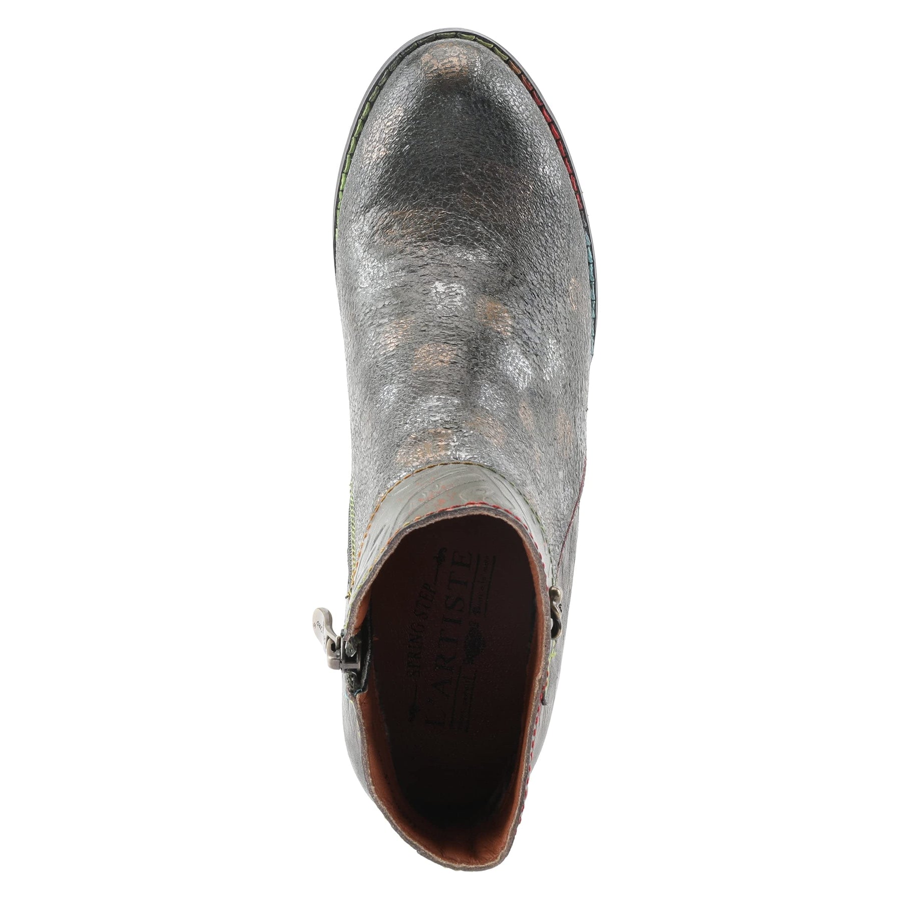 Spring Step Style: Bestlove; Subtle all-over metallic brush strokes on the front rough-out leather upper, with whispie lightning strike highs and lows on a smooth man made back. Sexy double inside and out dipped embossed leather collar, with inside zipper and outside antiqued brass Pansy floral embellishment. Signature L'Artiste rainbow stitching, stacked leather edged all day comfort pyramid heel, silky printed velvet lining with extra cushiony comfort footbeds. Features: 1. High quality combination leather and PU uppers. 2. Combination textured metallic rough-out leather and lightning effect smooth PU bootie with a leather embossed sexy dipped in and out collar. 3. Decorative antiqued floral button on collar. 4. Soft printed velvet textile lining. 5. Rubber outsole 6- 2 " heel and 6" shaft. Benefits: 1. Materials are naturally soft, light and breathable. 2. French designed to be elegant but practical, fun, and cute, for all wearing occasions. 3. Extra padding for all day comfort. 4. Inside zipper for easy in and out. 5. Great Traction in any Weather. Upper: Brushed Genuine and man-made Leathers Lining: Printed Synthetic Velvet Insole: Man-made Leather Outsole: Rubber Heel Height: 2 inch Sole Thickness: 3/8 inch Shaft Height: @6 inches Opening Circumference: 9 " based on a size 37