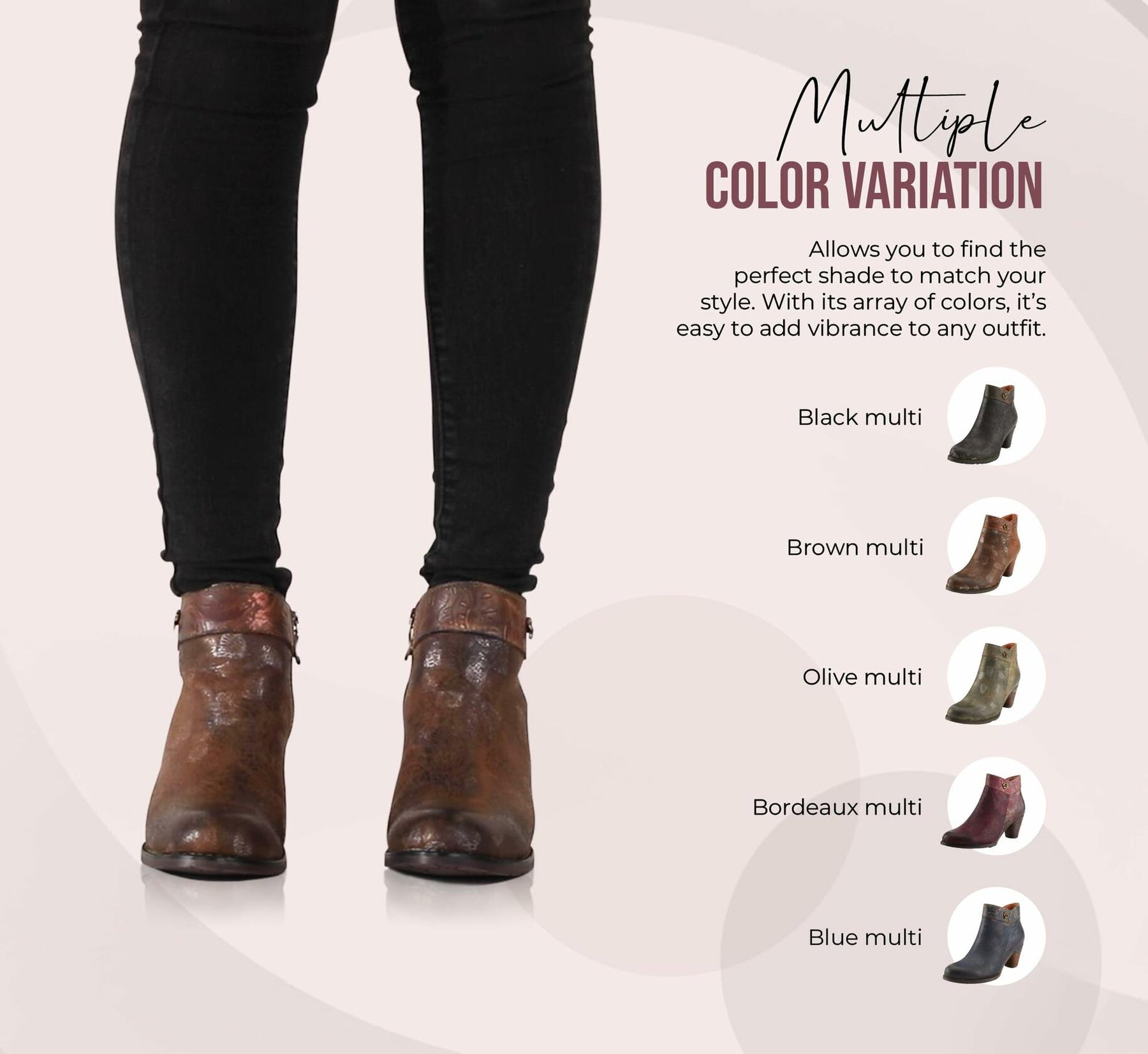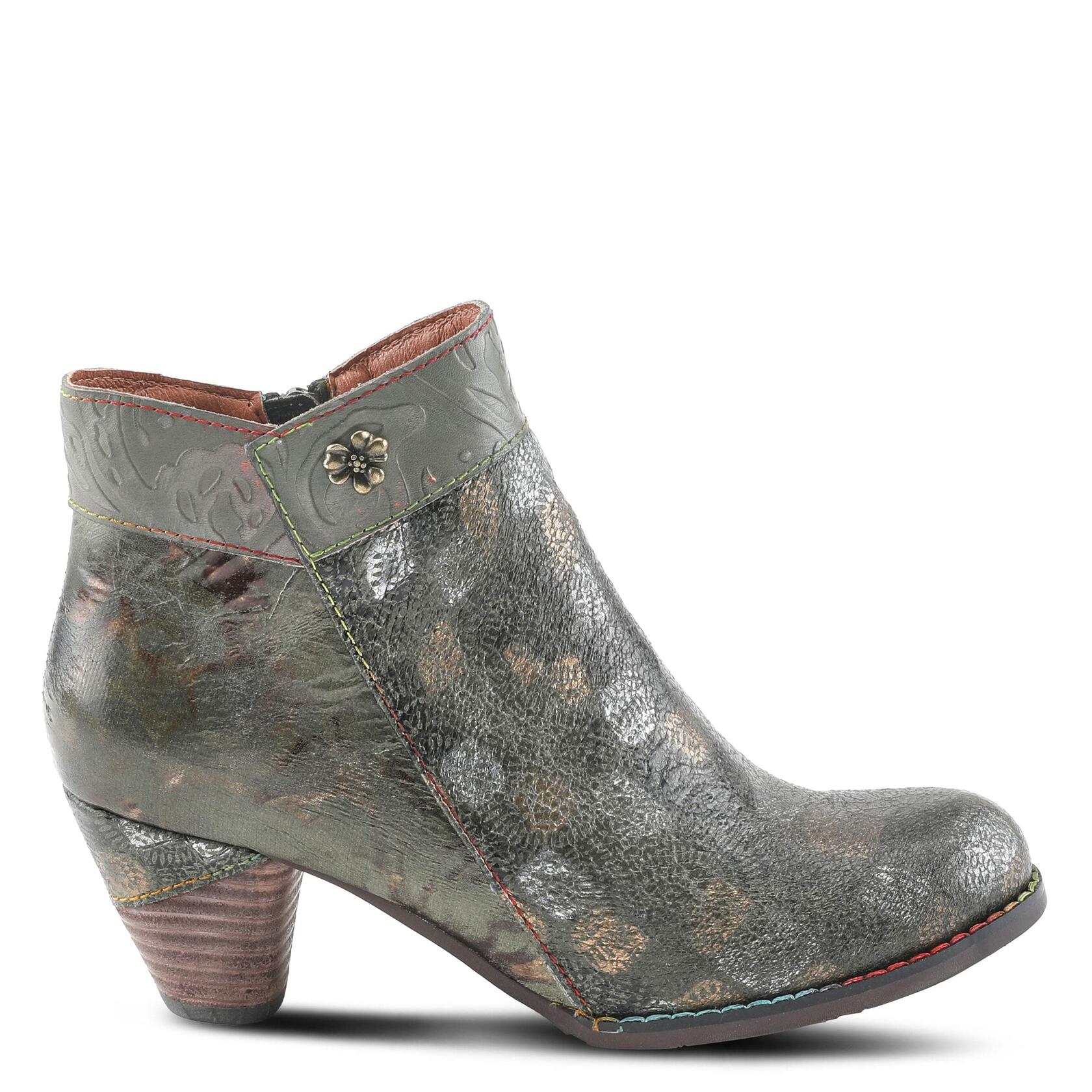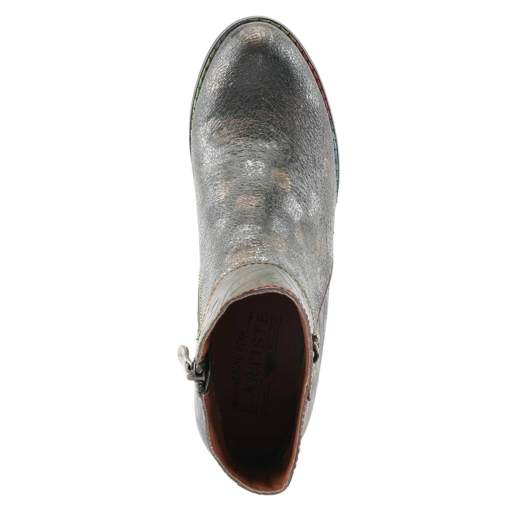 Spring Step Style: Bestlove; Subtle all-over metallic brush strokes on the front rough-out leather upper, with whispie lightning strike highs and lows on a smooth man made back. Sexy double inside and out dipped embossed leather collar, with inside zipper and outside antiqued brass Pansy floral embellishment. Signature L'Artiste rainbow stitching, stacked leather edged all day comfort pyramid heel, silky printed velvet lining with extra cushiony comfort footbeds. Features: 1. High quality combination leather and PU uppers. 2. Combination textured metallic rough-out leather and lightning effect smooth PU bootie with a leather embossed sexy dipped in and out collar. 3. Decorative antiqued floral button on collar. 4. Soft printed velvet textile lining. 5. Rubber outsole 6- 2 ΒΌ" heel and 6" shaft. Benefits: 1. Materials are naturally soft, light and breathable. 2. French designed to be elegant but practical, fun, and cute, for all wearing occasions. 3. Extra padding for all day comfort. 4. Inside zipper for easy in and out. 5. Great Traction in any Weather. Upper: Brushed Genuine and man-made Leathers Lining: Printed Synthetic Velvet Insole: Man-made Leather Outsole: Rubber Heel Height: 2 ΒΌ inch Sole Thickness: 3/8 inch Shaft Height: @6 inches Opening Circumference: 9 ΒΎ" based on a size 37