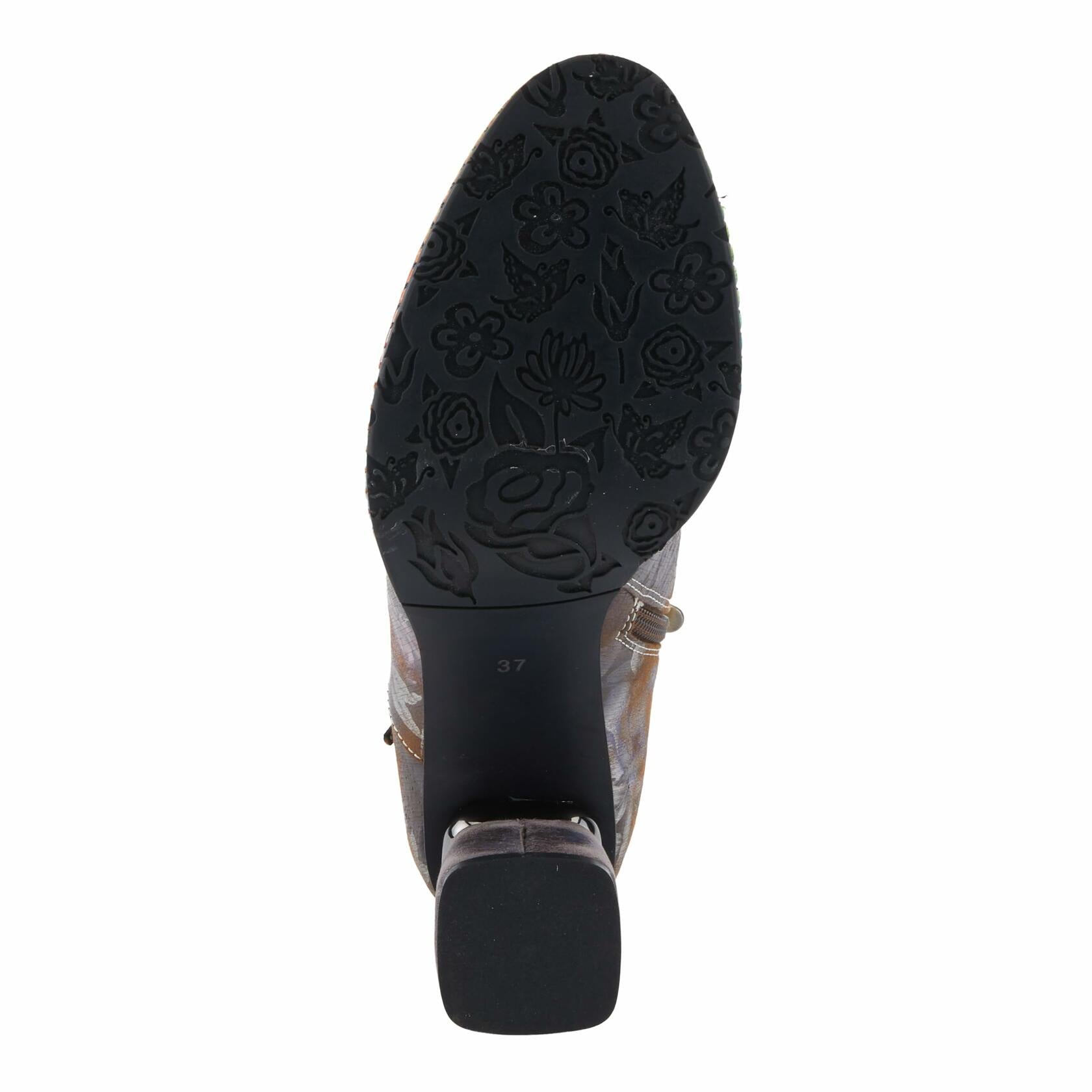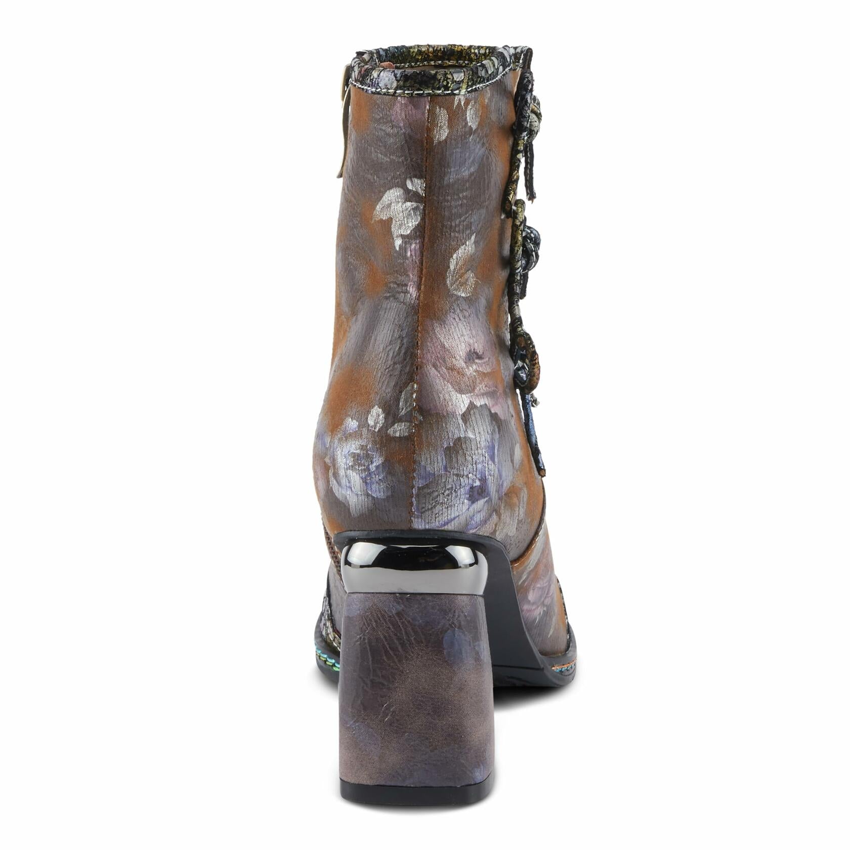 Description Sophistication meets style with this chic bootie! The pop of multi-colored metallics blend together perfectly with beautifully printed floral designs. The floral printed wrapped heel seamlessly complements the upper design, creating a stunning visual appeal. A sleek metallic cap toe that adds a touch of glamour. Three decorative ribbons adorn the outside, adding a unique and playful twist. To top it off, contrasted rainbow stitching around the welt adds an unexpected pop of color, making these booties a standout choice for the fashion-forward individual. Disclaimer: LArtiste products are made with natural tanned leather using traditional hand painting techniques. This unique finishing process is used to create a natural effect with color variations to deliver authentic look and beauty.