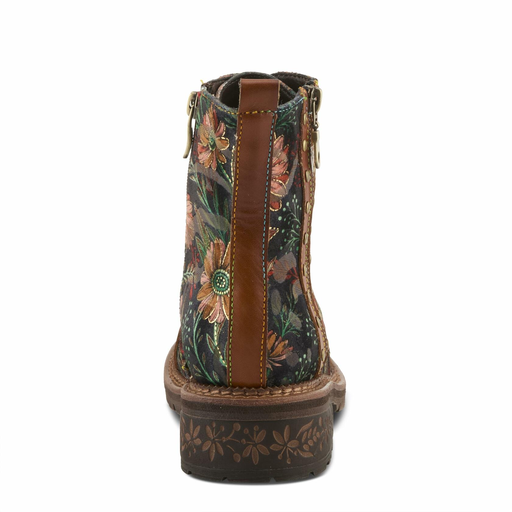 Step into an artful blend of rugged charm and chic design with the L'Artiste Cordea Booties, crafted for those who love handcrafted artistry with a bold edge. Featuring a rich leather-textile combo upper, these boots are adorned with intricate floral embroidery and signature rainbow stitching for a striking look. The inside zipper ensures easy wear, while studded accents and etched heel detailing add a unique statement touch. Designed for comfort, the faux fur-lined insole provides warmth and support, while the durable lug sole offers excellent traction for all-day wear.