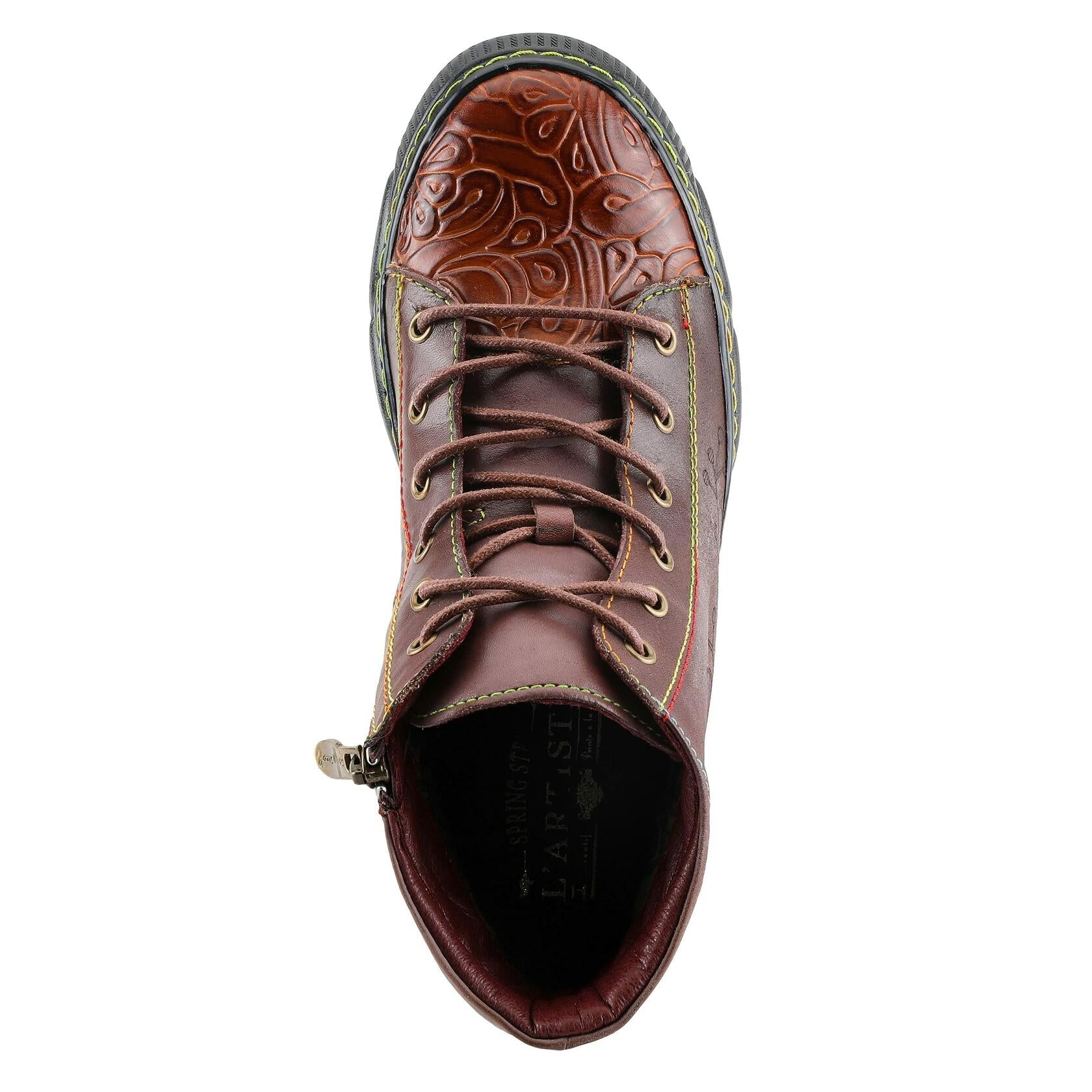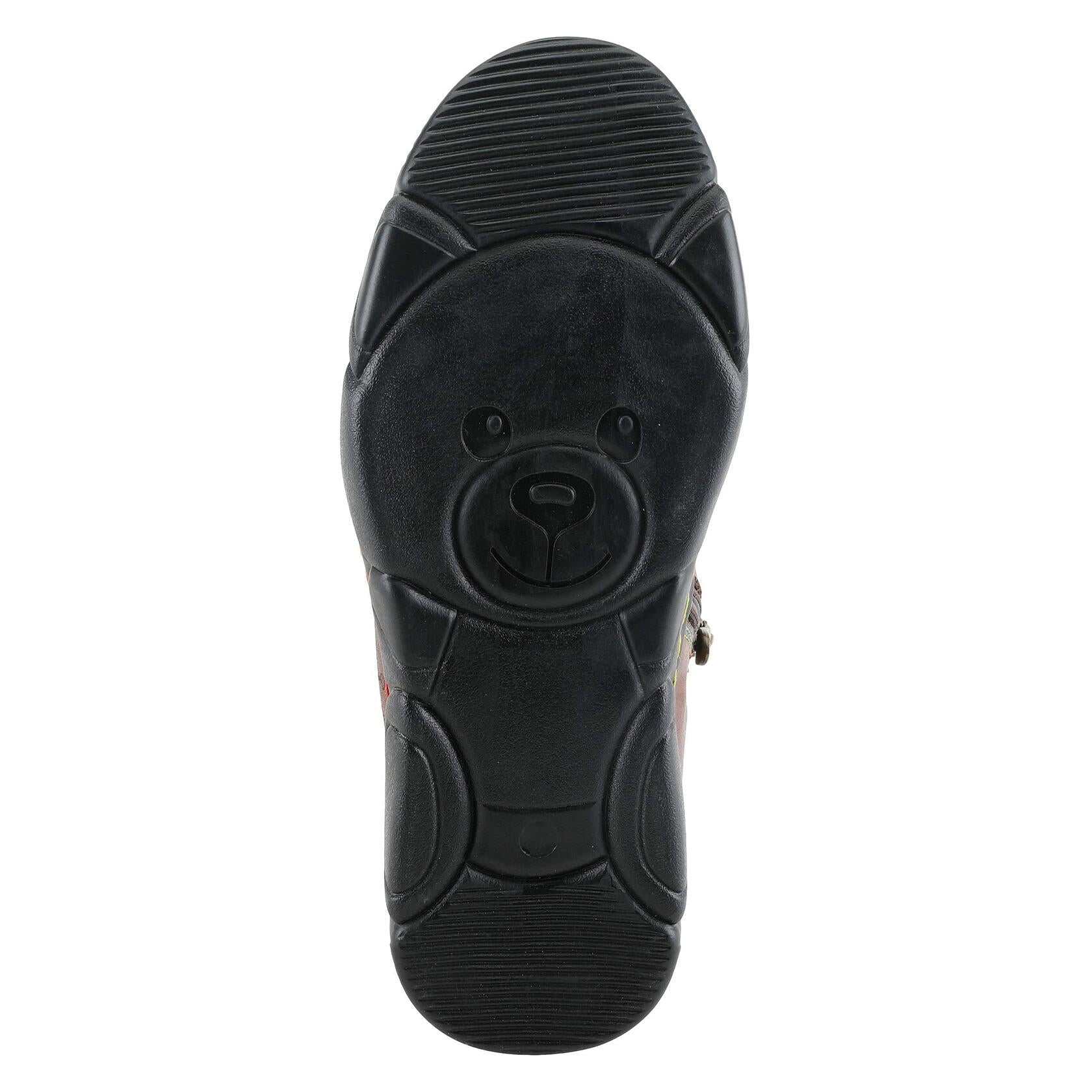L'ARTISTE Style: DANIELLET Leather lace-up bootie starring a debossed toe, floral design with color pop, and laser etching and signature rainbow stitching on a flexible comfort sole. Upper: Leather Lining: Synthetic Insole: Synthetic Outsole: PVC Closure: Lace-up, Zipper Heel Height: 1 1/8" Platform Height: 1" Shaft Height: 2 1/2" Circumference: 9"-10 1/2" Features: - Adjustable, Comfort, Hand-painted, Padded Insole, Premium, Removable Insole Disclaimer: LArtiste products are made with natural tanned leather using traditional hand painting techniques. This unique finishing process is used to create a natural effect with color variations to deliver authentic look and beauty.
