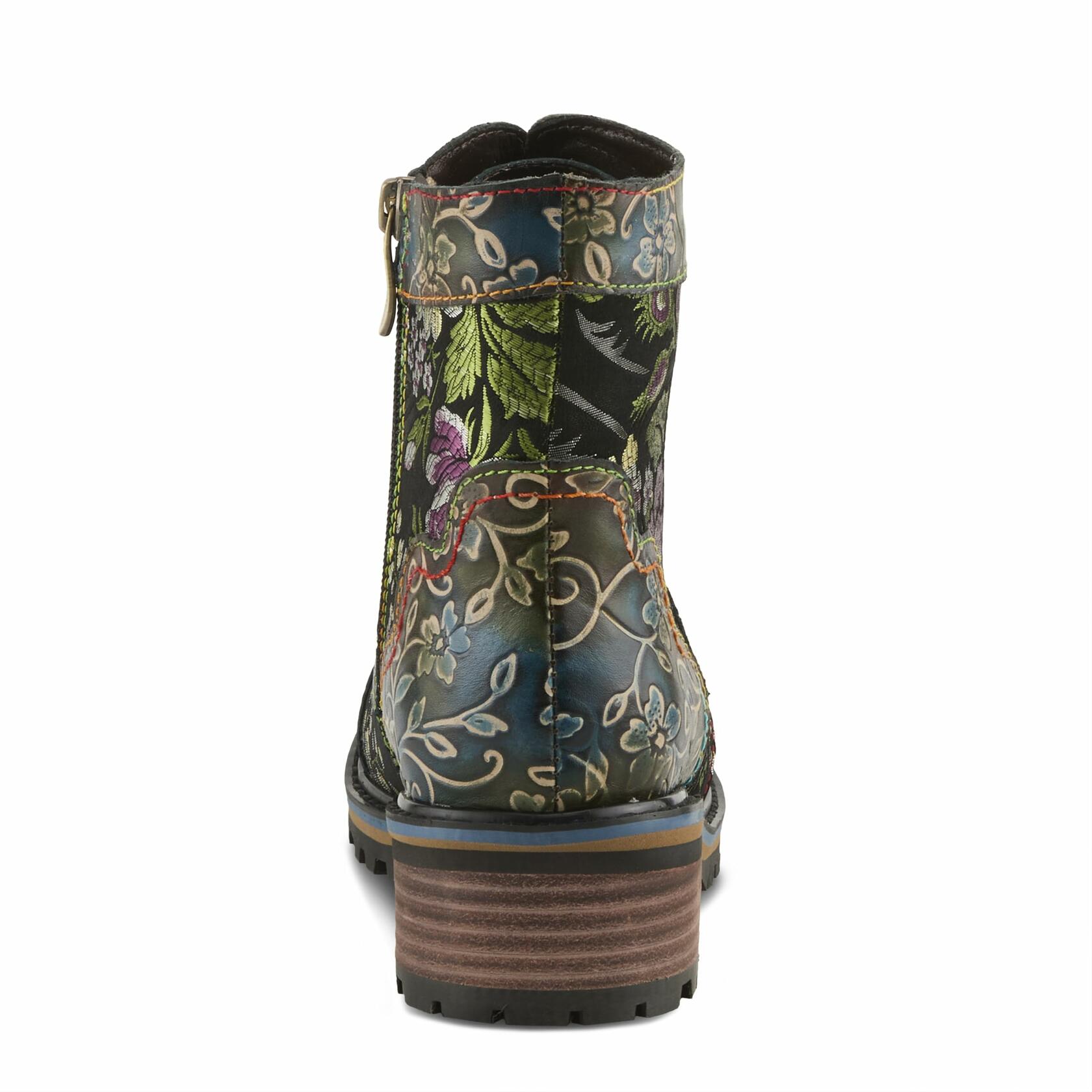 L`Artiste Style: FANTASTIC Incredible leather combination bootie showing an embroidered textile and embossed floral leather on a comfort lug sole. Upper: Leather, Textile Lining: Faux Fur Insole: Faux Fur Outsole: Rubber Closure: Lace-up, Zipper Heel Height: 1 3/4" Platform Height: 3/4" Shaft Height: 5 1/2" Circumference: 9"-11 1/2" Features: - Adjustable, Comfort, Hand-painted, Padded Insole, Premium Disclaimer: LArtiste products are made with natural tanned leather using traditional hand painting techniques. This unique finishing process is used to create a natural effect with color variations to deliver authentic look and beauty.