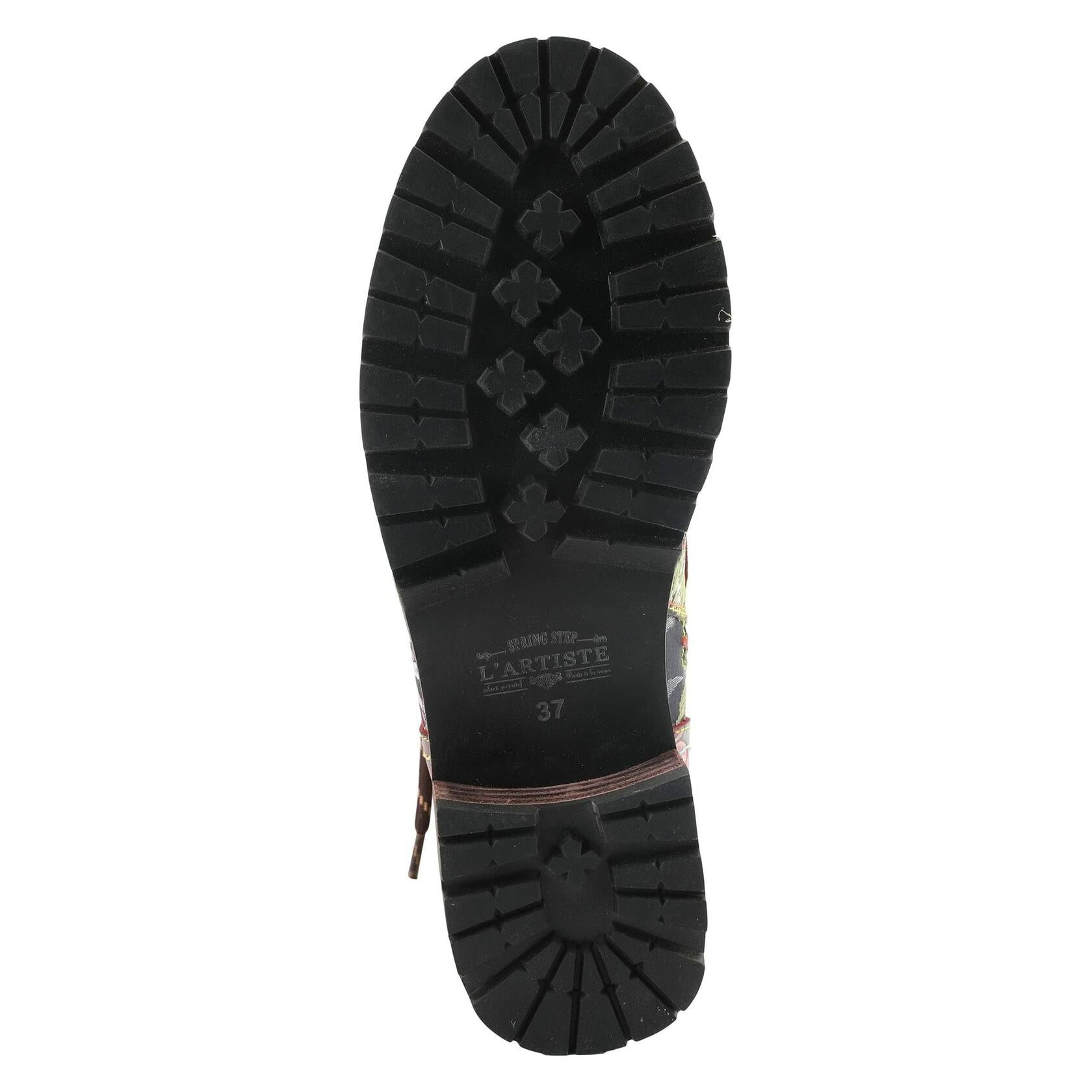 L'ARTISTE Style: FANTASTIC Incredible leather combination bootie showing an embroidered textile and embossed floral leather on a comfort lug sole. Features: - Adjustable, Comfort, Hand-painted, Padded