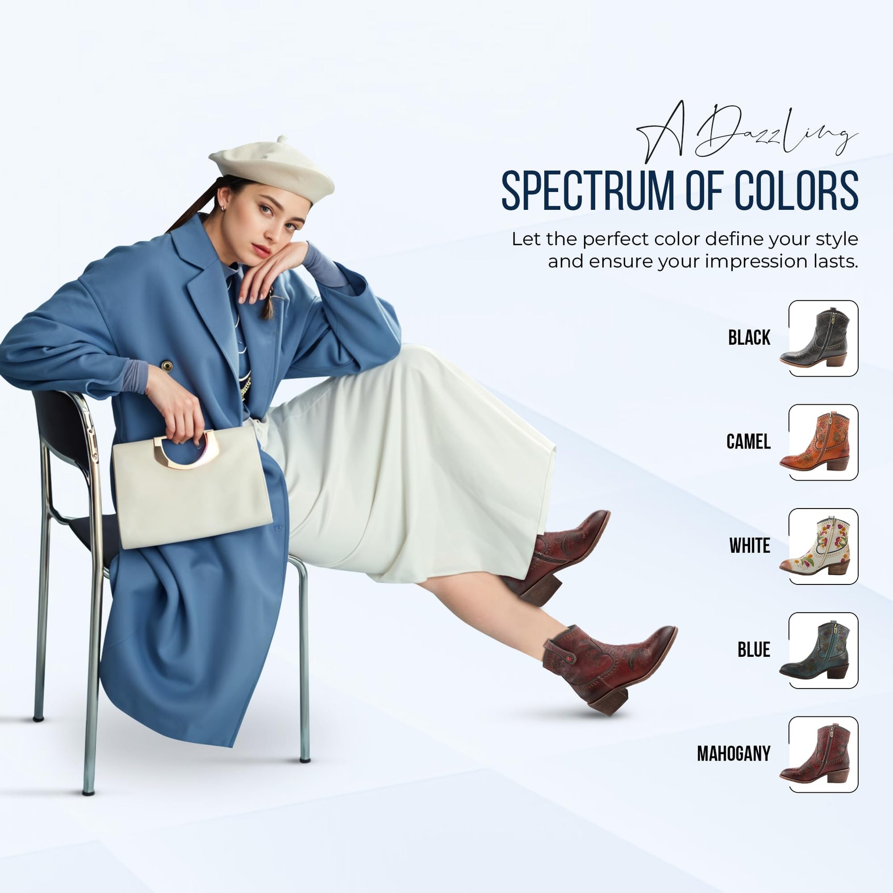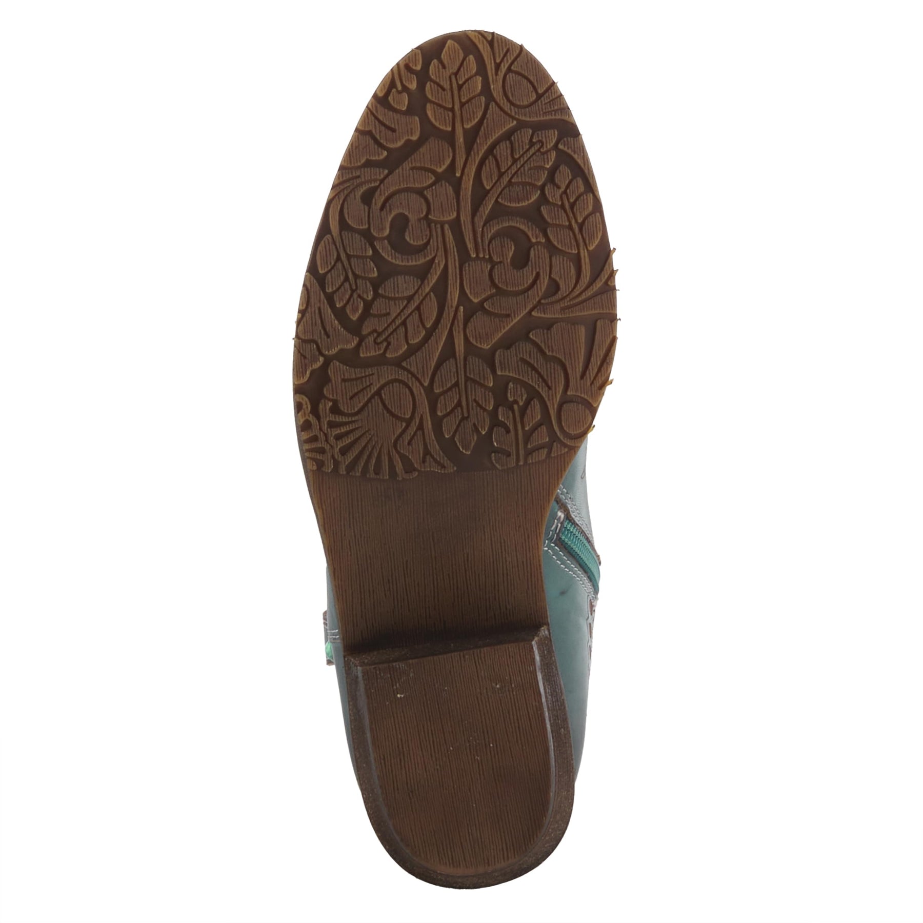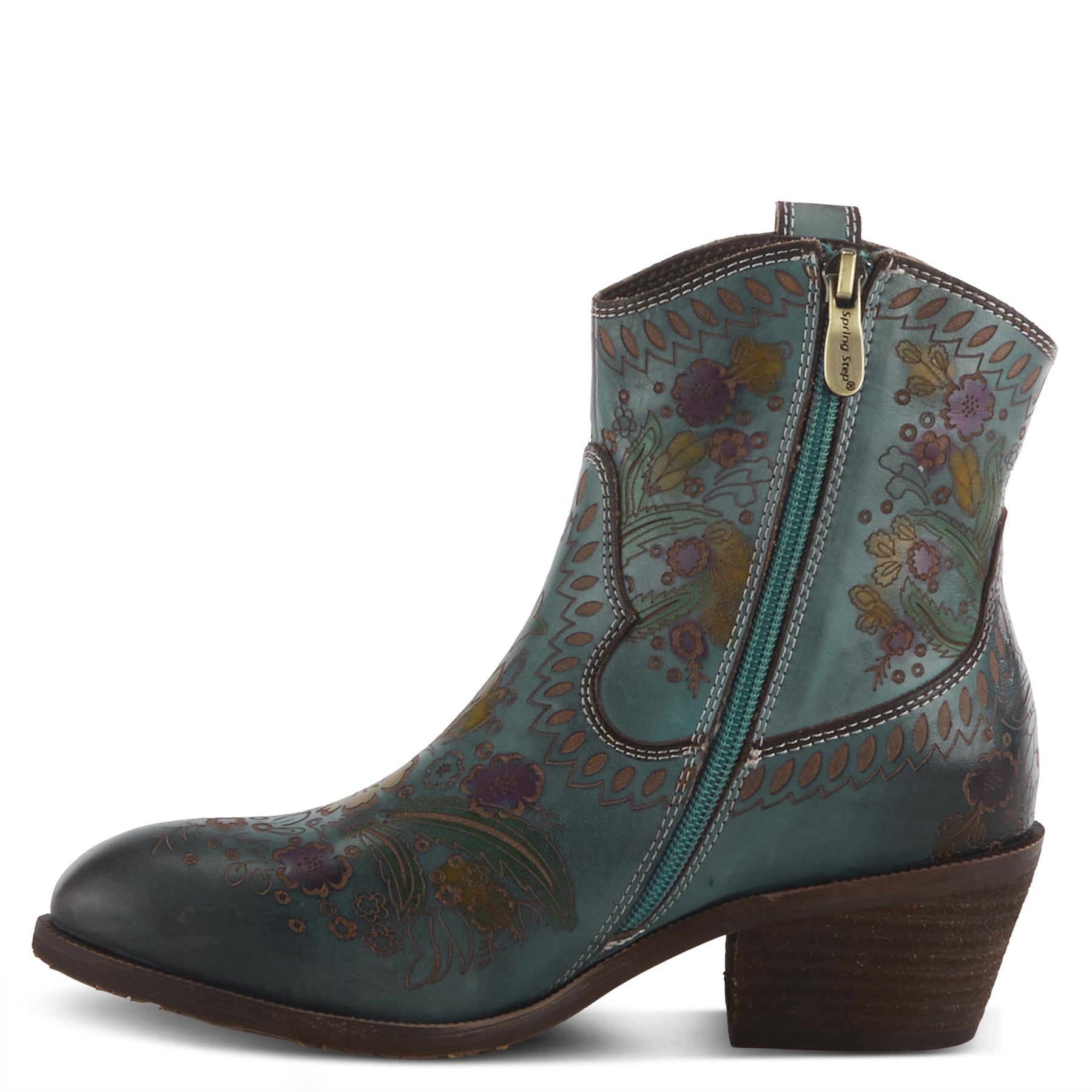 L'Artiste Style: Galop Premium hand selected leathers featuring hand embossed and hand-colored sprigs of wispy leaves and blooms. Fashion Cowgirl style boot with front yoke, outside cabochon embellished pull tab, and inside zipper. Upper: Leather Lining: Synthetic, Velvet Insole: Synthetic Outsole: Rubber Closure: Zipper Heel Height: 2 " Platform Height: 1/4" Shaft Height: 7 1/4" Circumference: 10" Features: - Comfort, Hand-painted, Padded Insole, Premium Disclaimer: L'Artiste products are made with natural tanned leather using traditional hand painting techniques. This unique finishing process is used to create a natural effect with color variations to deliver authentic look and beauty.