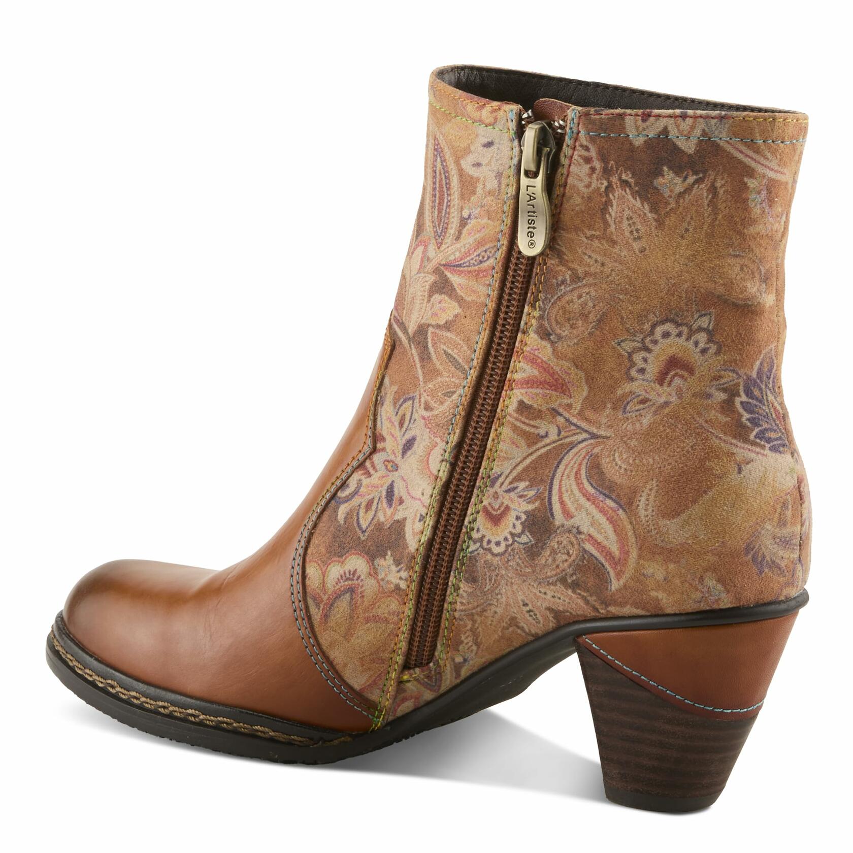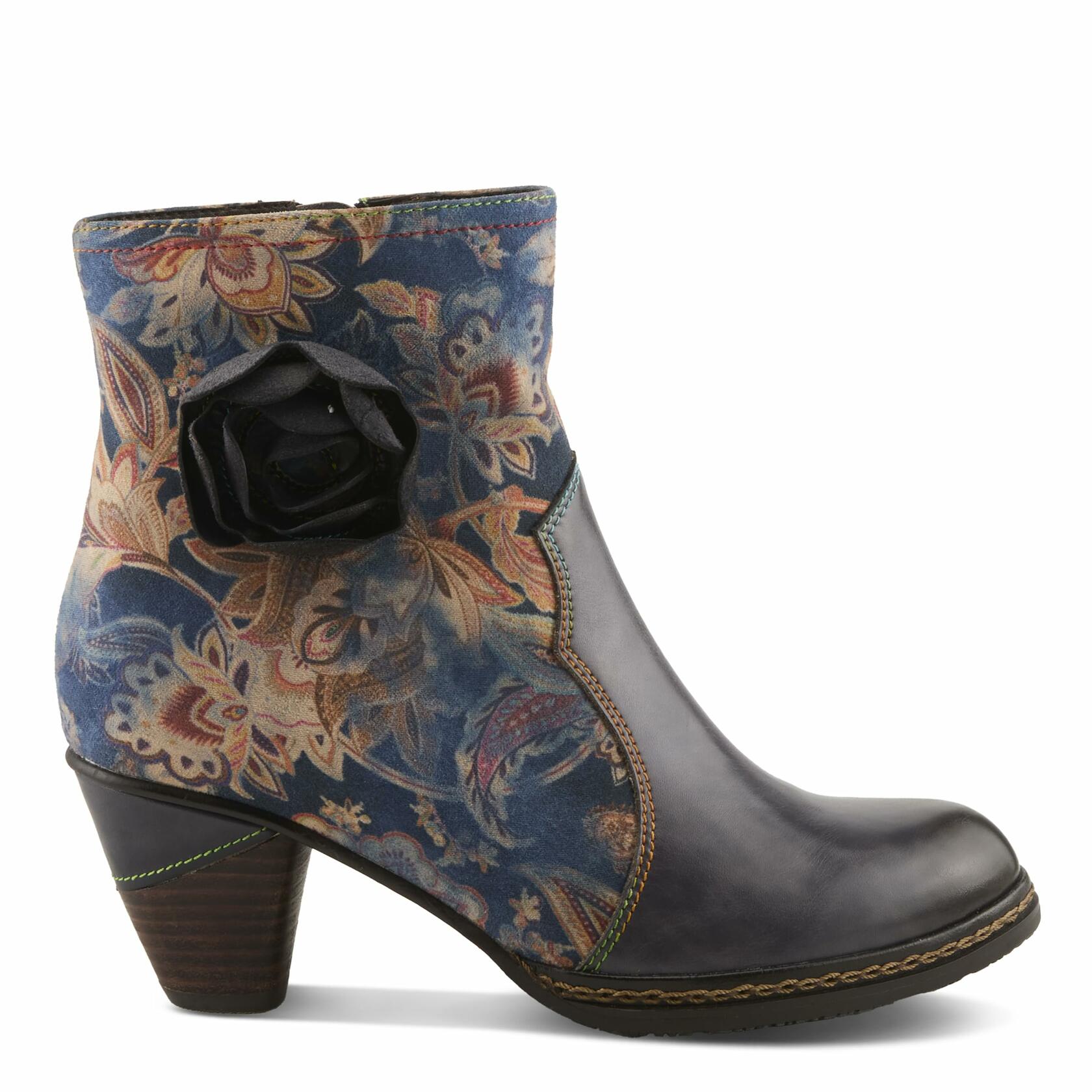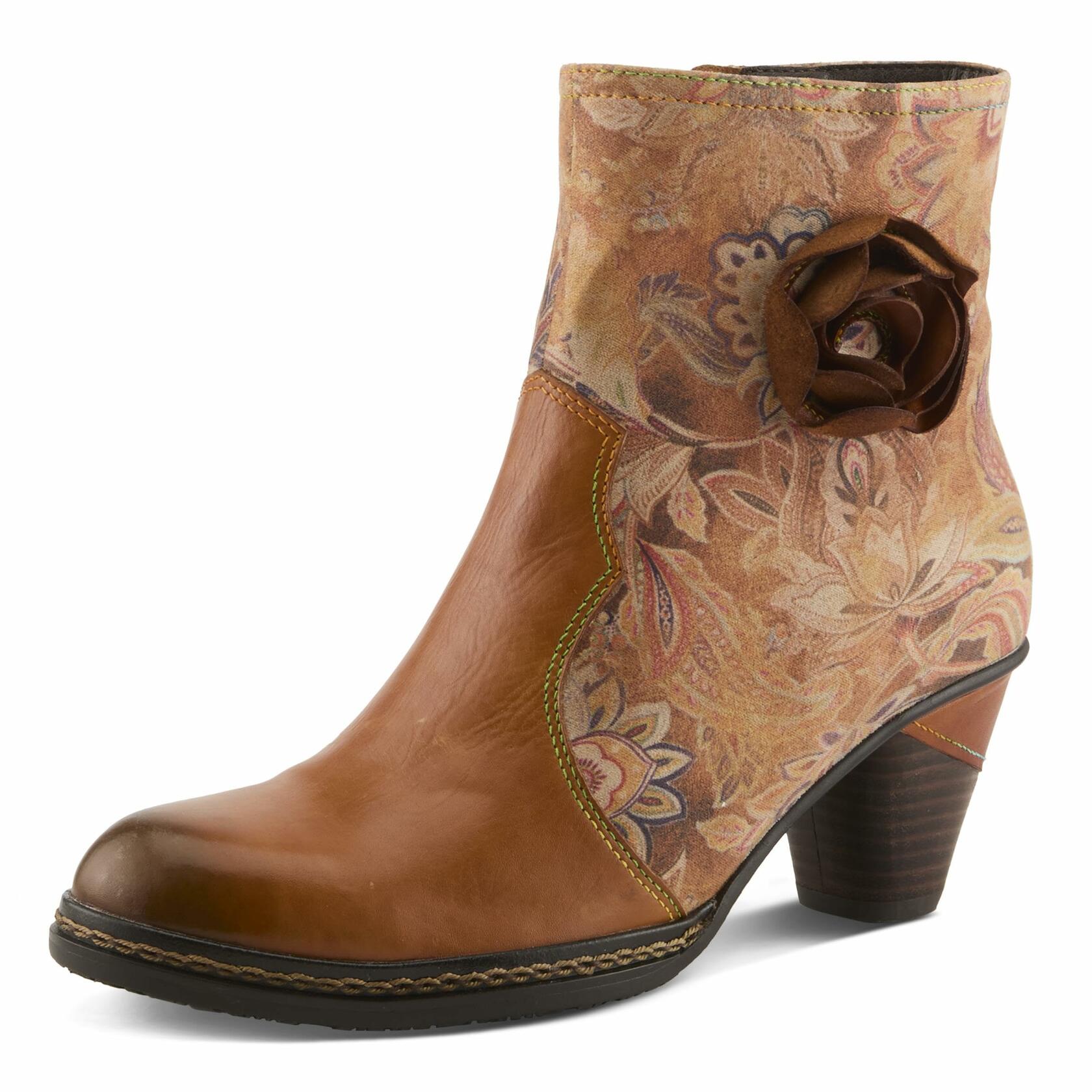 Step into effortless elegance with the L'Artiste Naima Booties, where artistry meets modern fashion. These ankle boots feature a luxurious leather combo upper, blending smooth and floral-printed panels for a bold contrast. An intricate cutout rose embellishment adds a unique, feminine touch, while the stacked mid-heel provides the perfect balance of height and stability. Designed for all-day comfort, the cushioned insole and soft faux fur lining ensure a cozy fit. The inside zipper allows for easy wear, making these boots a must-have statement piece for those who love chic sophistication with a contemporary flair.