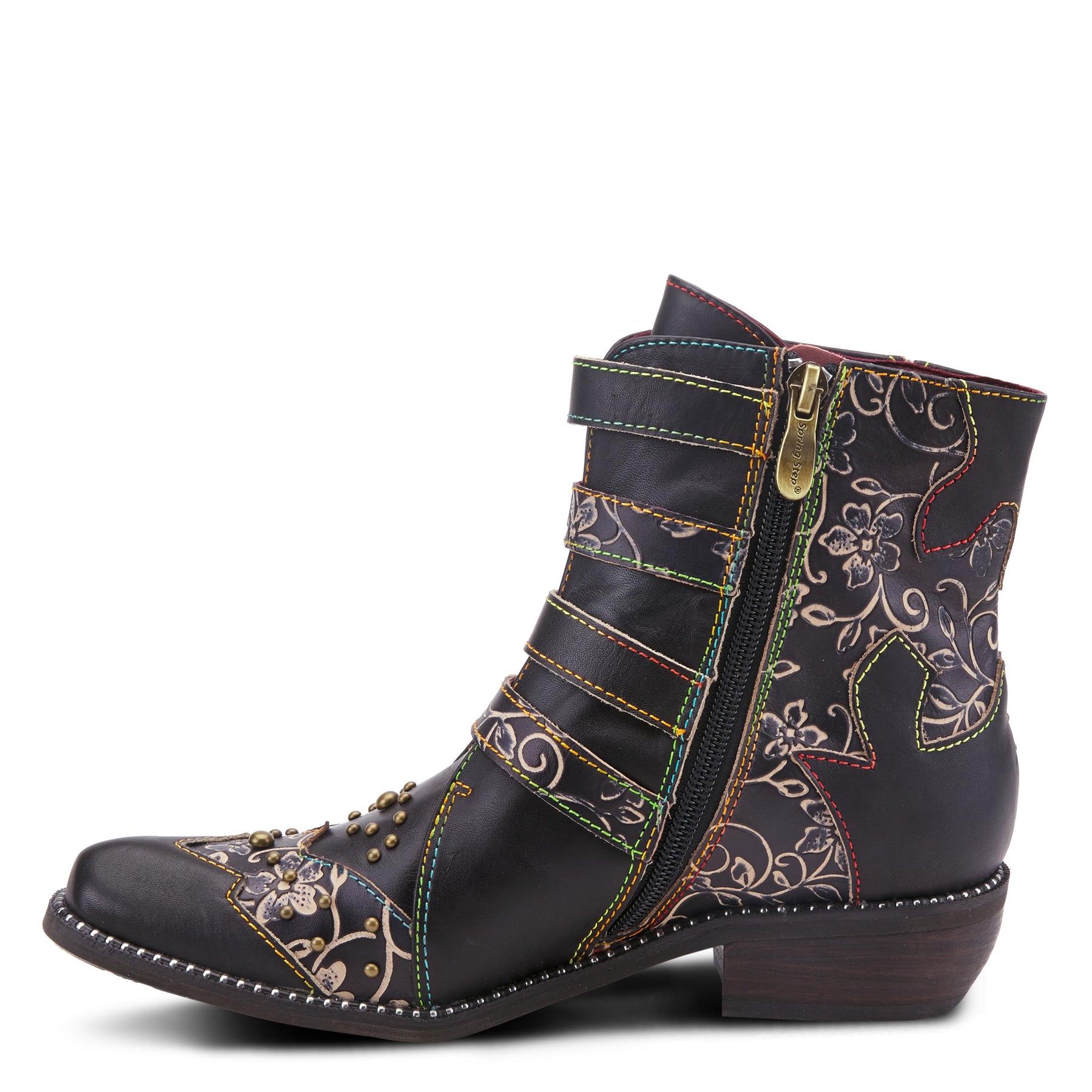 L'Artiste Style: Rodeha A beautiful western style bootie with a Victorian flavor, with amazing four(4) strap refined bow style antique buckles and end strap embellishments, in a combination of full grain burnished polished leather and embossed two tone floral designed hand painted leather. Heel Height (approximately): 1 1/2" stacked Platform Height (approximately): 1/4" Shaft Height (approximately): 5 1/2" Circumference (approximately): 11" Features: - Full grain burnished polished leather and embossed two tone floral designed hand painted leather -Western style pointed toe silhouette -Full length inside zipper closure with brushed metal zipper pull -Delicate antique bow style buckles, end strap embellishments and an multi round stud covered upper -Soft and supple imitation leather and textile lining -Imitation leather padded insole -Unique western style and round stacked heel shape -Rubber outsole with a beautiful bracelet inspired full shiny welt -Imported. Disclaimer: L’Artiste products are made with natural tanned leather using traditional hand painting techniques. This unique finishing process is used to create a natural effect with color variations to deliver authentic look and beauty.