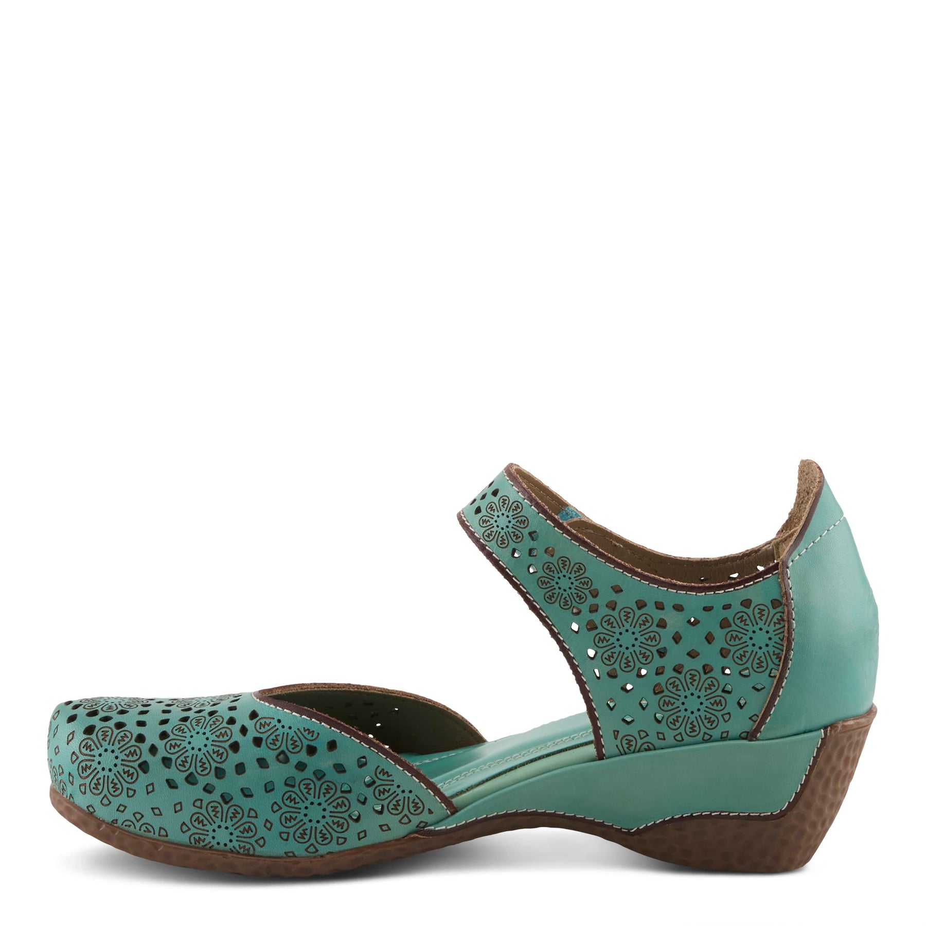 L'Artiste Style: AMERICANA No boring sandals here – the Americana adds a unique flare to your everyday wedged sandal. This embossed floral decorative buckle compliments the shoe as well as the perforated floral pattern and cut-outs. Upper: Leather Lining: Synthetic Insole: Synthetic Outsole: Rubber Closure: Hook&Loop Heel Height: 2" Platform Height: 3/4" Features: - Adjustable, Comfort, Footbed Disclaimer: L'Artiste products are made with natural tanned leather using traditional hand painting techniques. This unique finishing process is used to create a natural effect with color variations to deliver authentic look and beauty.