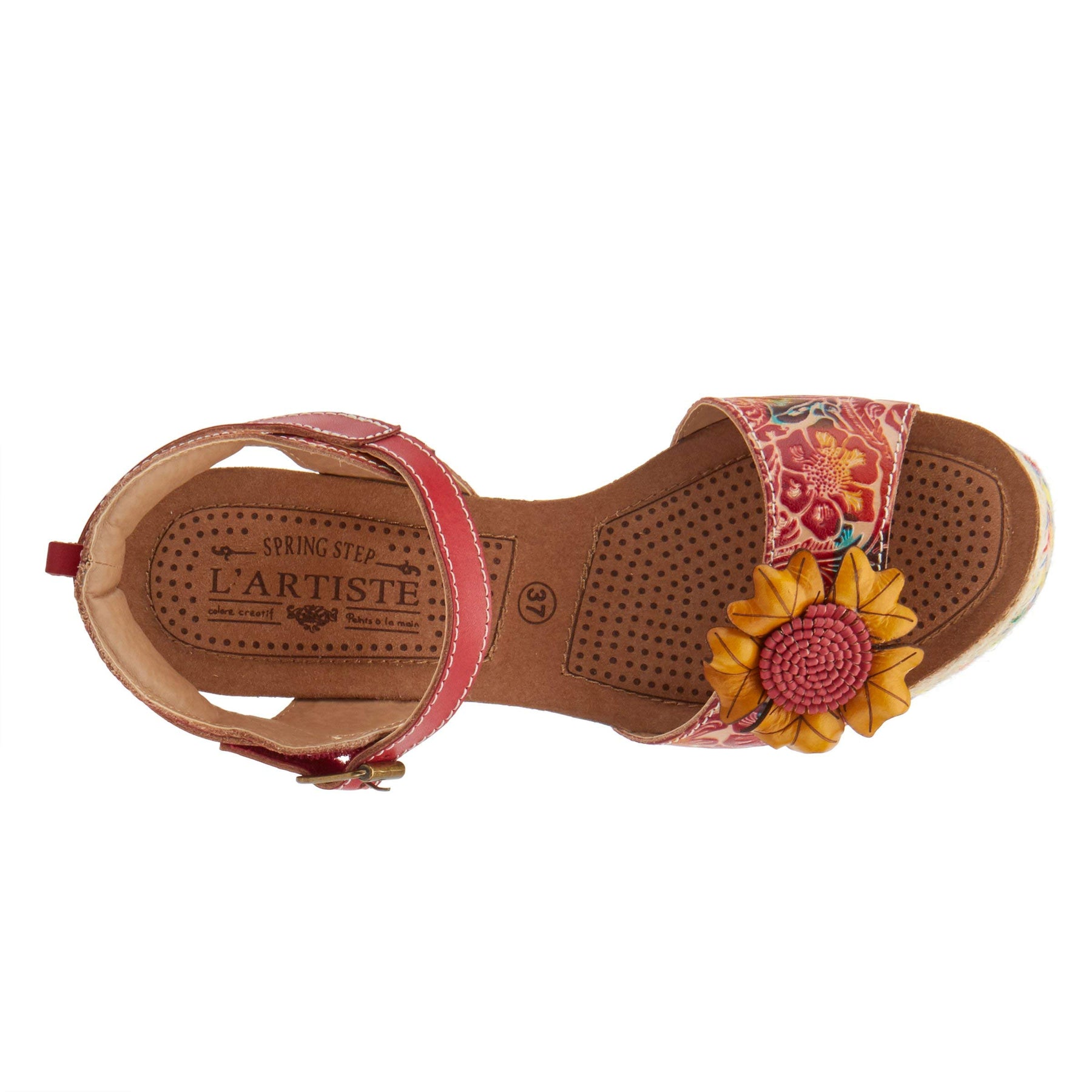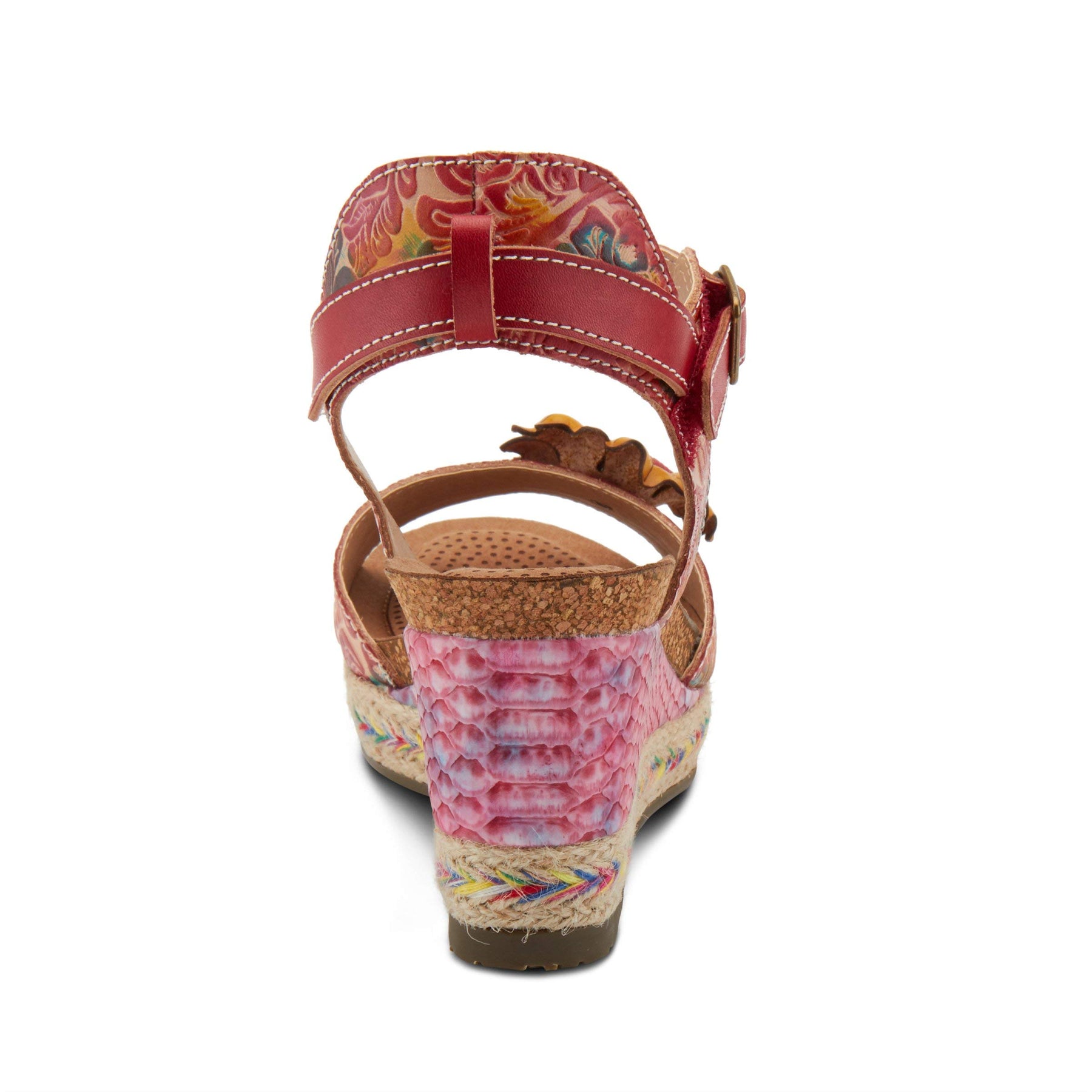 The L'Artiste by Spring Step Annmarie quarter strap leather sandal features hand-painted cheery detail with floral embossing and a dimensional leather flower in full bloom across the toe strap. The French inspired design includes exotic matching python textile wrapped and jute wedge with rainbow stitching. Heel Height (approximately): 3", 1 1/4" platform. Features: -High quality leather upper, round toe silhouette, padded heel collar, matching python wrapped and jute wedge. -Adjustable hook and loop ankle strap with a decorative brushed metal buckle. -Synthetic leather lining. -Soft synthetic leather comfort padded insole. -Rubber outsole with a cork-infused midsole. -Imported. Disclaimer: L'Artiste products are made with natural tanned leather using traditional hand painting techniques. This unique finishing process is used to create a natural effect with color variations to deliver authentic look and beauty.