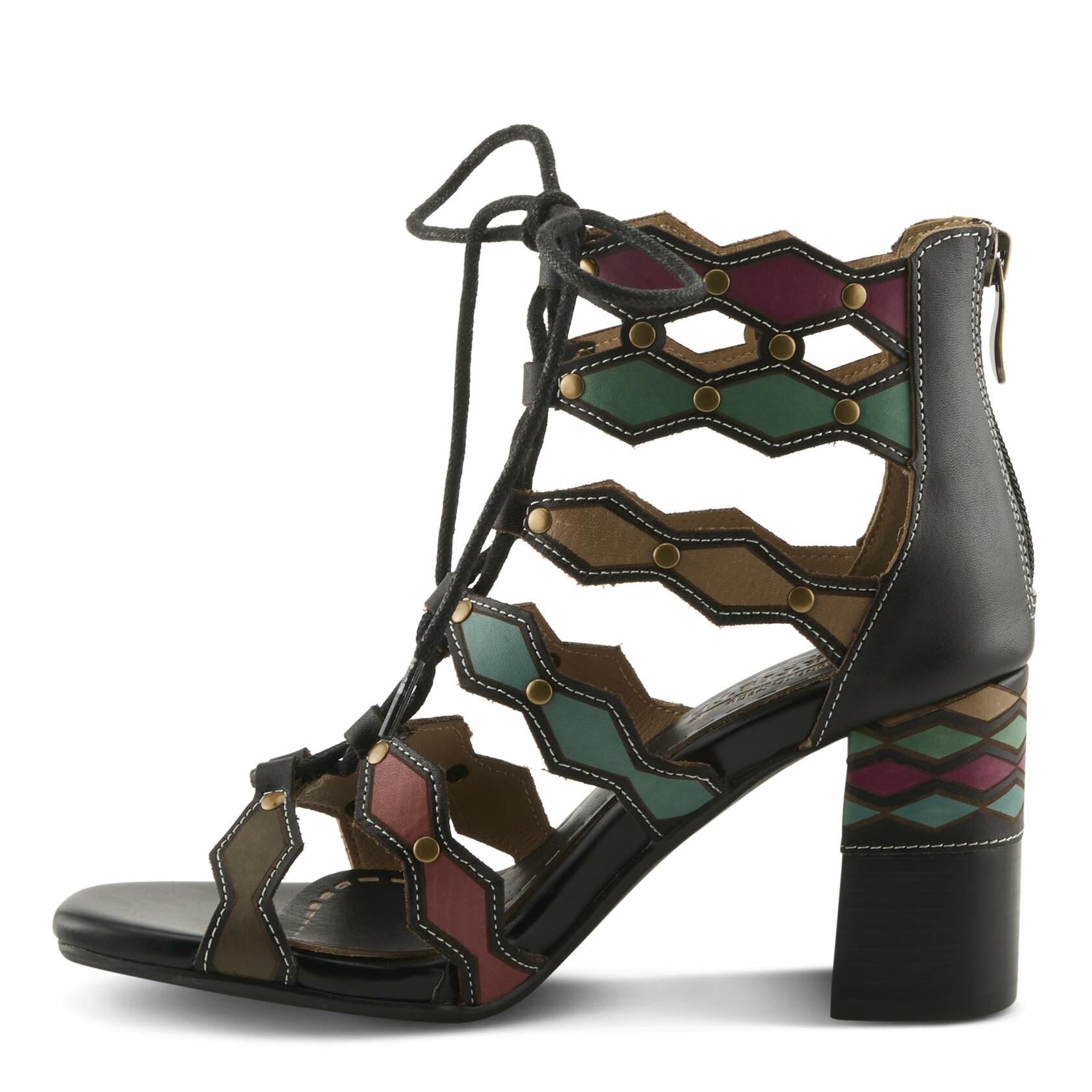 L'Artiste Style: ARTDECO Dance the night away in these eclectic heels. The back zipper closure makes it super easy to slip on and off. Lace up detailing at the front makes it perfect for fuller feet. The multi color straps will match with any outfit and the studs give it the perfect amount of spice. Artdeco is the embodiment of lavish. Upper: Leather Lining: Synthetic Insole: Leather, Synthetic Outsole: Rubber Closure: Lace-up, Zipper Heel Height: 2.75" Platform Height: 1/2" Features: - Adjustable Disclaimer: L'Artiste products are made with natural tanned leather using traditional hand painting techniques. This unique finishing process is used to create a natural effect with color variations to deliver authentic look and beauty.