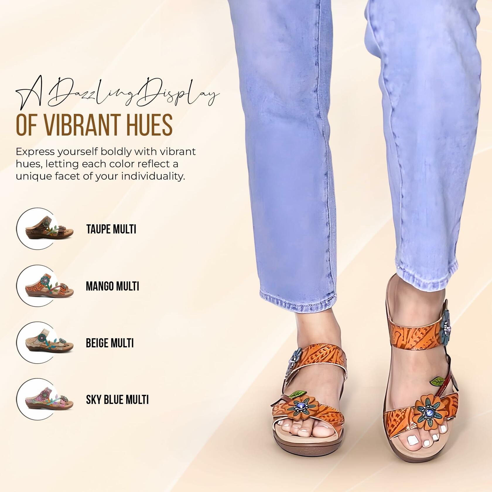 L'Artiste Style: AYMEE European influenced, this hand painted double hook and loop strap is unmatched for uniqueness and adjustability. With a stemmed flower detail and sparkly gemstone cabochons, you will never want to take these off. Upper: Leather Lining: Synthetic Insole: Microfiber Outsole: Rubber Closure: Hook&Loop, Slip-on Heel Height: 2" Platform Height: 1" Features: - Adjustable, Comfort, Footbed Disclaimer: L'Artiste products are made with natural tanned leather using traditional hand painting techniques. This unique finishing process is used to create a natural effect with color variations to deliver authentic look and beauty.