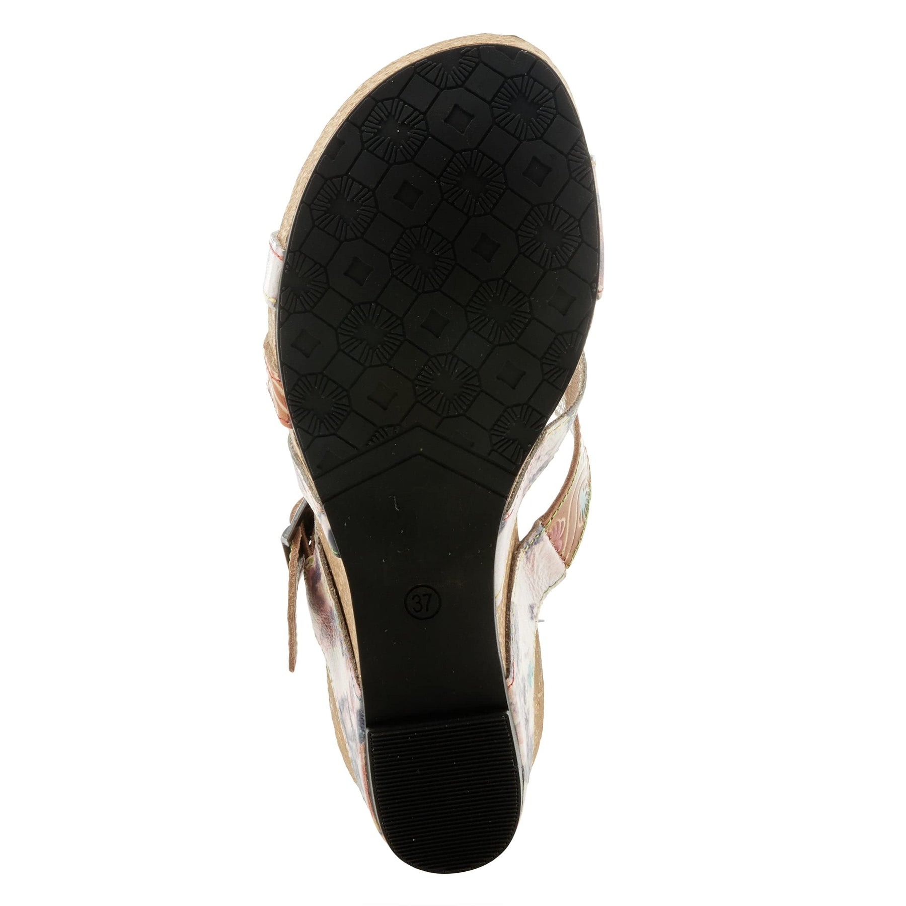 L`Artiste Style: BAOCIRE French inspired multi strapped slide sandal with beautiful hand-painted and embossed florals and swirls on premium leather. Featuring an adjustable top strap with an antique brass buckle, asymmetrical manmade intertwined floral rainbow stitched straps, on an all-day comfortable super padded footbed and cork wrapped wedge. Heel Height: 2 1/2" Platform Height: 3/4" Upper: Leather Lining: Synthetic Insole: Synthetic Outsole: Rubber Closure: Buckle, Slip-on Upper Finishing: Embossed and Handpainted Heel Type: Wedge Toe Type: Open toe, Round toe Features: Adjustable, Comfort, Flexible Sole, Hand-painted, Padded Insole, Premium Disclaimer: L`Artiste products are made with natural tanned leather using traditional hand painting techniques. This unique finishing process is used to create a natural effect with color variations to deliver authentic look and beauty.