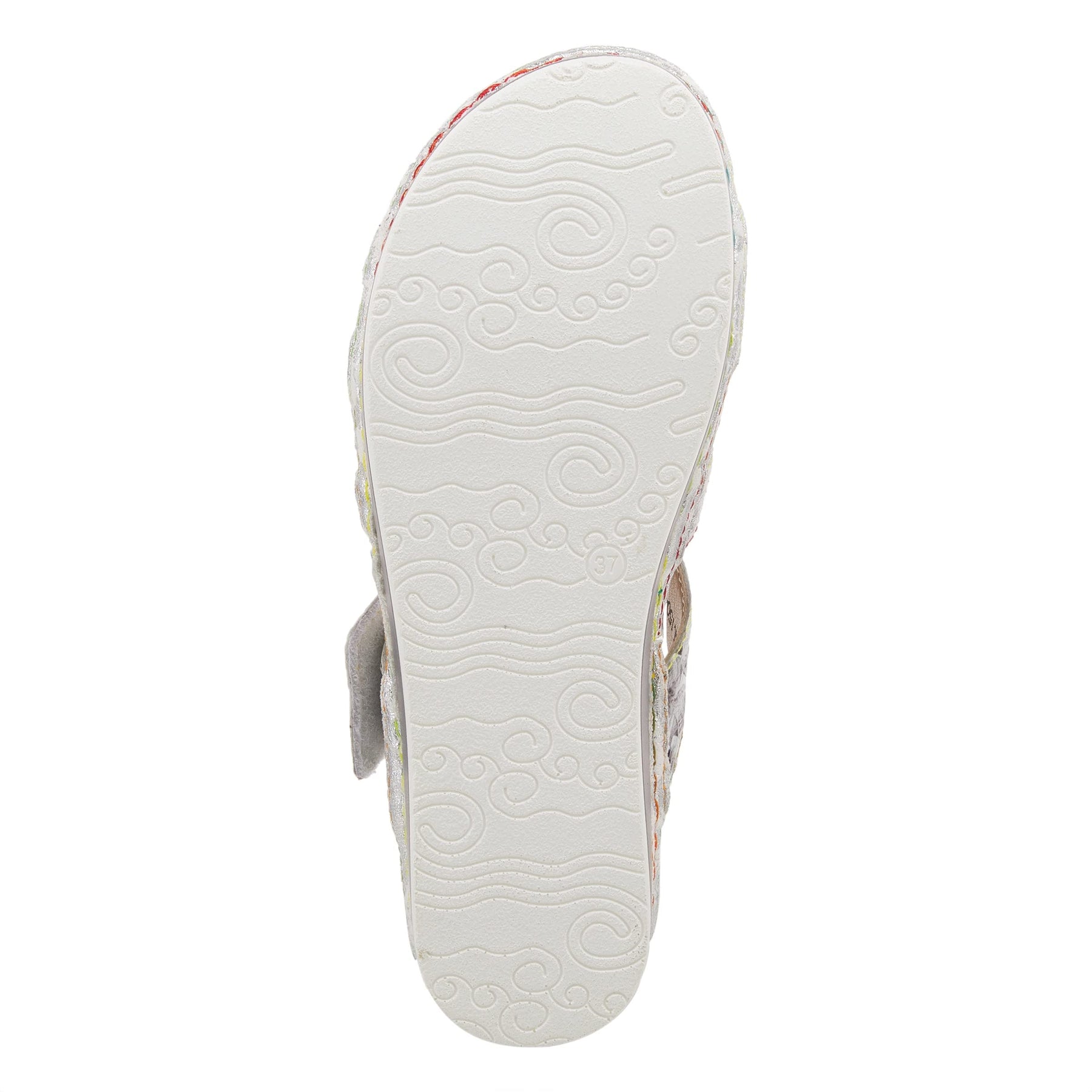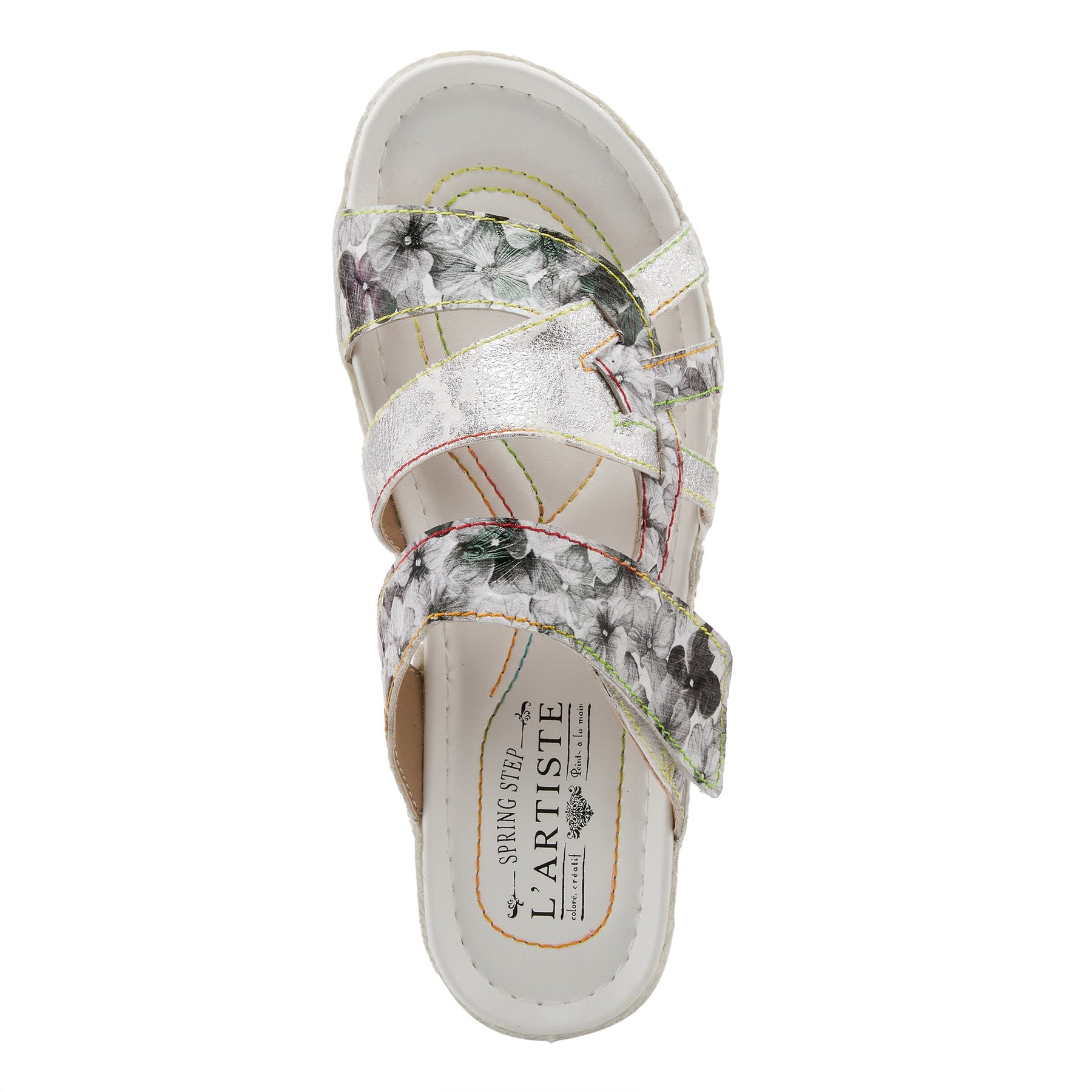 L'Artiste Style: Caiman French inspired design, hand painted leather slide featuring unique color blocking and colorful contrast stitch detail. Heel Height (approximately): 1 1/2", 7/8 " platform. Features: -Hand painted leather, floral embossed design, leather pieced wedge. -Hook-and-loop adjustable strap. -Synthetic leather lining. -Synthetic leather padded insole. -Polyurethane outsole. -Imported. Disclaimer: LArtiste products are made with natural tanned leather using traditional hand painting techniques. This unique finishing process is used to create a natural effect with color variations to deliver authentic look and beauty.