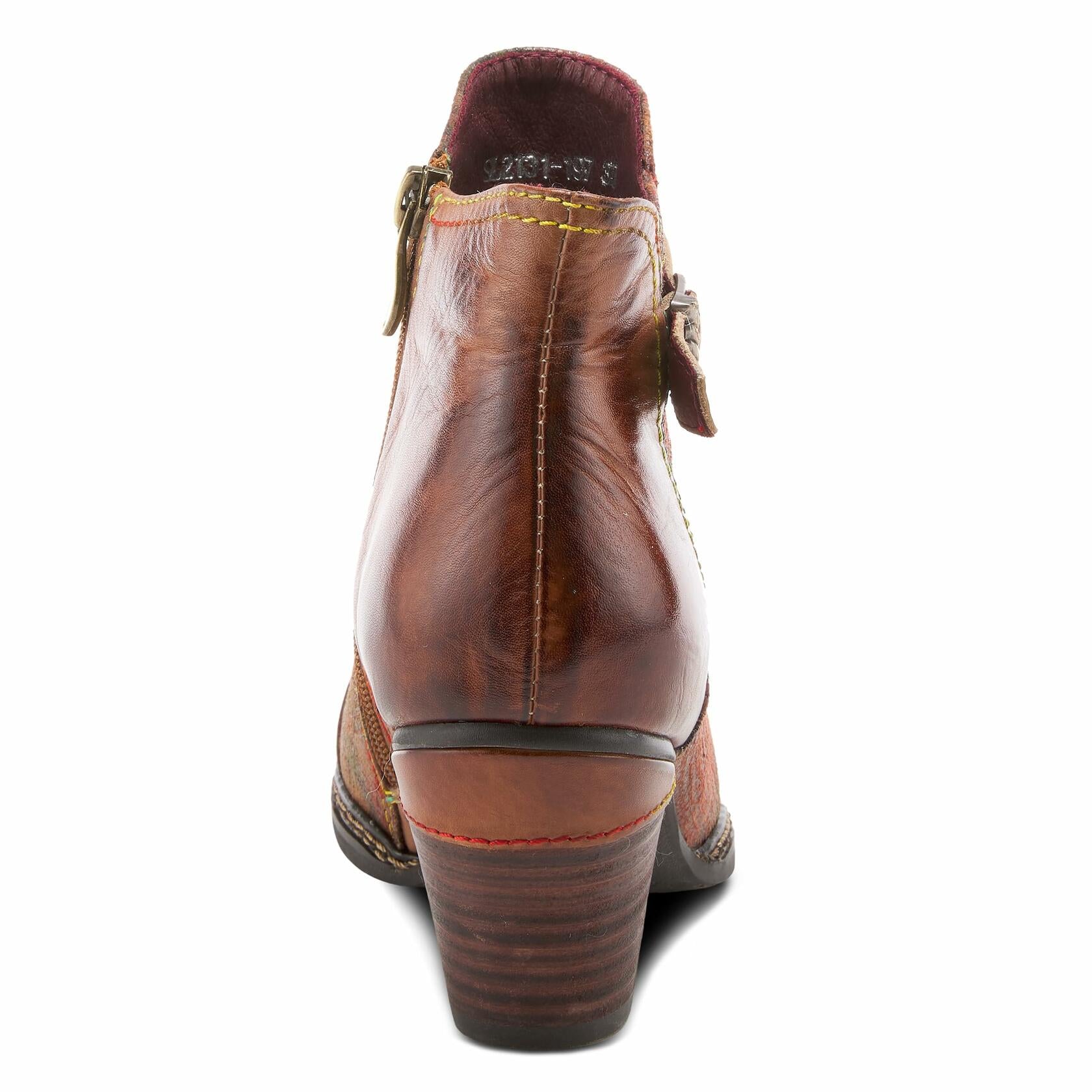 L'Artiste Style: CAPTIVATE Classic bootie with an elegant shimmer material, leather burnished toe and heel, and decorative ankle strap with an antique brass buckle on an all-day wear heel and OUTSOLE. Upper: Leather, Textile Lining: Synthetic, Textile Insole: Synthetic Outsole: Rubber Closure: Zipper Heel Height: 2 3/4" Platform Height: 1/4" Shaft Height: 4" Circumference: 9 1/2" Features: - Comfort, Flexible Sole, Hand-painted, Padded Insole, Premium Disclaimer: L'Artiste products are made with natural tanned leather using traditional hand painting techniques. This unique finishing process is used to create a natural effect with color variations to deliver authentic look and beauty.