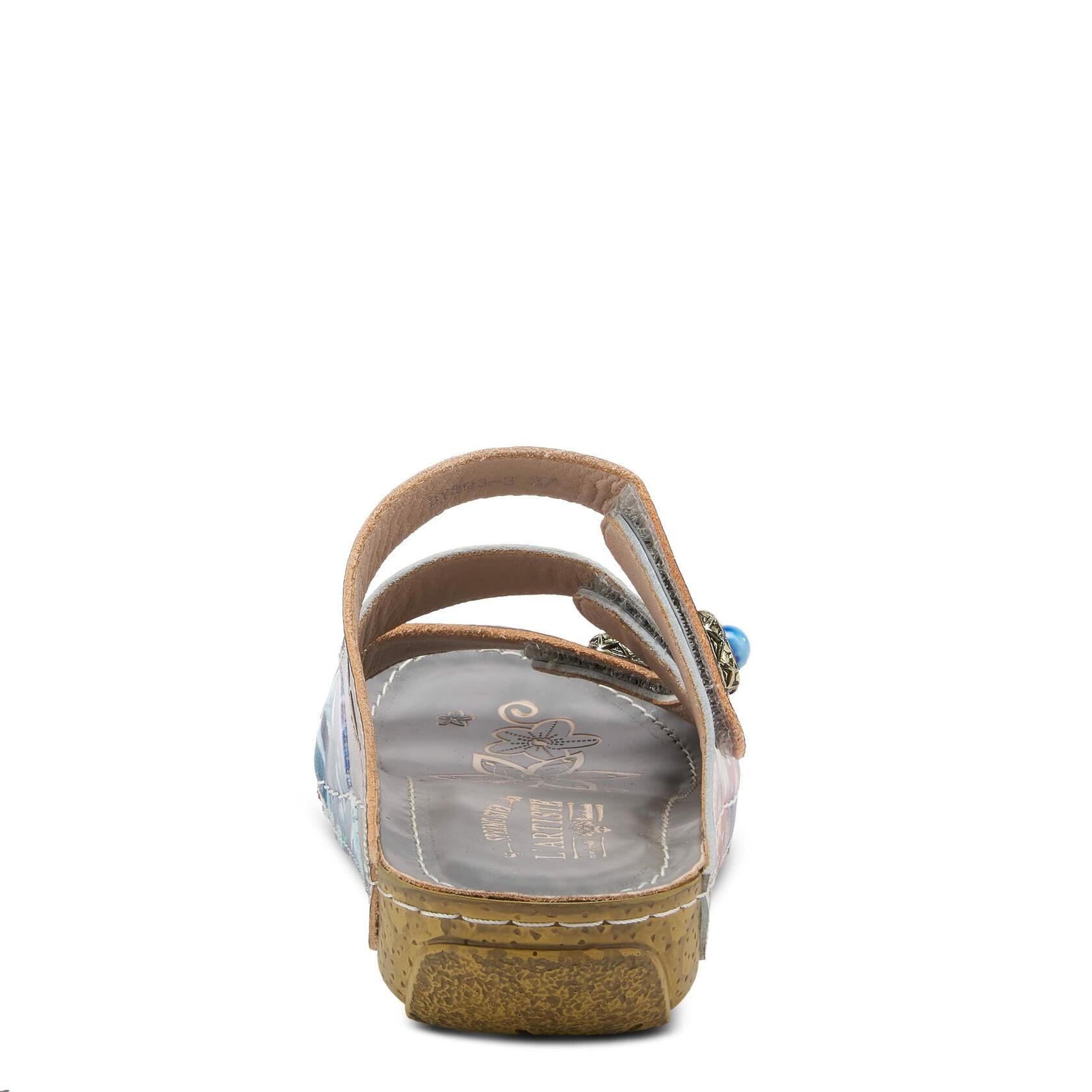 L'Artiste Style: CASTLEWALK French inspired design, hand painted leather slide sandal with unique jeweled stones that embellish each strap for a distinct look featuring three adjustable straps for the perfect fit all on a comfortable cork inspired sole. Upper: Leather, Nubuck Leather Lining: Synthetic Insole: Synthetic Outsole: Polyurethane Closure: Hook&Loop Heel Height: 1 1/4" Platform Height: 1/2" Features: - Comfort, Flexible Sole, Hand-painted, Padded Insole, Premium Disclaimer: LArtiste products are made with natural tanned leather using traditional hand painting techniques. This unique finishing process is used to create a natural effect with color variations to deliver authentic look and beauty.