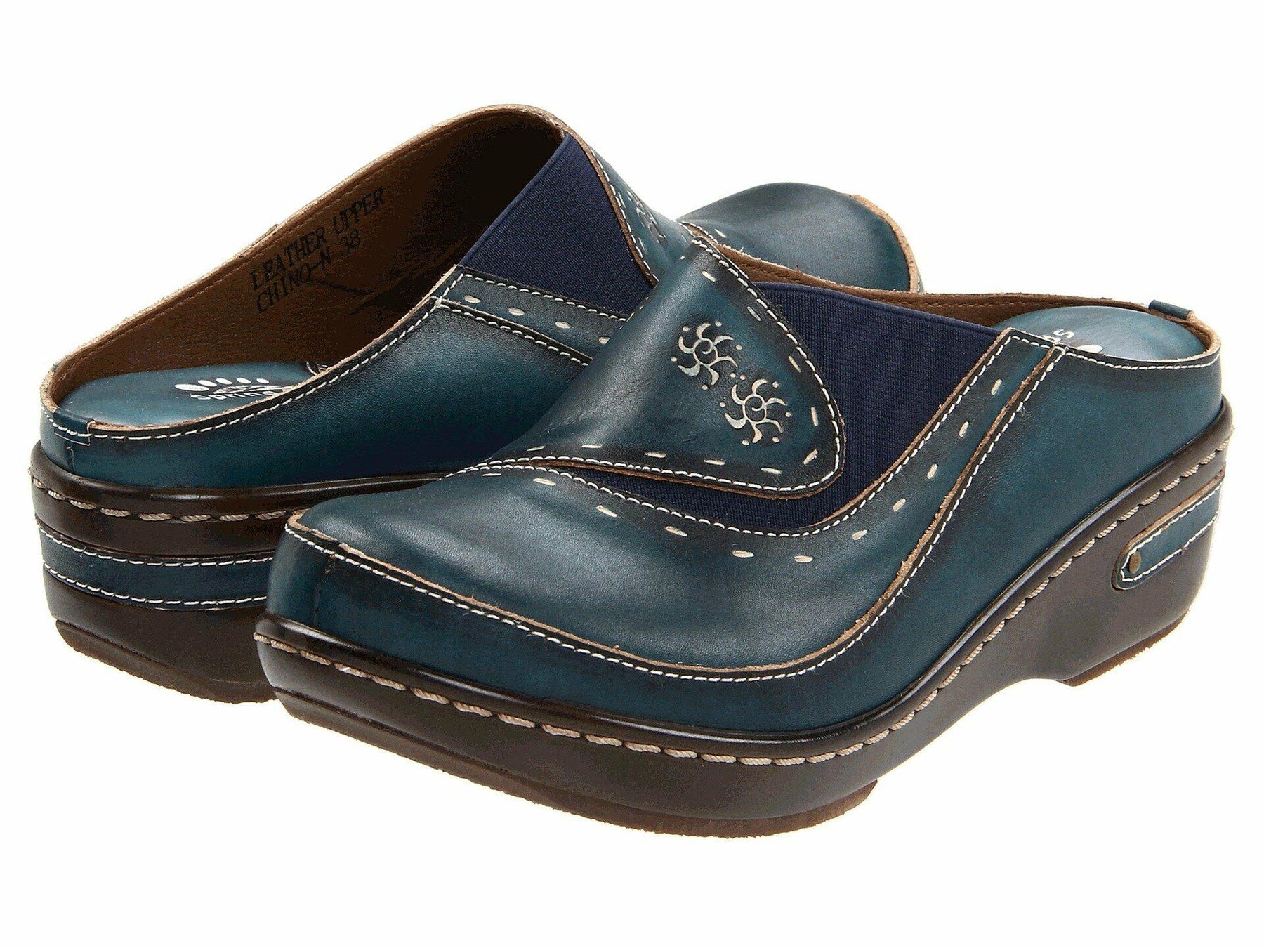 L'Artiste Style: Chino Hand painted, open-back, leather clog with elastic piecing and contrast embossed design. Heel Height (approximately): 2" Features: -Round toe, hand painted leather, elastic side inlay, contrast stitch detail, leather pieced heel. -Synthetic leather lining. -Synthetic leather and textile padded insole. -PU outsole and Rubber sole. -Imported. Disclaimer: L’Artiste products are made with natural tanned leather using traditional hand painting techniques. This unique finishing process is used to create a natural effect with color variations to deliver authentic look and beauty.