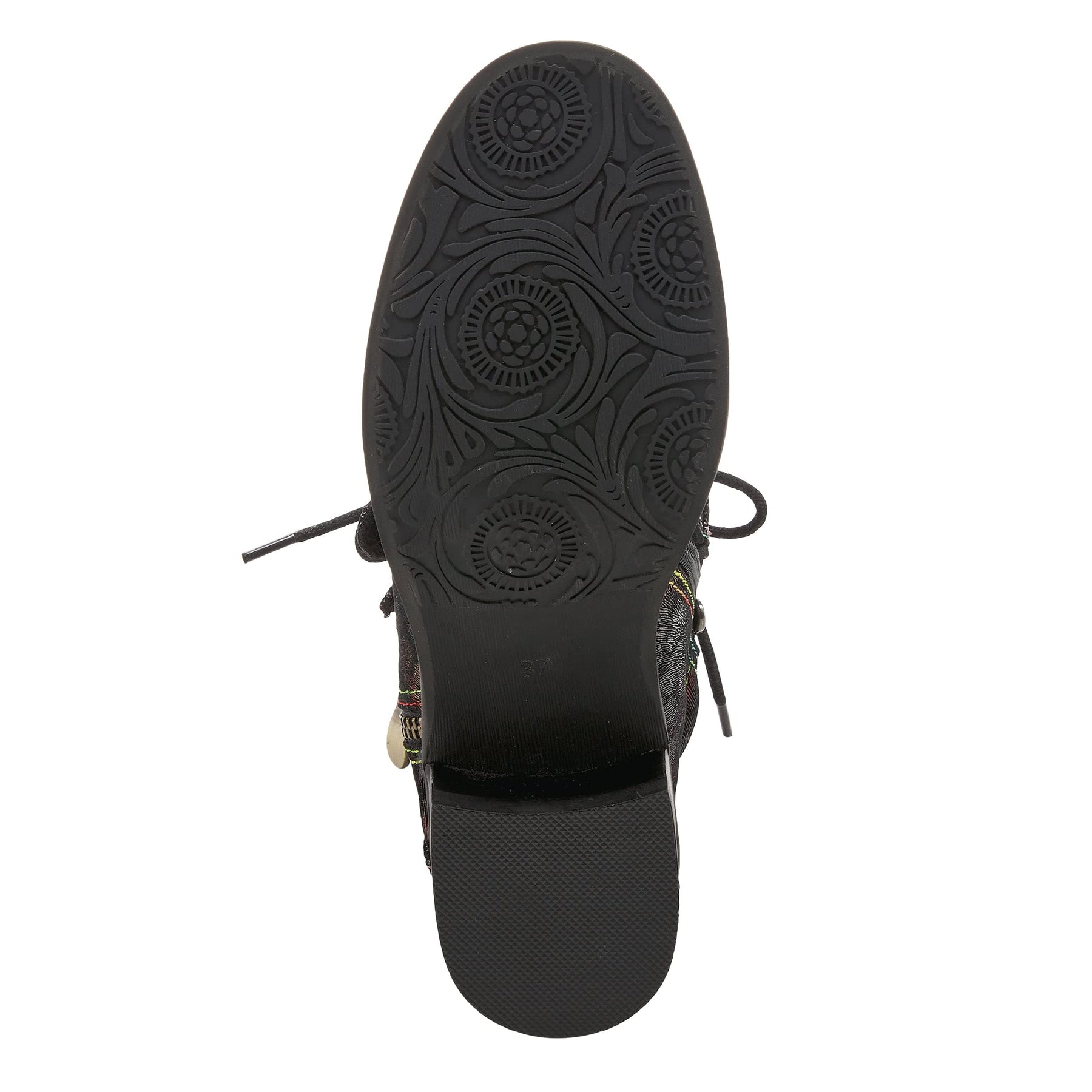L'Artiste Style: Chrissy Metallic printed suede and colorful rainbow microfiber, sit upon a gold studded welt, with inside functional and outside decorative zipped adjustable lace up bootie. Hook and loop dual straps embellished with pearl cabochons and antique brass spots, padded back collar and tongue with paisley soft velvety lining. Heel Height (approximately): 1 1/2" stacked Shaft Height (approximately): 5 ½" Circumference (approximately): 8 3/4"- 10" Features: -Round toe, studded welt and hook and loop straps, outside decorative zipper, leather stacked heel. -Signature rainbow stitched details -Inside zipper closure. -Soft paisley printed textile lining. -Synthetic leather padded insole, back collar and tongue. -Printed embossed rubber outsole. -Imported. Disclaimer: L'Artiste products are made with natural tanned leather using traditional hand painting techniques. This unique finishing process is used to create a natural effect with color variations to deliver authentic look and beauty.