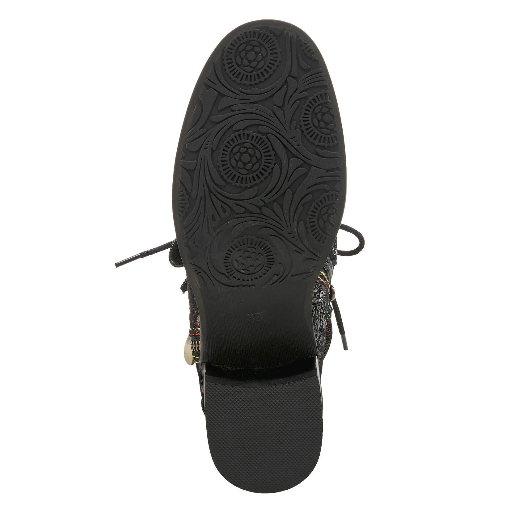 L'Artiste Style: Chrissy Metallic printed suede and colorful rainbow microfiber, sit upon a gold studded welt, with inside functional and outside decorative zipped adjustable lace up bootie. Hook and loop dual straps embellished with pearl cabochons and antique brass spots, padded back collar and tongue with paisley soft velvety lining. Heel Height (approximately): 1 1/2" stacked Shaft Height (approximately): 5 " Circumference (approximately): 8 3/4"- 10" Features: -Round toe, studded welt and hook and loop straps, outside decorative zipper, leather stacked heel. -Signature rainbow stitched details -Inside zipper closure. -Soft paisley printed textile lining. -Synthetic leather padded insole, back collar and tongue. -Printed embossed rubber outsole. -Imported. Disclaimer: L'Artiste products are made with natural tanned leather using traditional hand painting techniques. This unique finishing process is used to create a natural effect with color variations to deliver authentic look and beauty.
