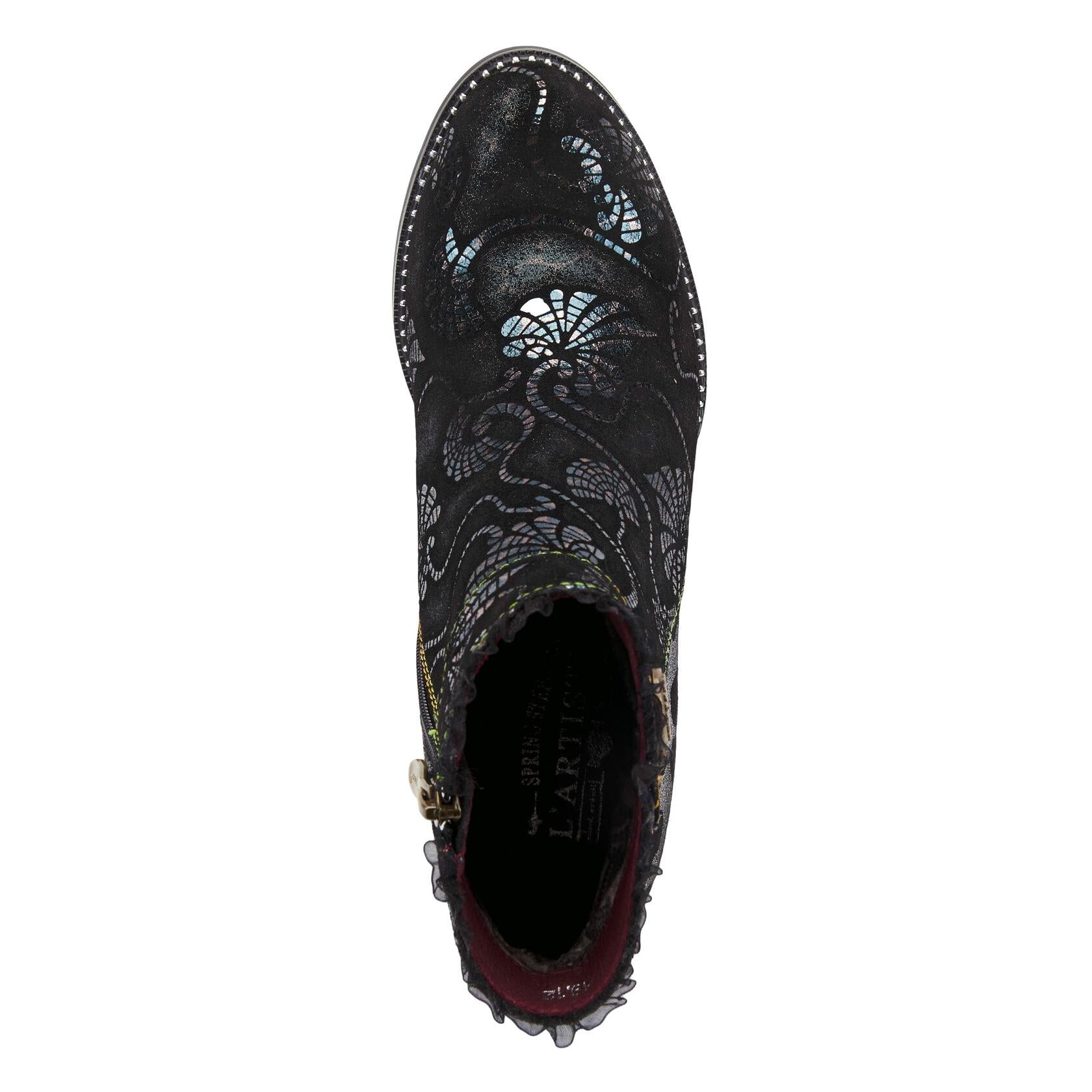 L'Artiste Style: Dessa Step out in style and comfort in the perfect bootie for all day and into the night pleasure. Contrasting metallic printed suede kaleidoscope swirls meet colored animal print textile. Taffeta ruffle edged collar, studded welt sole and an inlay animal print stacked cone heel add to the allure. With her softly padded footbed and inside easy on off zipper, Dessa will surely become your favorite go-to style all season long. Attributes: - Heel Height: 2 3/4" - Platform Height: 3/8" - Upper: Micro suede, Suede - Lining: Textile, Velvet, Synthetic Leather, Printed - Insole: Synthetic Leather - Outsole: Rubber - Boot Shaft: 4 1/2" - Boot Circum.: 10" - Closure: Zipper - Features: Comfort, Padded Insole, Premium, Textured Imported Disclaimer: L’Artiste products are made with natural tanned leather using traditional hand painting techniques. This unique finishing process is used to create a natural effect with color variations to deliver authentic look and beauty.