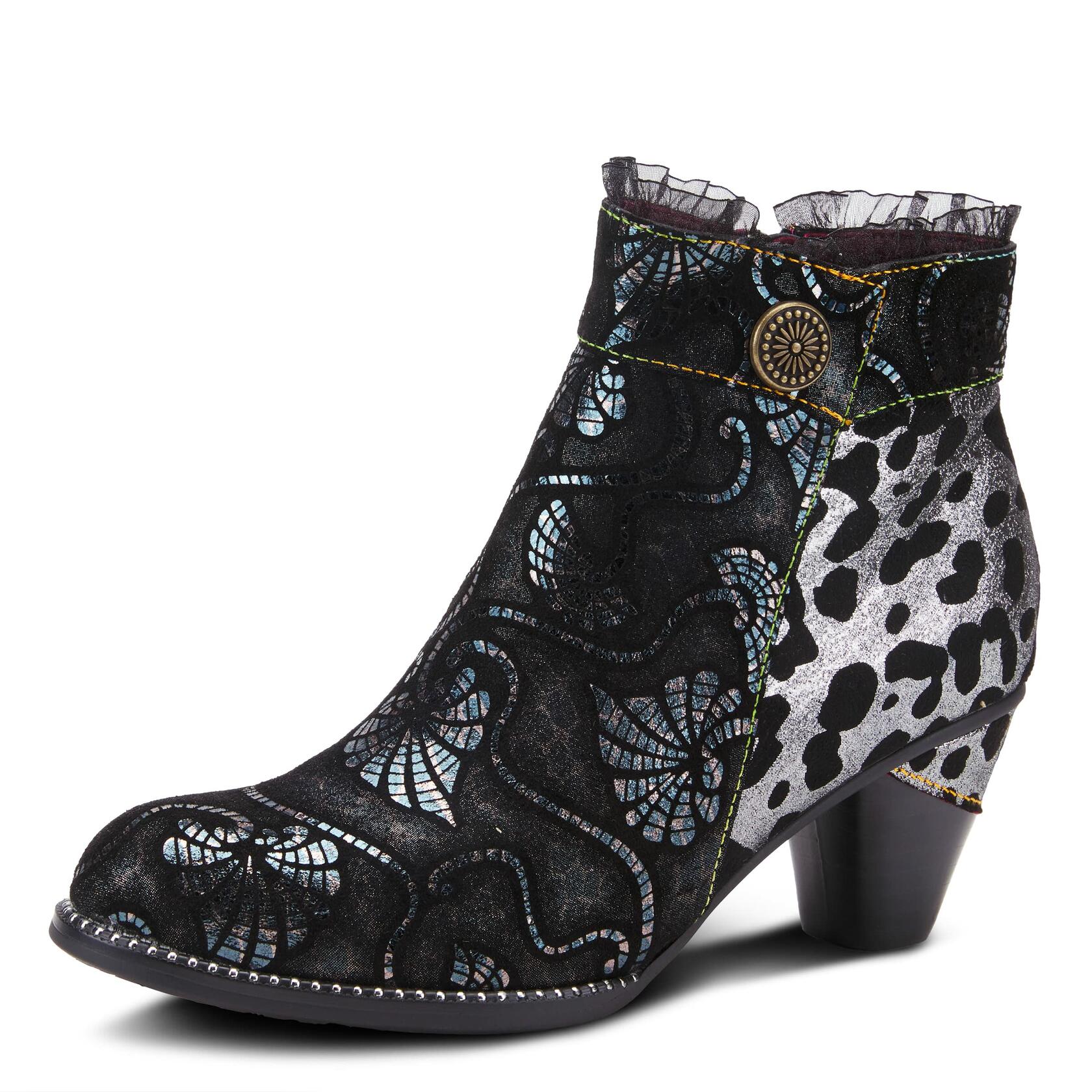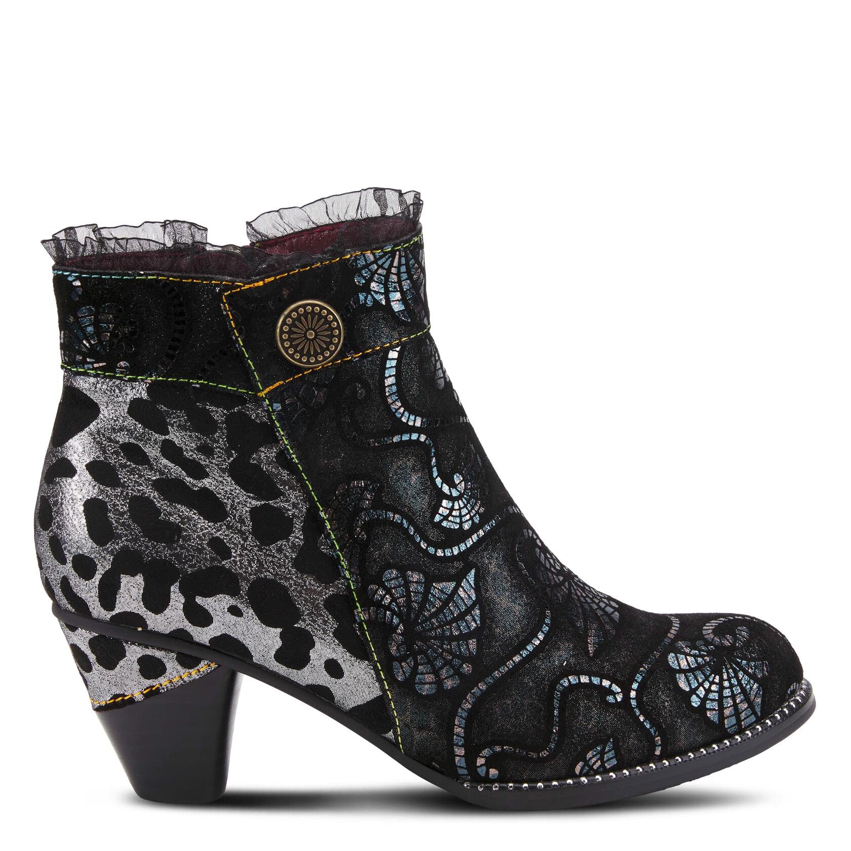 *Textured leather and suede upper with kaleidoscope swirl and animal print designs and button detail *Ruffle-edged taffeta collar *Zipper closure *Padded footbed *Rubber outsole *2-3/4" stacked cone heel *Please see size drop-down menu for brand-specific Euro conversion chart