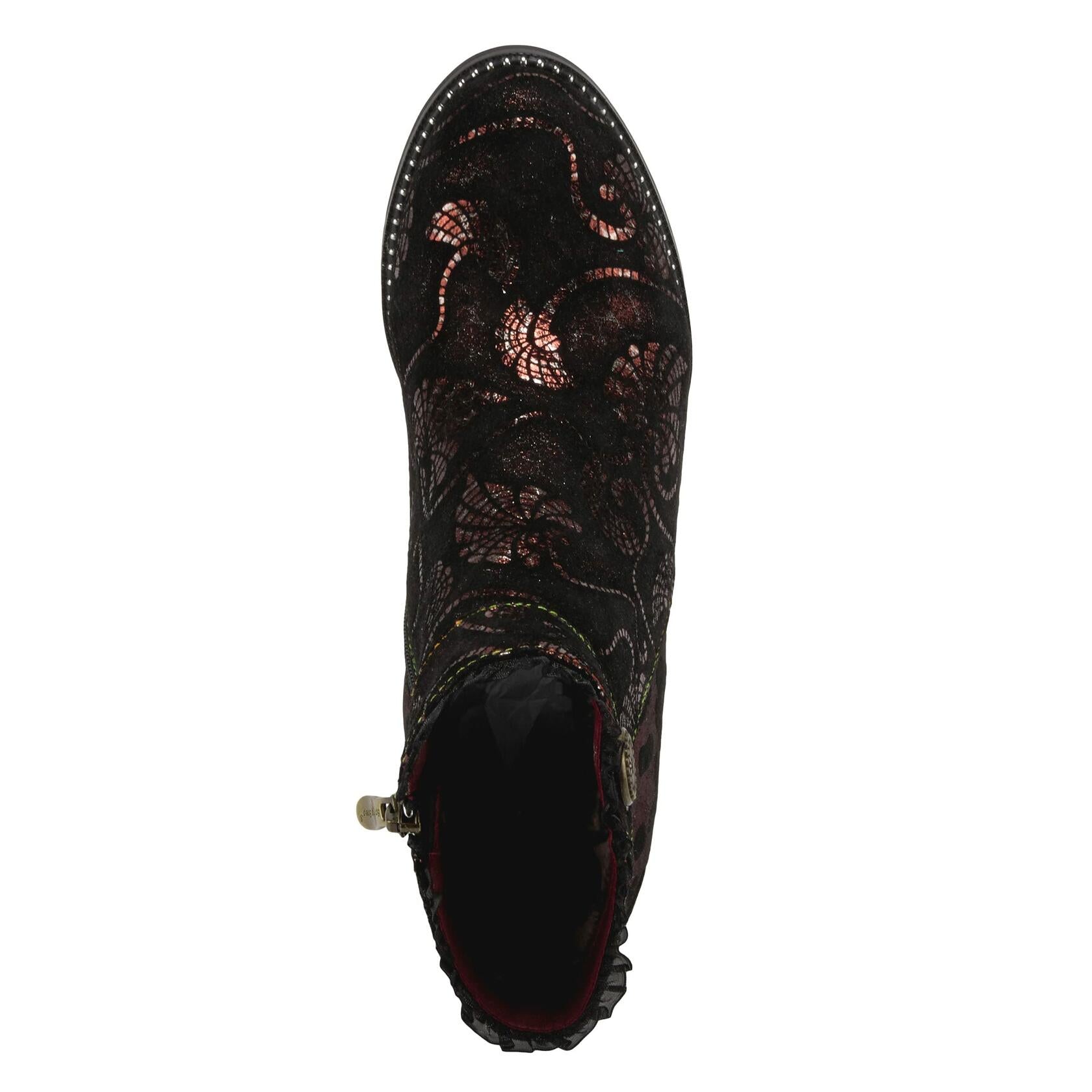 Go back in time with the L'Artiste by Spring Step Dessa Ankle Bootie. This gorgeous hand-painted bootie is adorned with kaleidoscope swirls and a taffeta ruffle edged collar that add a classic touch.