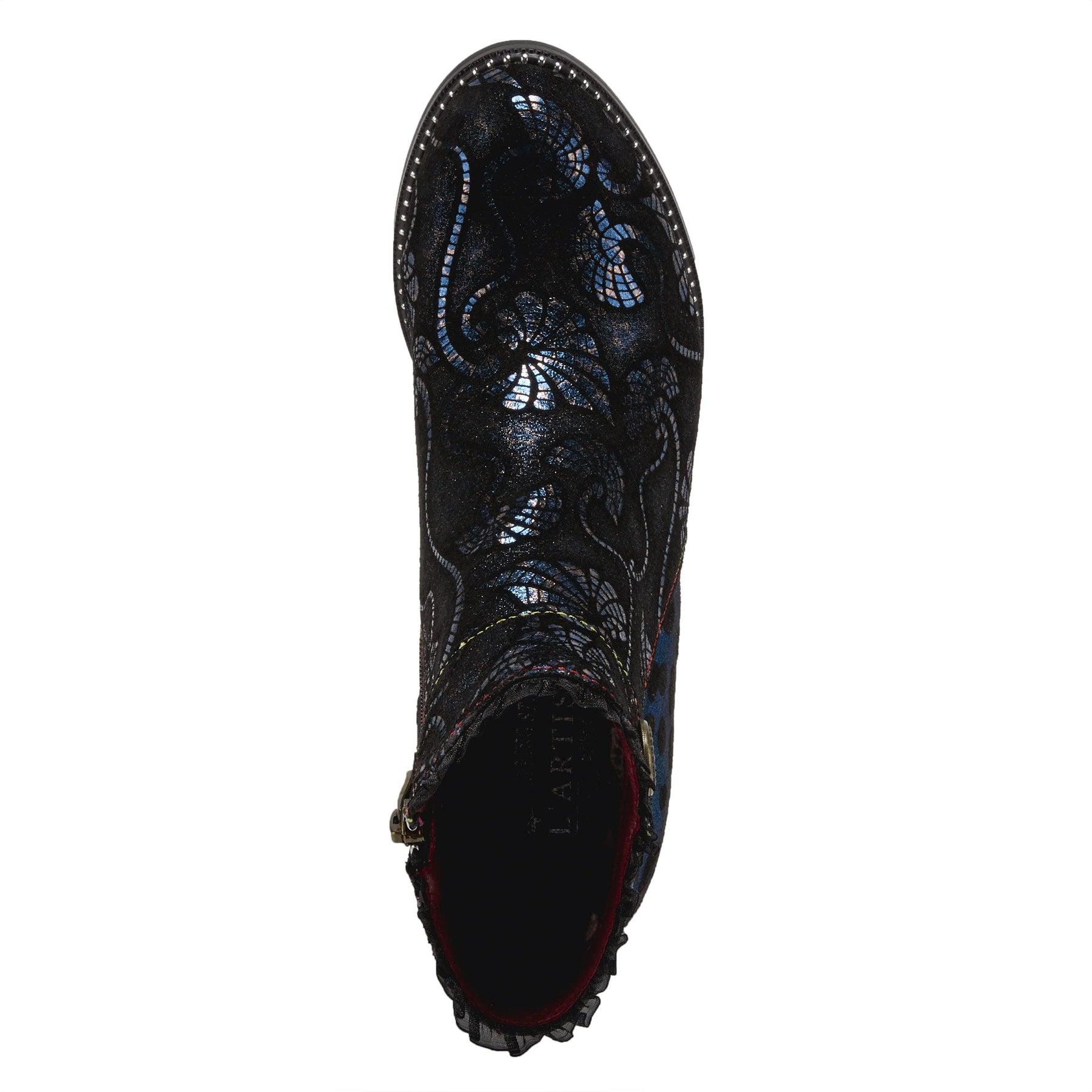 L'Artiste Style: Dessa Step out in style and comfort in the perfect bootie for all day and into the night pleasure. Contrasting metallic printed suede kaleidoscope swirls meet colored animal print textile. Taffeta ruffle edged collar, studded welt sole and an inlay animal print stacked cone heel add to the allure. With her softly padded footbed and inside easy on off zipper, Dessa will surely become your favorite go-to style all season long. Attributes: - Heel Height: 2 3/4" - Platform Height: 3/8" - Upper: Micro suede, Suede - Lining: Textile, Velvet, Synthetic Leather, Printed - Insole: Synthetic Leather - Outsole: Rubber - Boot Shaft: 4 1/2" - Boot Circum.: 10" - Closure: Zipper - Features: Comfort, Padded Insole, Premium, Textured Imported Disclaimer: L’Artiste products are made with natural tanned leather using traditional hand painting techniques. This unique finishing process is used to create a natural effect with color variations to deliver authentic look and beauty.