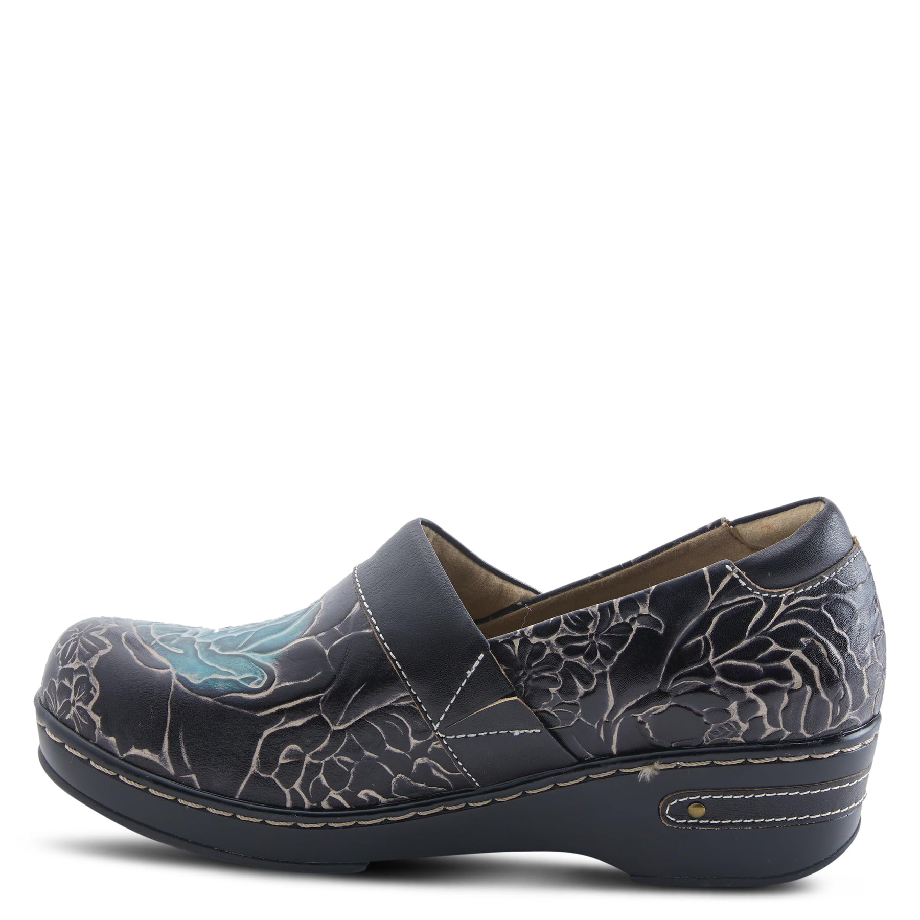 L`Artiste Style: Elkayjay Premium hand selected embossed leathers featuring hand painted rose design in soft but striking contrast colors. Inside stretch "V" gore for easy slip-on convenience and so much soft interior padding you'll forget you're wearing shoes! Upper: Leather Lining: Synthetic Insole: Synthetic Outsole: Polyurethane Closure: Slip-on Heel Height: 1 3/4" Platform Height: 3/4" Features: - Arch Support, Comfort, Elastic, Padded Insole Disclaimer: L'Artiste products are made with natural tanned leather using traditional hand painting techniques. This unique finishing process is used to create a natural effect with color variations to deliver authentic look and beauty.