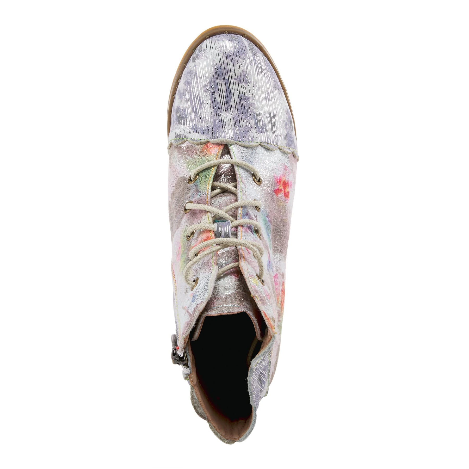 L'Artiste Style: ENLIGHTEN Scallop edged adjustable lace up inside zipped bootie with contrasting metallic and floral leathers on a studded welt with a comfortable albeit stack like heel. Features: -