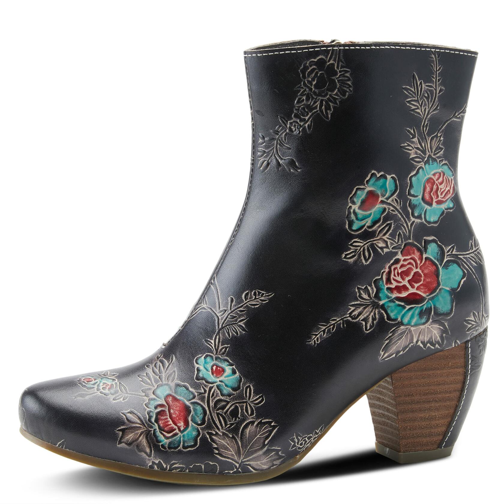 L`Artiste Style: Folka Premium genuine leather boots with embossed multi color floral details, an inside zipper for easy on and off on a stacked curvy heel with leather piece on the back. Upper: Leather Lining: Synthetic, Textile Insole: Synthetic Outsole: Rubber Closure: Zipper Heel Height: 2 3/4" Platform Height: 1/4" Shaft Height: 8 " Circumference: 9 1/2" Features: - Hand-painted, Padded Insole Disclaimer: L'Artiste products are made with natural tanned leather using traditional hand painting techniques. This unique finishing process is used to create a natural effect with color variations to deliver authentic look and beauty.