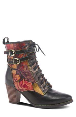 Hand-painted leather, dainty straps and signature stitching bring modern-chic styling to this stack-heeled bootie with a flexible rubber sole. Leather upper/synthetic lining/rubber sole Imported