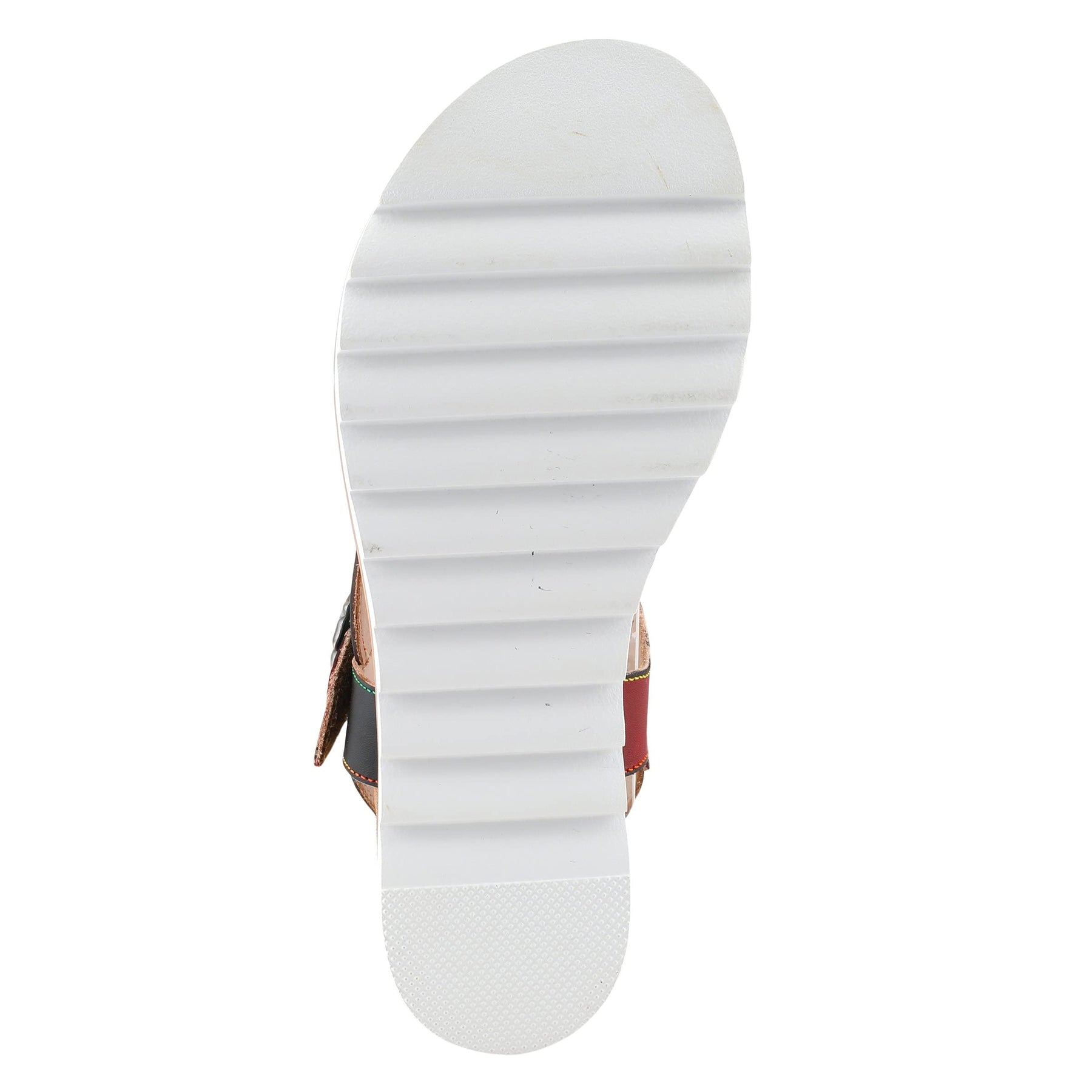 L'Artiste Style: IRVETTA 2-tone ombre carved flatform sawtooth soled bottom with a super padded footbed featuring asymmetrical multicolored carved leaves and decorative antiqued buckle on a hook&loop strap. Upper: Leather Lining: Synthetic Insole: Synthetic Outsole: EVA Closure: Hook&Loop Heel Height: 3" Platform Height: 1 1/2" Features: - Comfort, Footbed, Hand-painted, Padded Insole, Premium Disclaimer: LArtiste products are made with natural tanned leather using traditional hand painting techniques. This unique finishing process is used to create a natural effect with color variations to deliver authentic look and beauty.