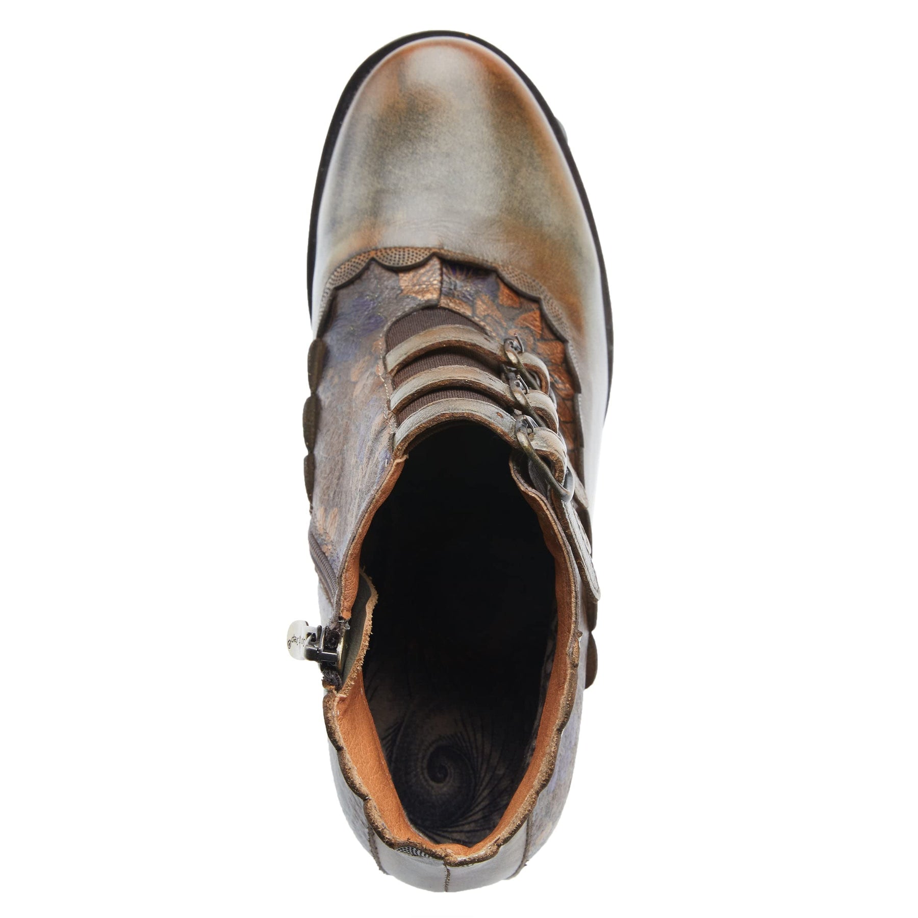 L`Artiste Style: Iwantit French inspired leather bootie with rich flower design and scalloped edges featuring elastic central piece covered with 3 adjustable straps for better fit. Upper: Leather Lining: Velvet Insole: Synthetic Outsole: Rubber Closure: Buckle, Zipper Heel Height: 2 1/2" Platform Height: 3/8" Shaft Height: 6 " Circumference: 9 3/4" Features: - Adjustable, Elastic, Padded Insole, Premium Disclaimer: L'Artiste products are made with natural tanned leather using traditional hand painting techniques. This unique finishing process is used to create a natural effect with color variations to deliver authentic look and beauty.