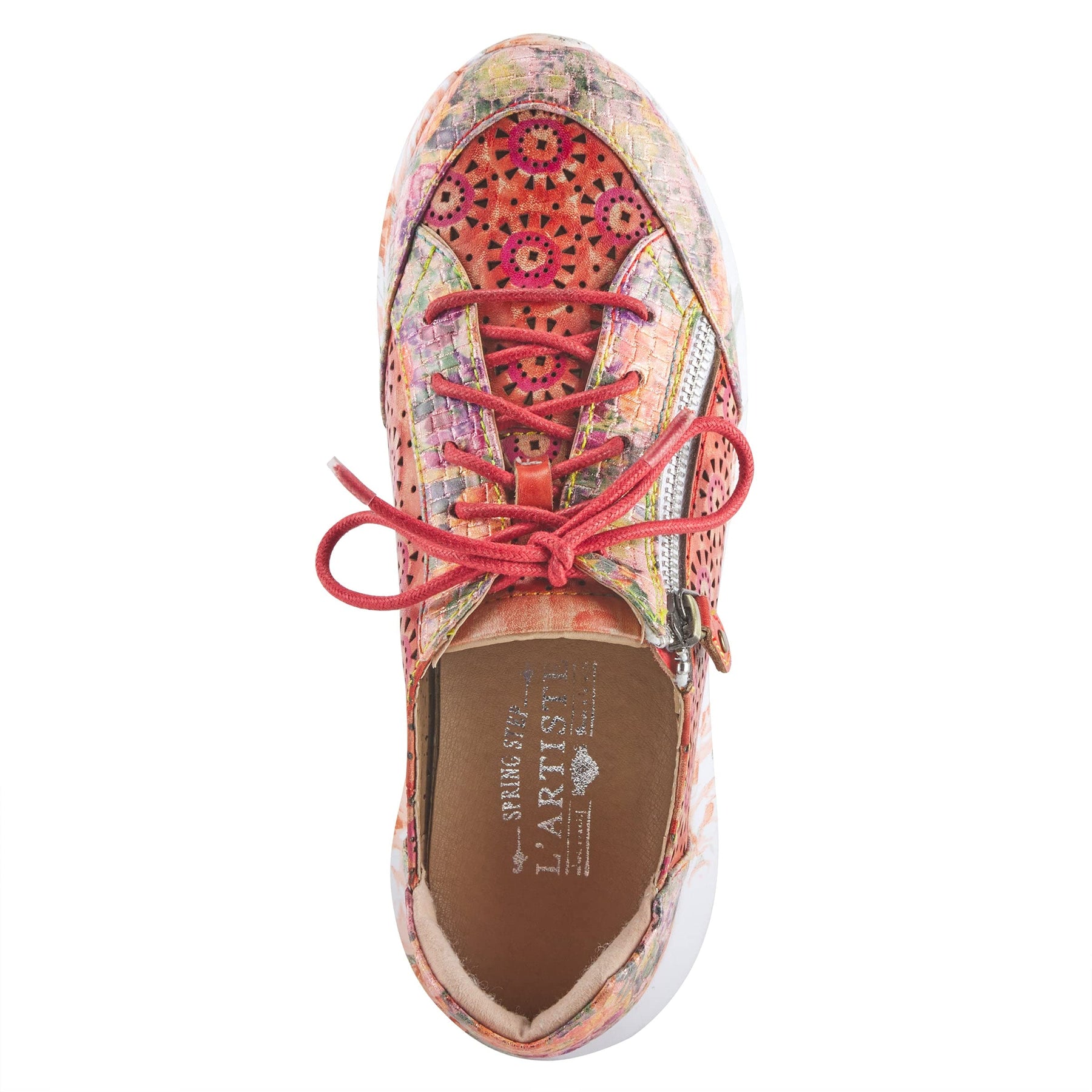 L'Artiste Style: JAZZIE A lightweight sneaker that will put a spring in your step. This sneaker style casual has leather laser circle cutouts, lace up straps and a beautiful faux leather metallic pattern that matches a fun floral print on the outsole. The gentle wedge slope offers not only a lift but the ultimate in all day comfort Upper: Genuine and man-made leather combination. Lining: Synthetic Insole: Synthetic Outsole: Rubber Closure: Lace-up Heel Height: 1.25" Wedge Height: 3/4" Features: - Adjustable, Comfort, Hand-painted, Removable Insole Disclaimer: L'Artiste products are made with natural tanned leather using traditional hand painting techniques. This unique finishing process is used to create a natural effect with color variations to deliver authentic look and beauty.